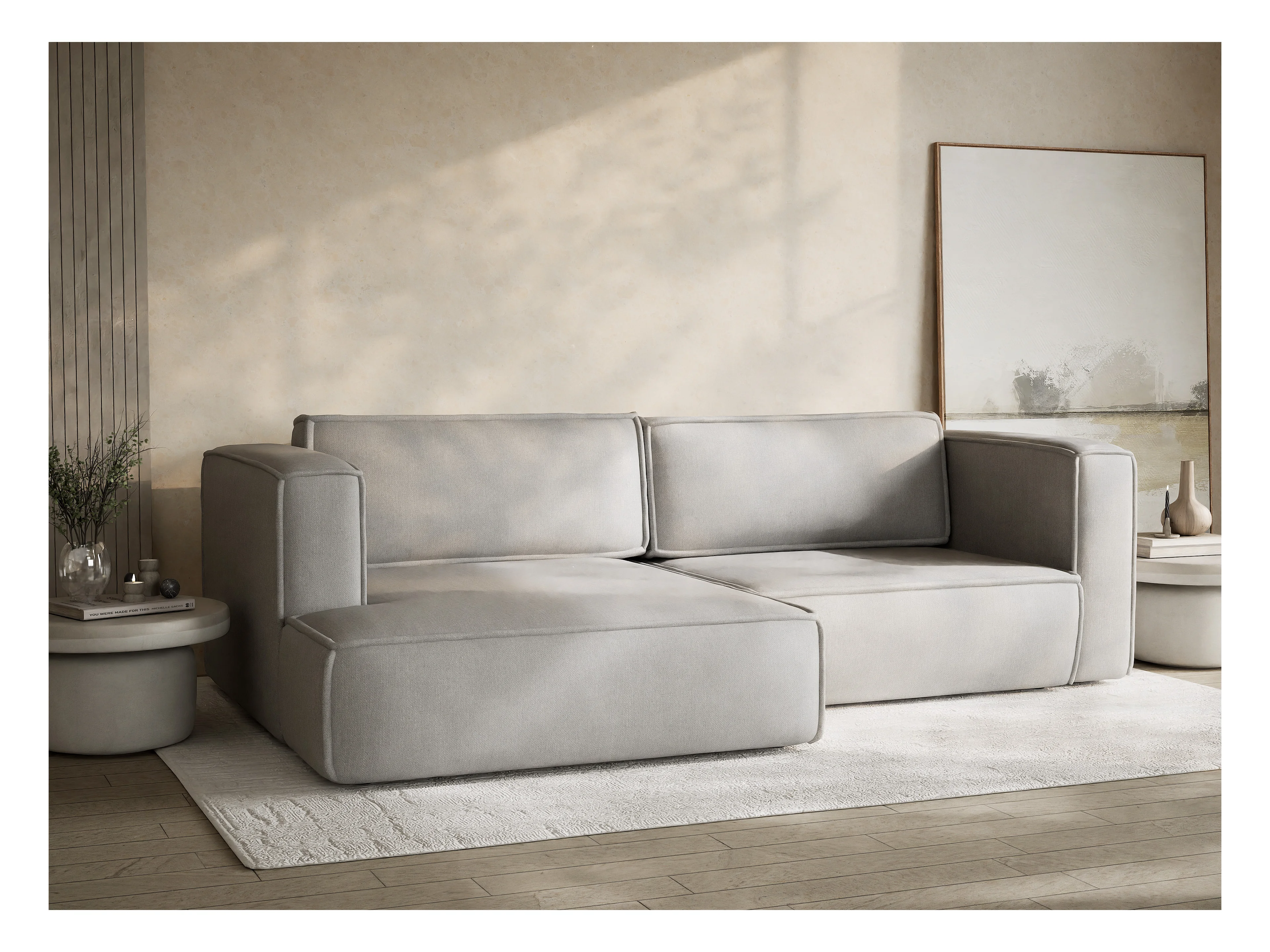 Canapé d'angle gauche avec fonction lit en tissu tressé beige gris VELTO