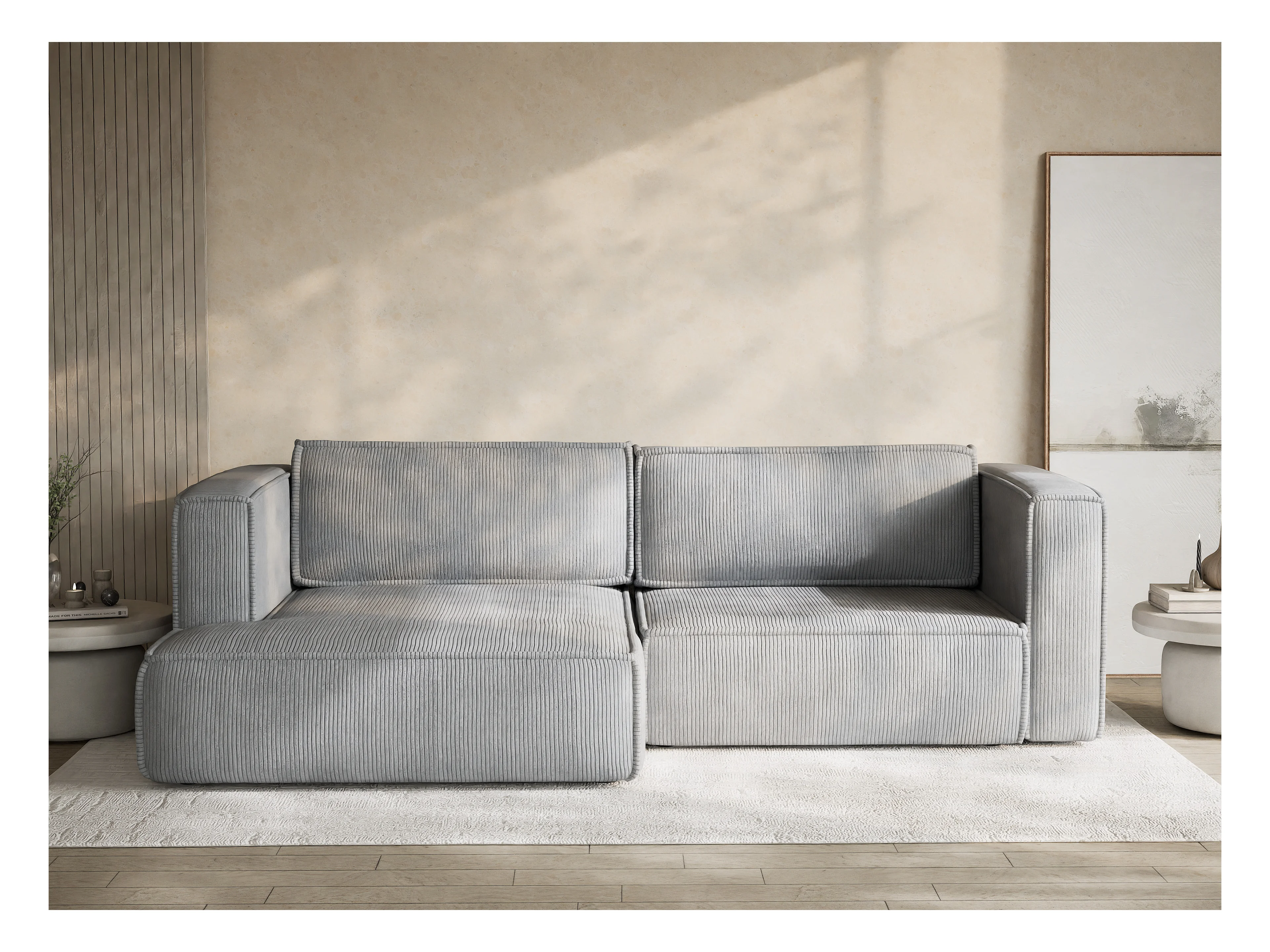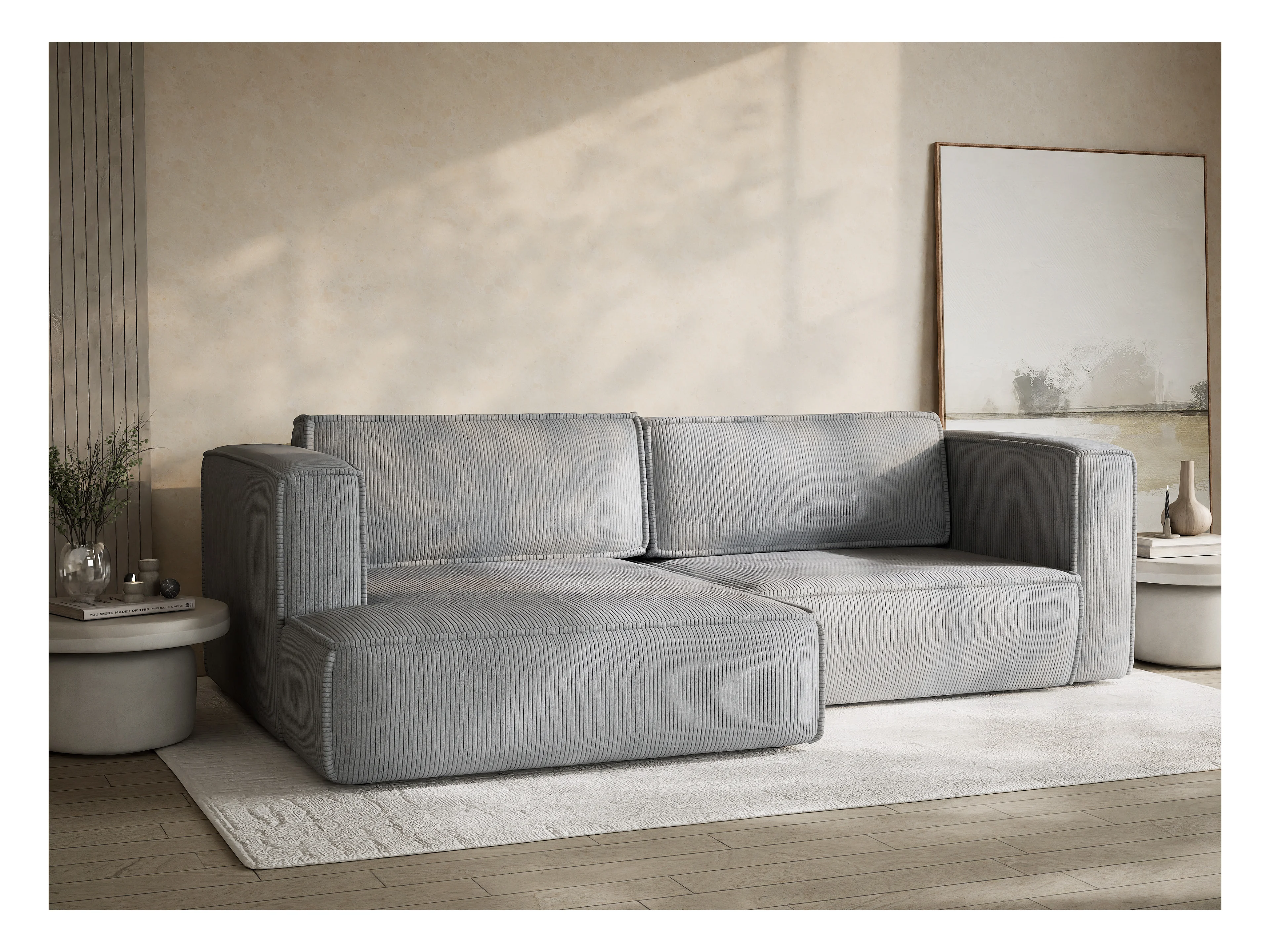 Canapé d'angle gauche avec fonction lit en velours gris clair VELTO