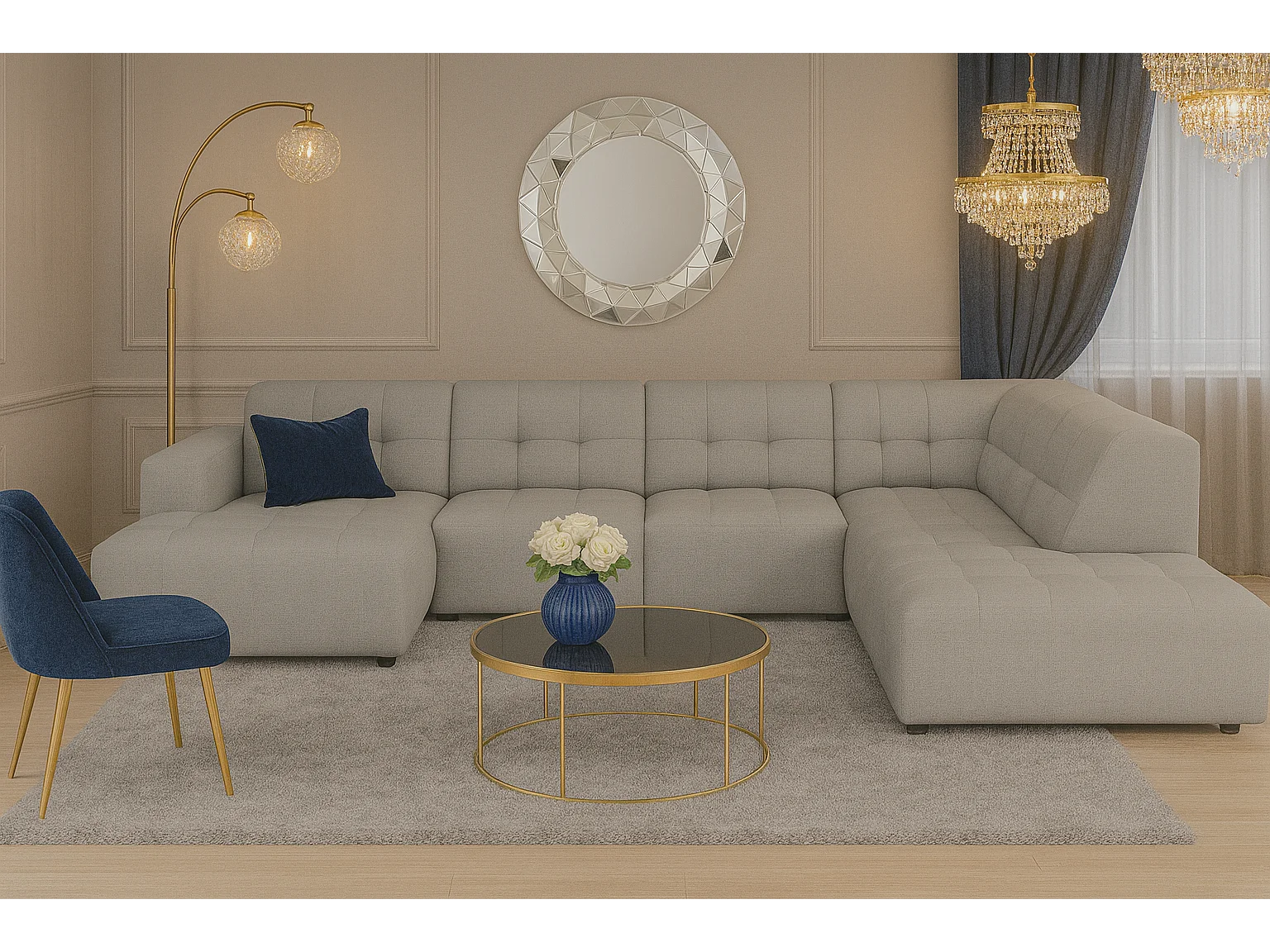 Canapé d’angle gauche avec pouf Bergamo C– tissu Raven 7 gris, 364×262×70 cm