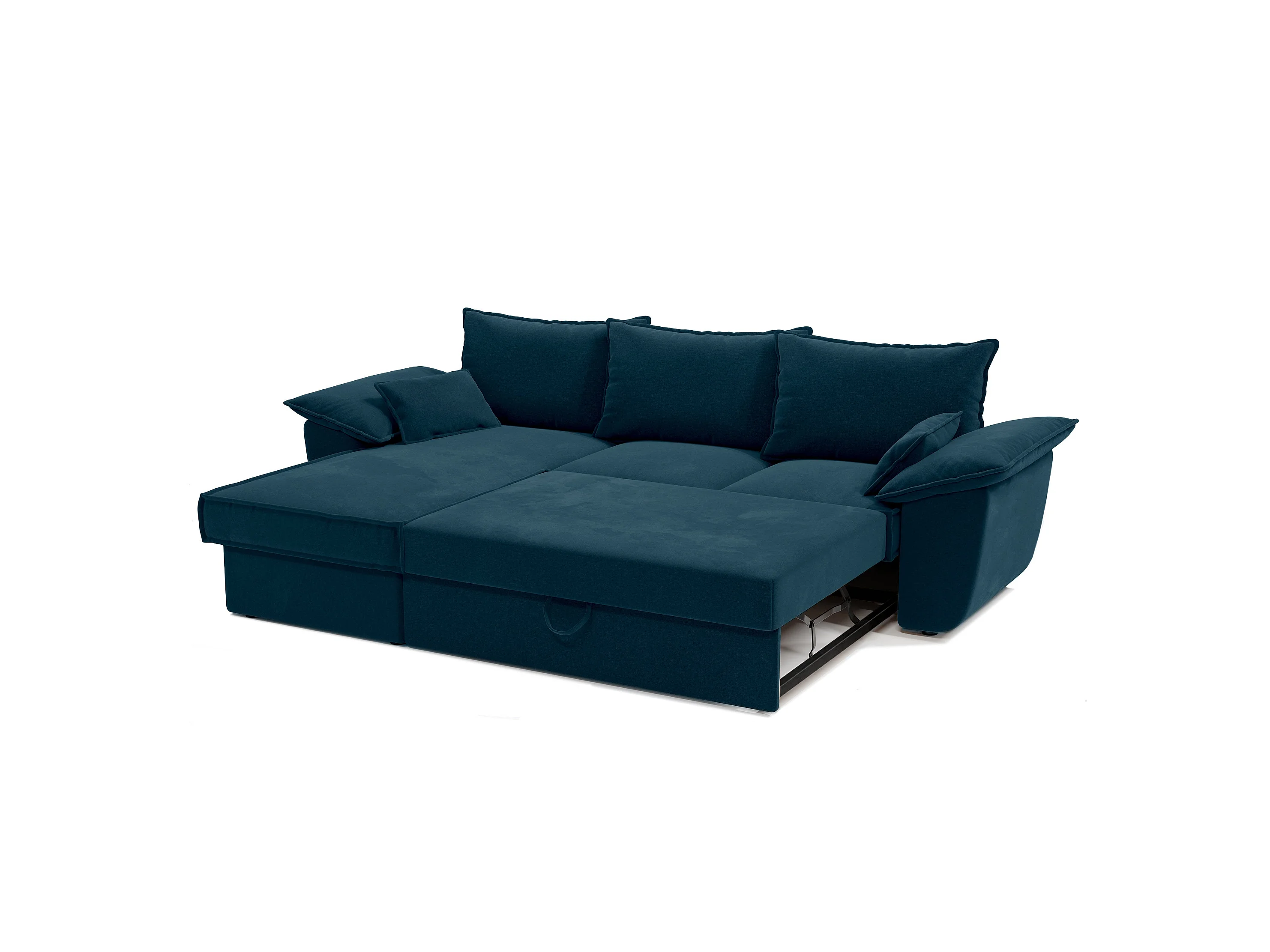 Canapé d'angle gauche coffre convertible velours bleu paon 257cm SASHA