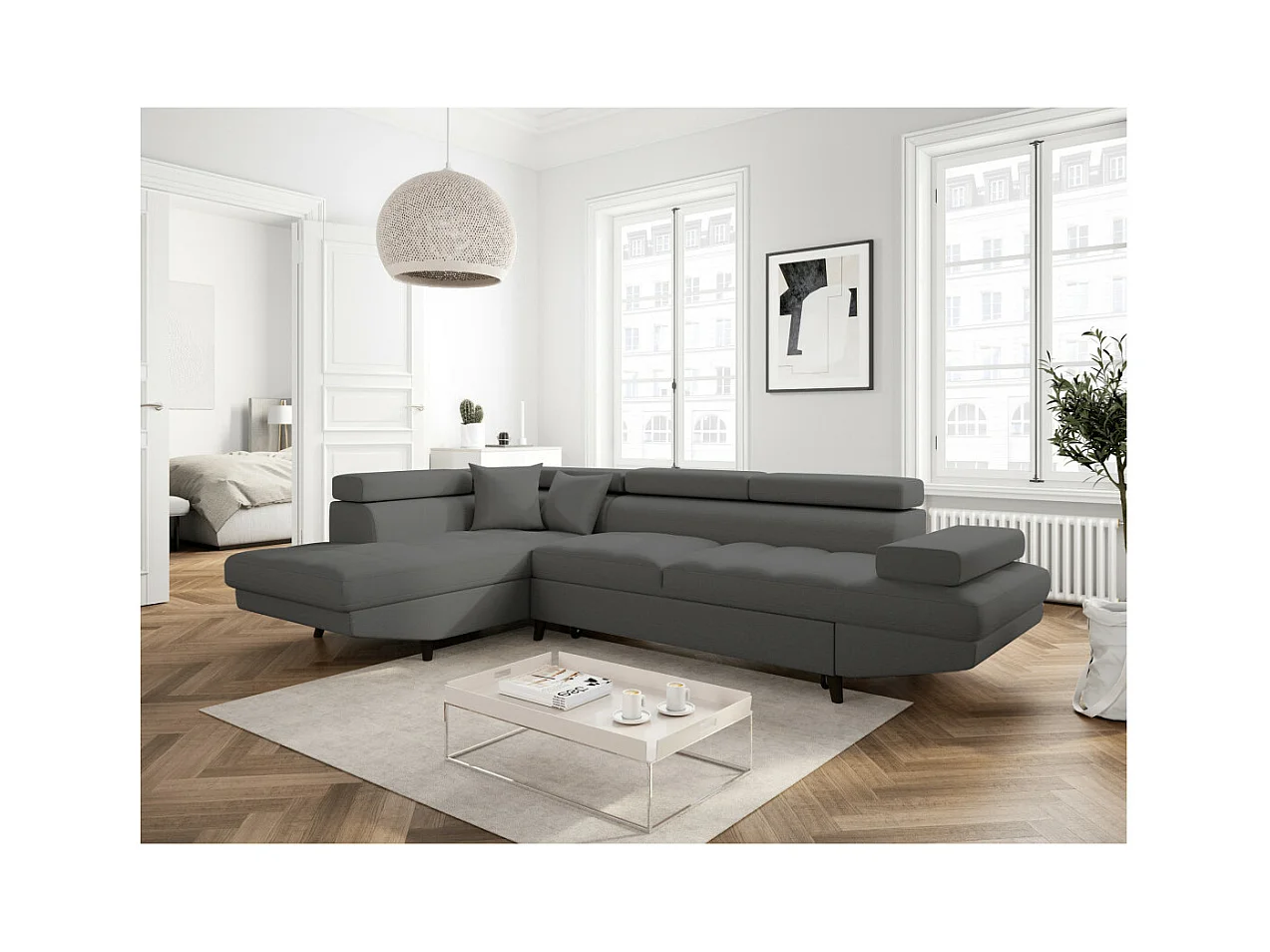 Canapé d'angle gauche convertible Rio Scandinave avec coffre en tissu - Gris anthracite, Pieds noir - L271 x P192 x H70cm - Loungitude
