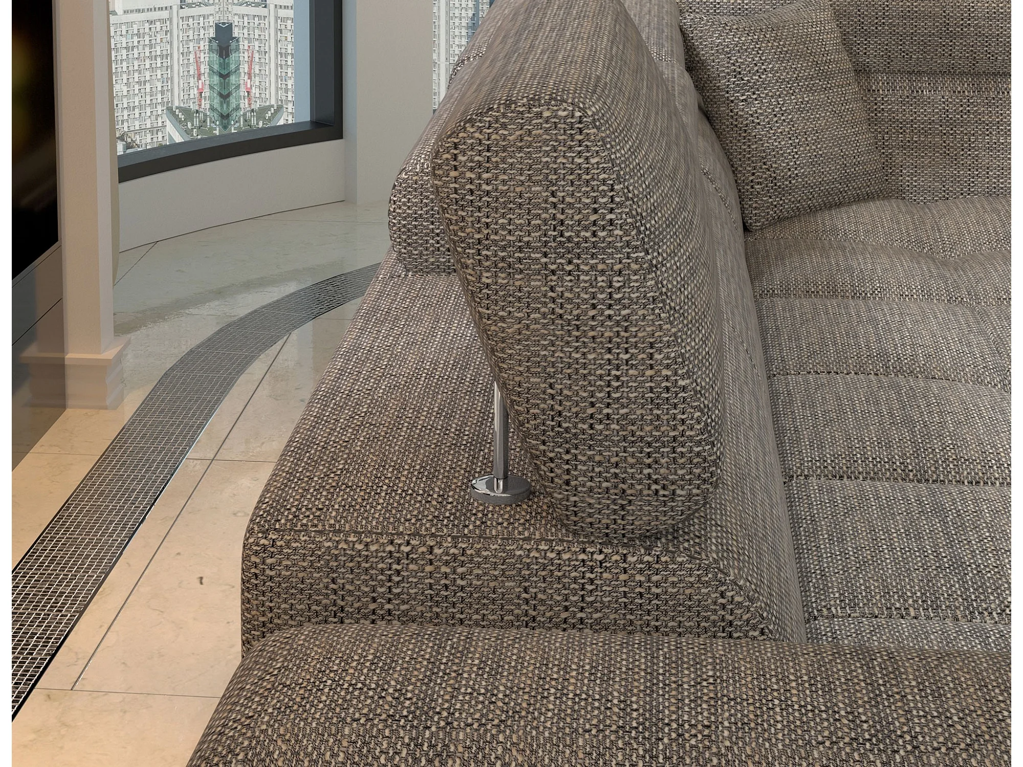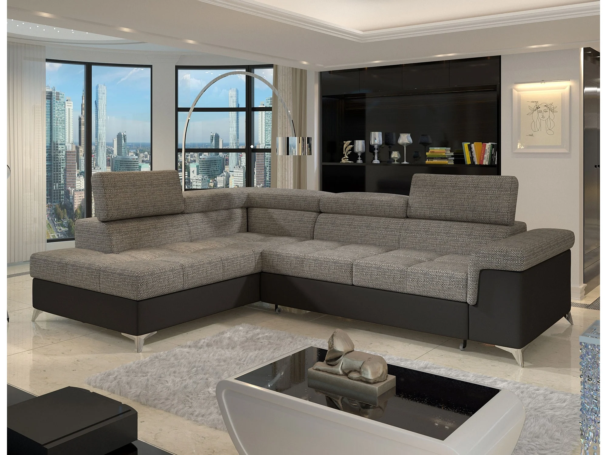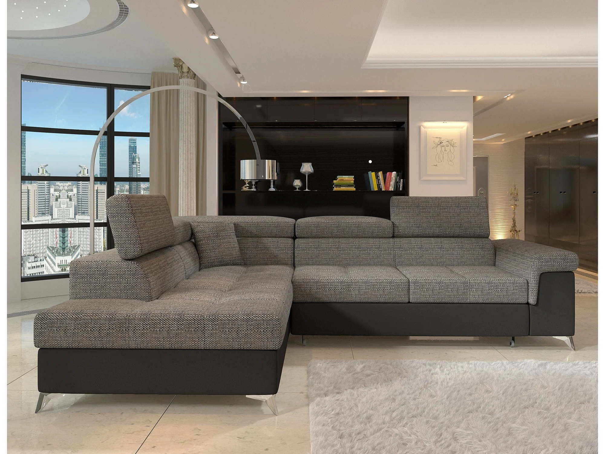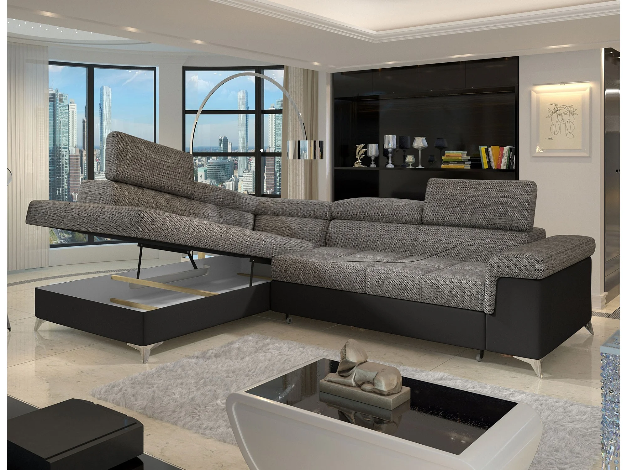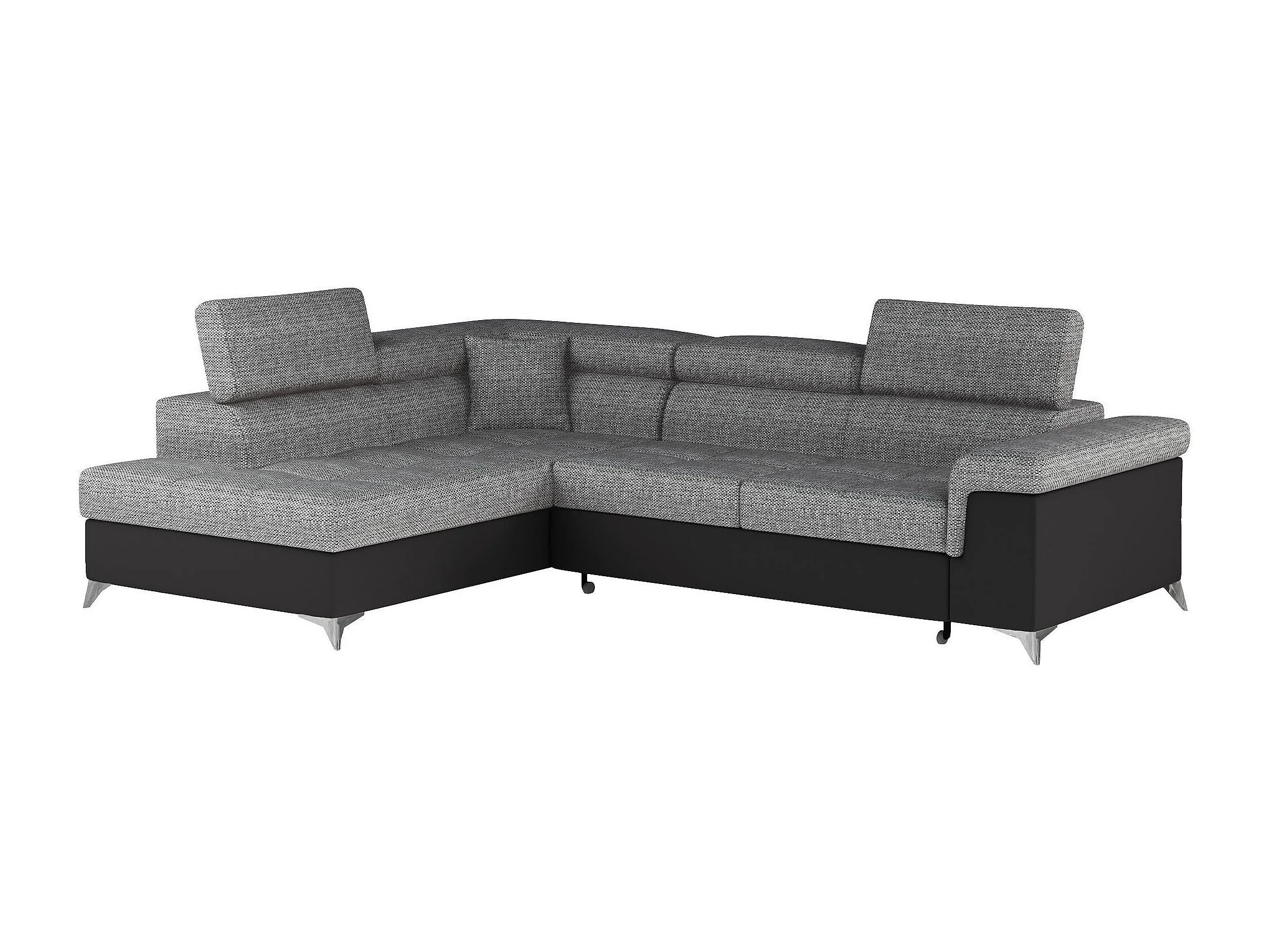 Canapé d'angle convertible Bi matière MARIDO - Coffre et appuis-tête réglables-Noir/Gris chiné-angle gauche