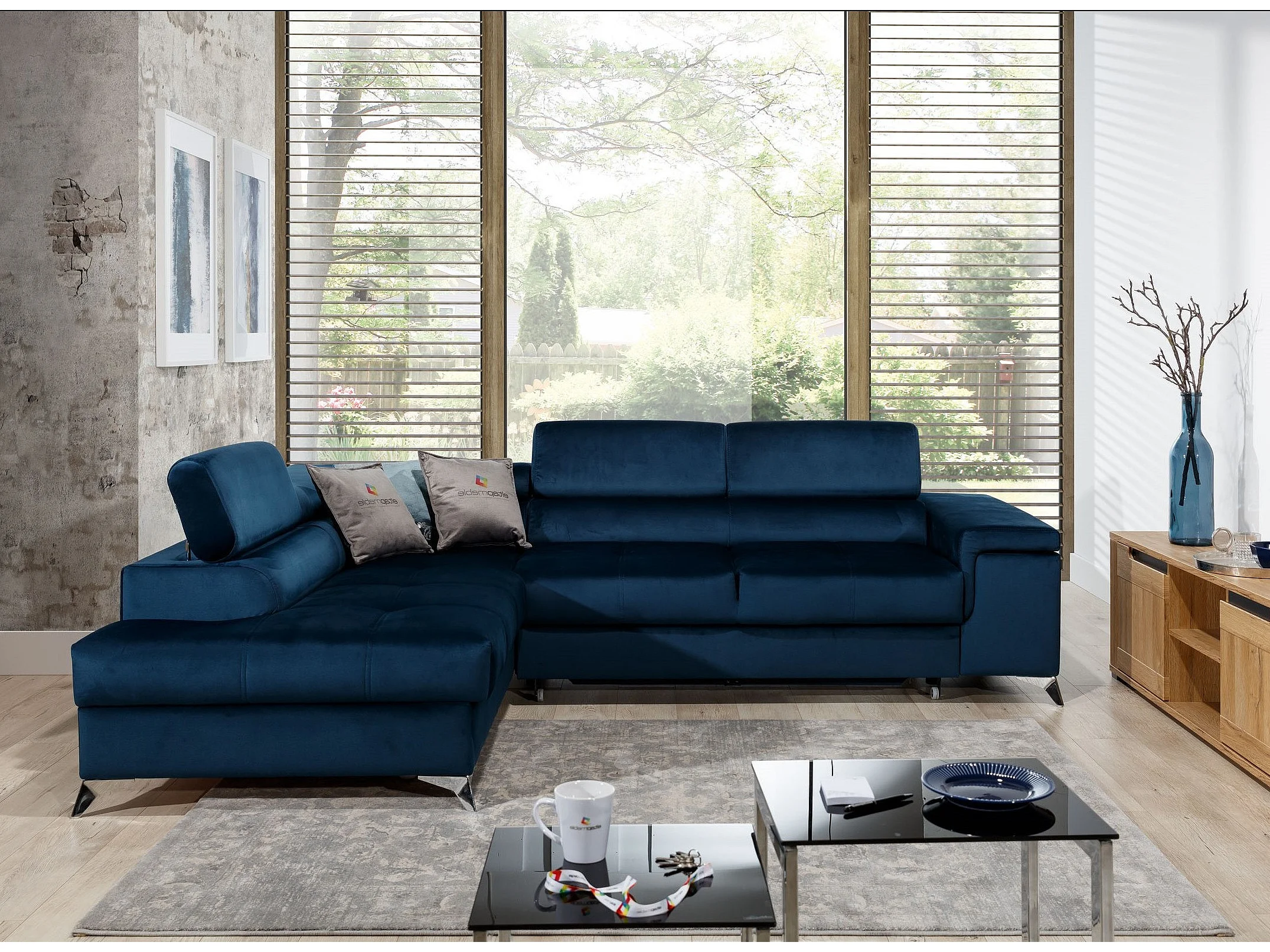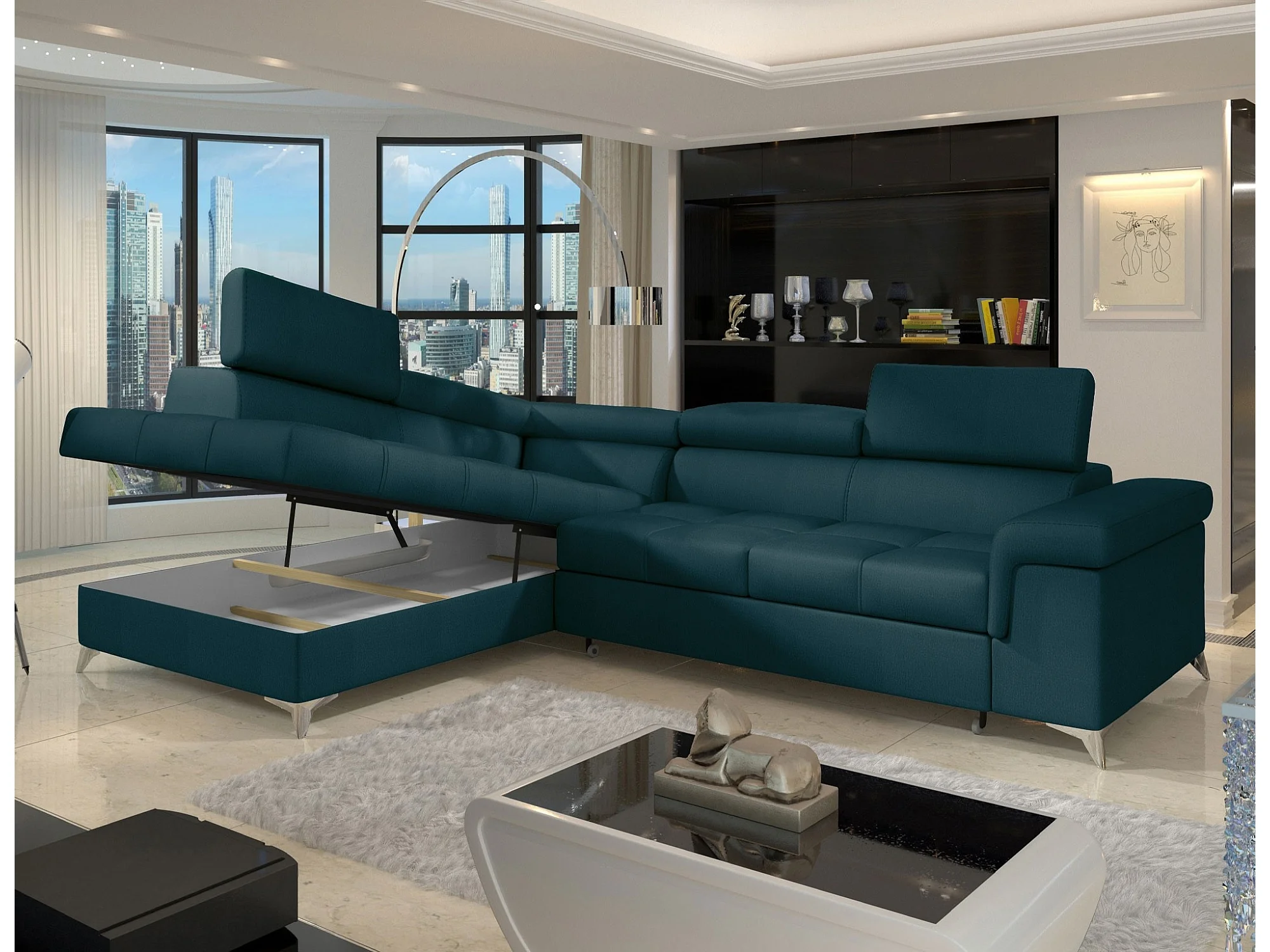 Canapé d'angle convertible velours MARIDO - Coffre et appuis-tête réglables-Bleu foncé-angle gauche