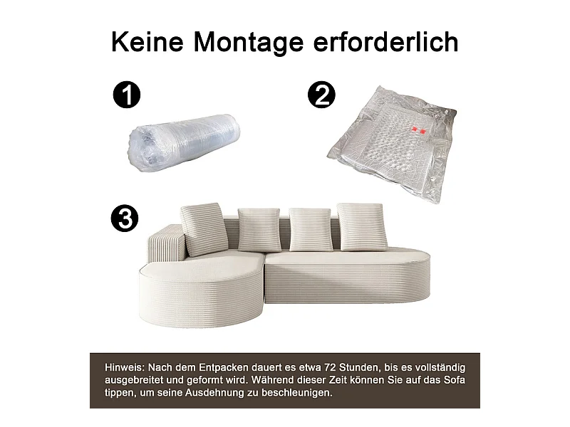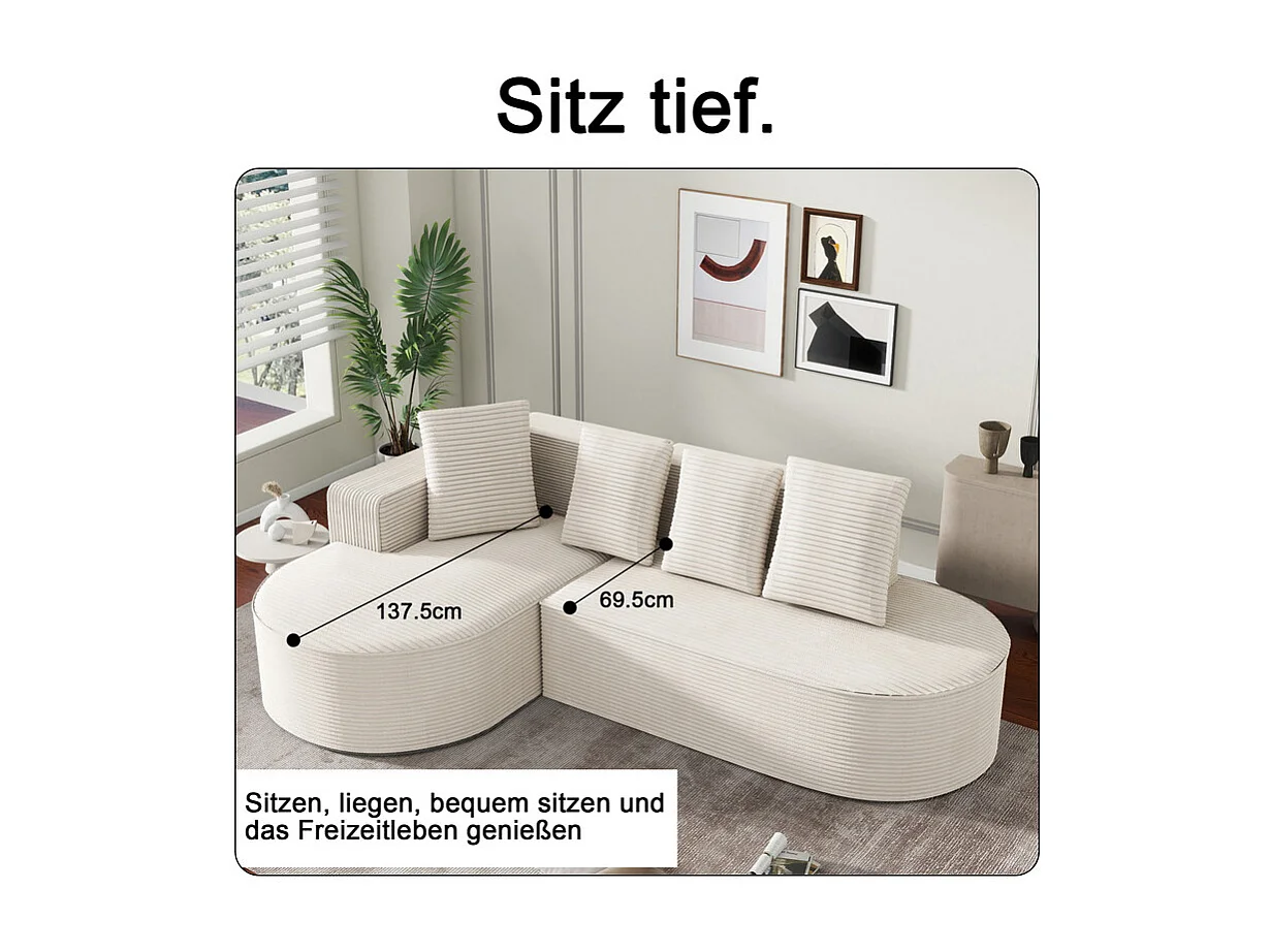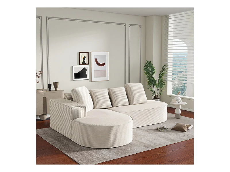 Canapé d'angle gauche en Velours Côtelé grosses côtes avec 4 oreillers - 265x67x40,5cm - Blanc