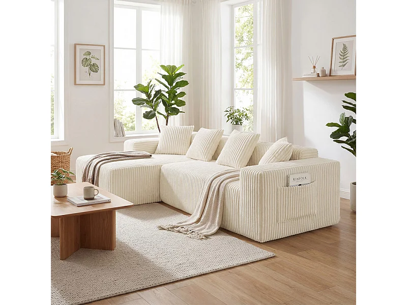 Canapé d'angle gauche modulable - en Velours côtelé Beige - 3 Places - avec 4 Coussins et méridienne - 261x156x80cm