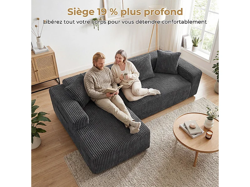 Canapé d'angle gauche modulable - en Velours côtelé Gris - 3 Places - avec 4 Coussins et méridienne - 261x156x80cm