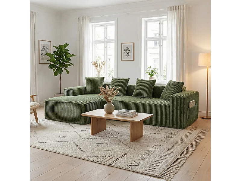 Canapé d'angle gauche modulable - en Velours côtelé Vert - 3 Places - avec 4 Coussins et méridienne - 261x156x80cm