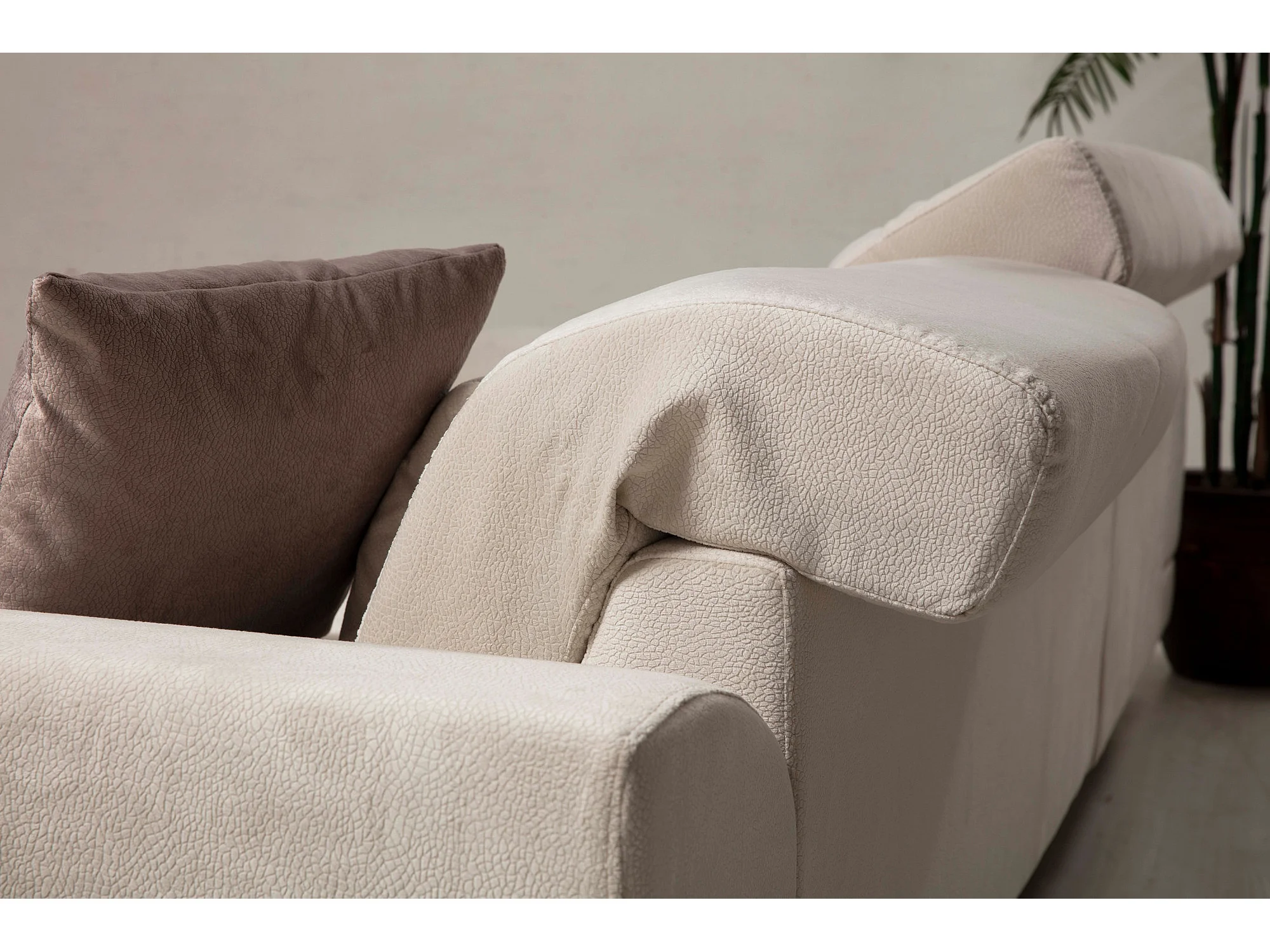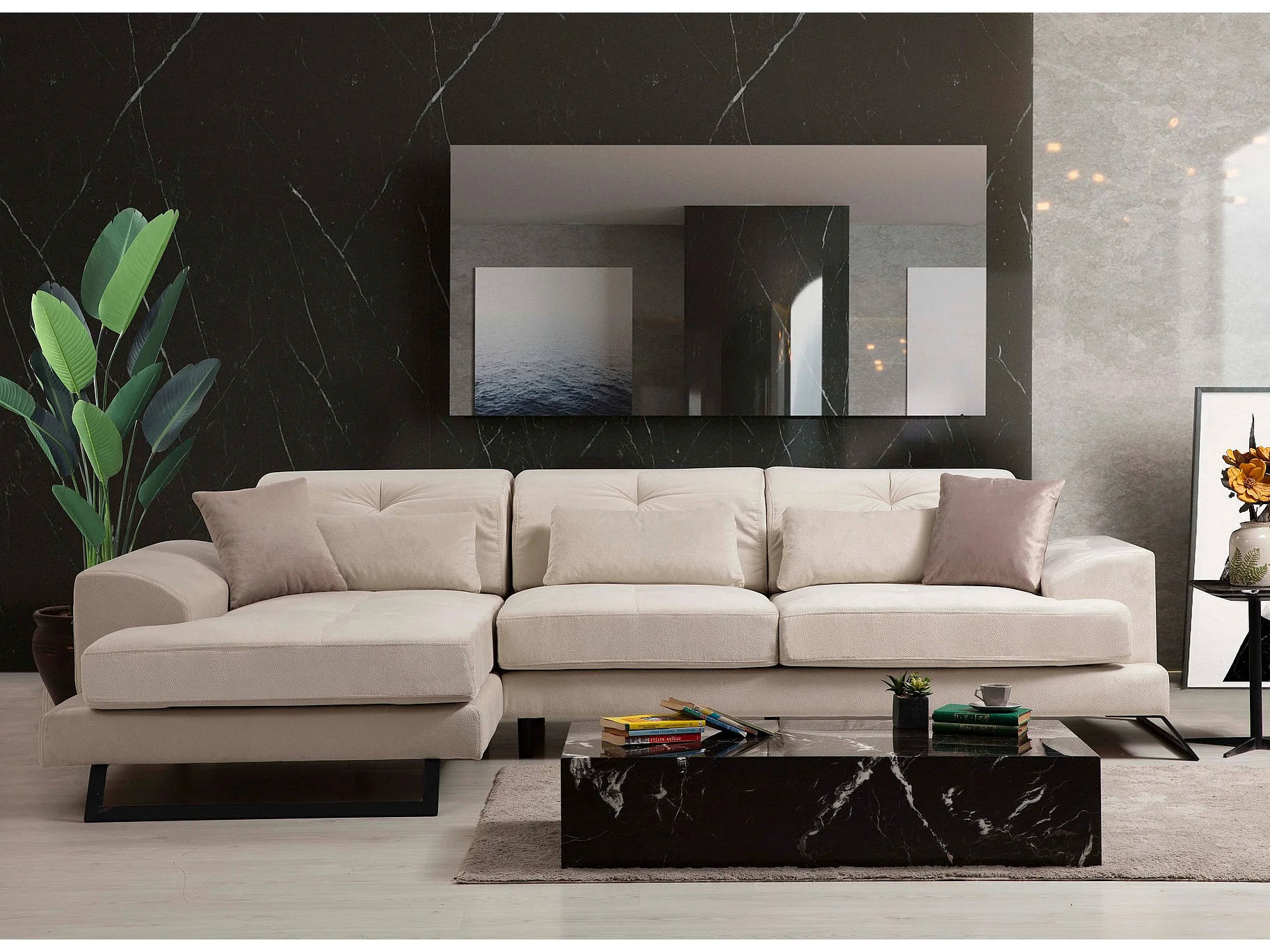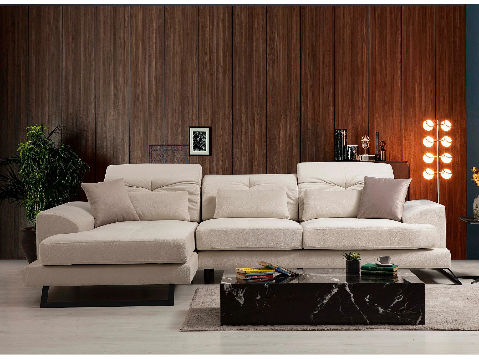 Canapé d'angle gauche velours beige clair têtières relevables pieds metal noir Briko 308cm