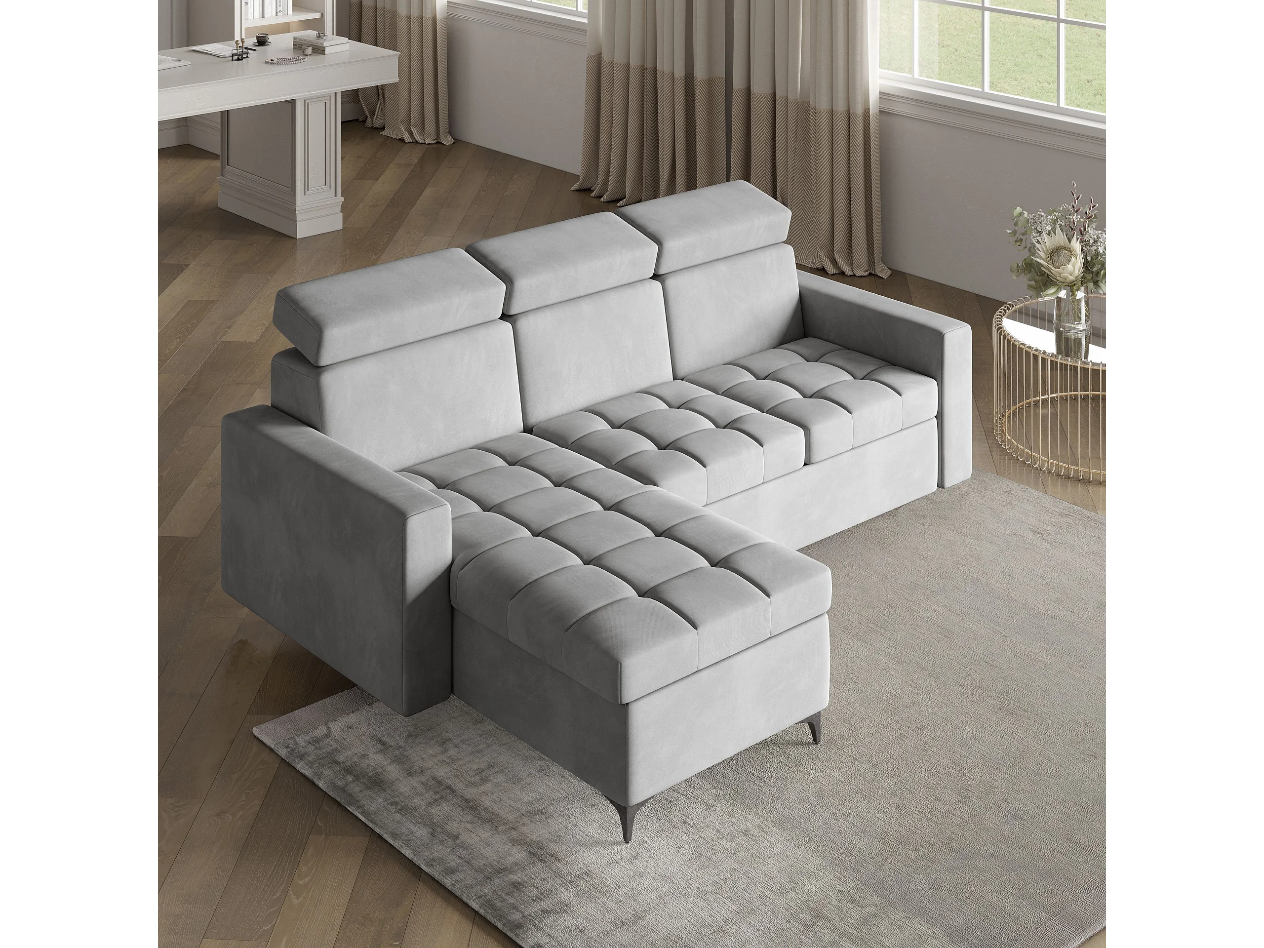 Canapé d'angle KAME Gris clair en peluche avec fonction de couchage