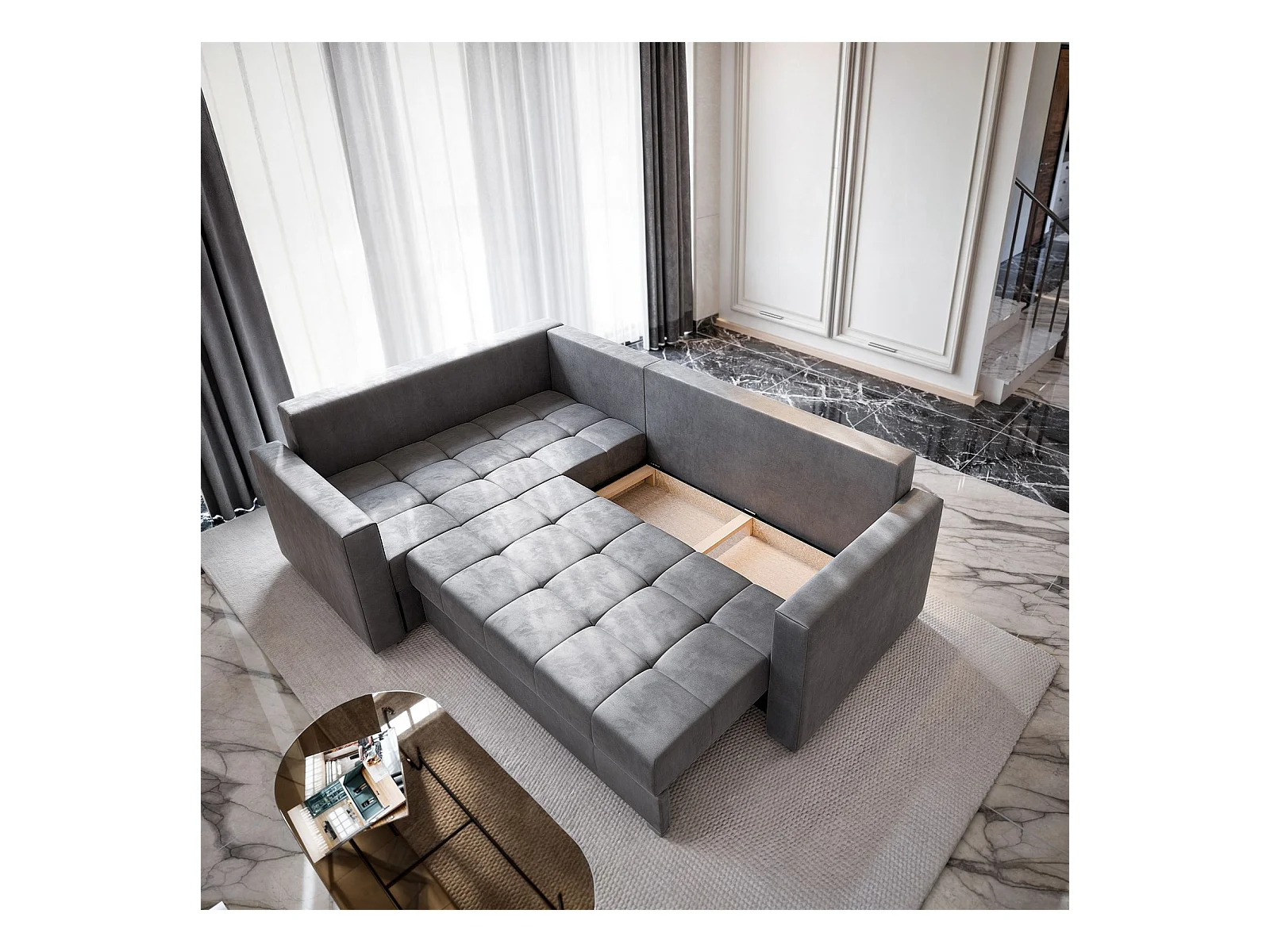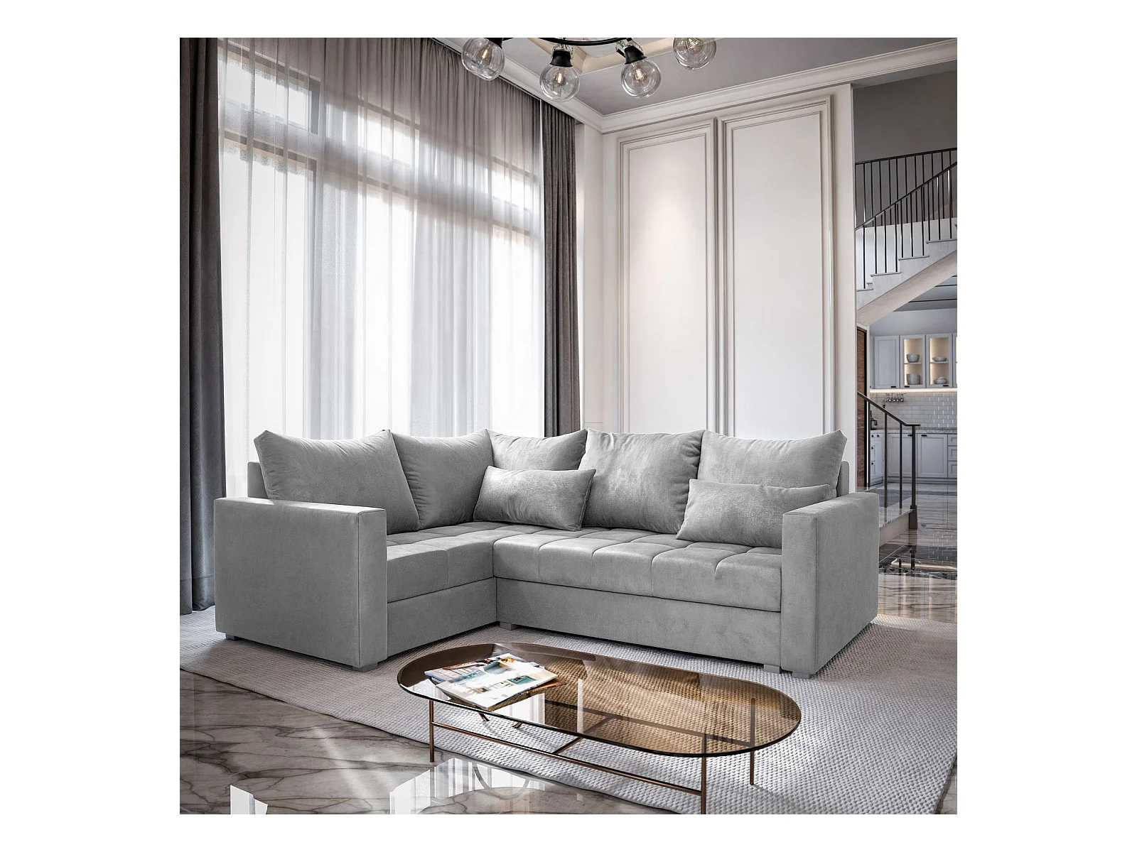 Canapé d'angle LIRENO Gris clair en peluche avec fonction de couchage