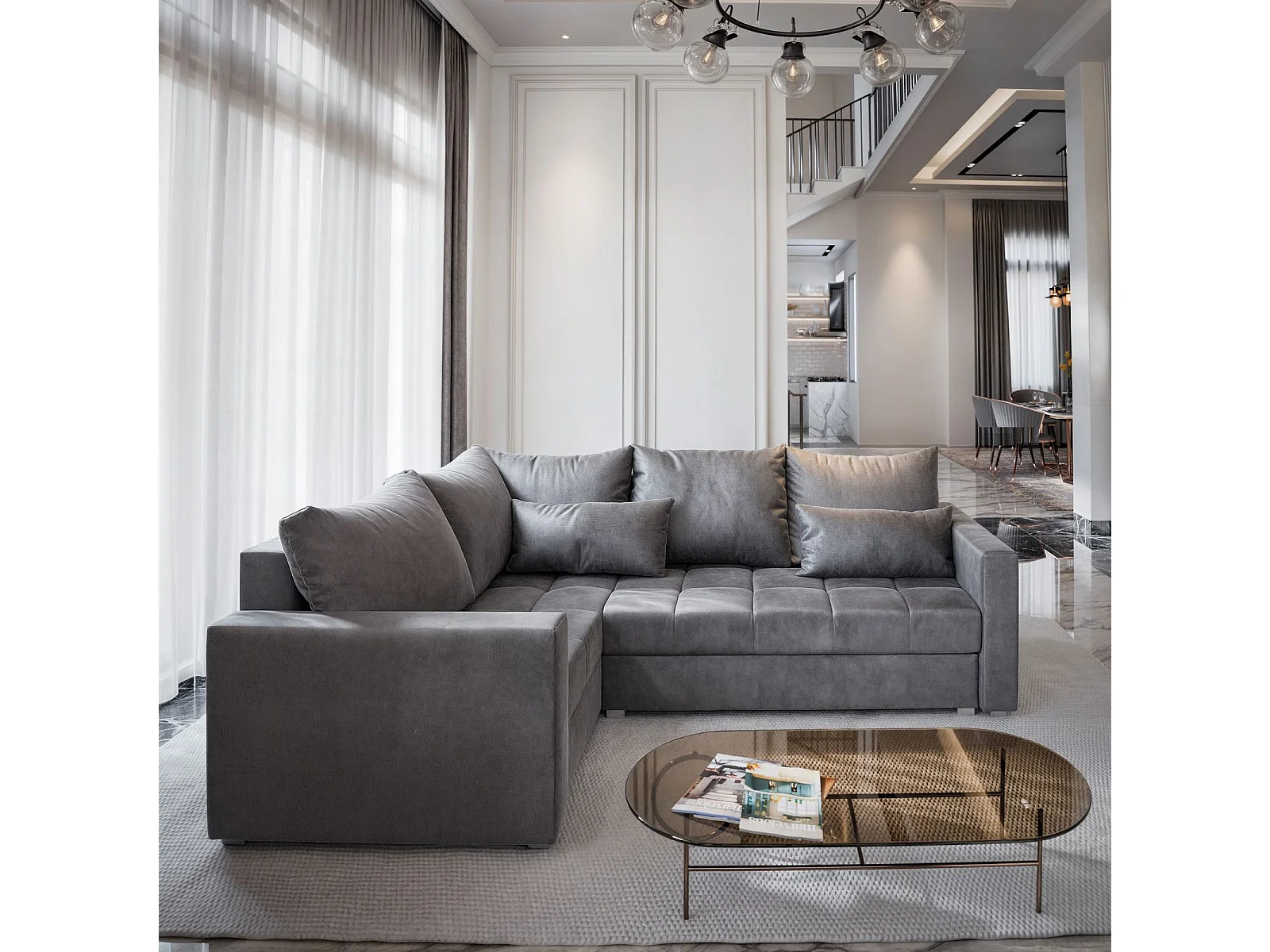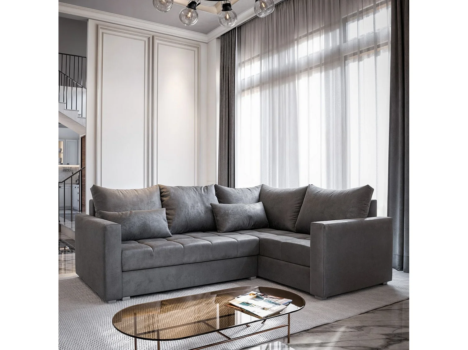 Canapé d'angle LIRENO Gris en peluche avec fonction de couchage