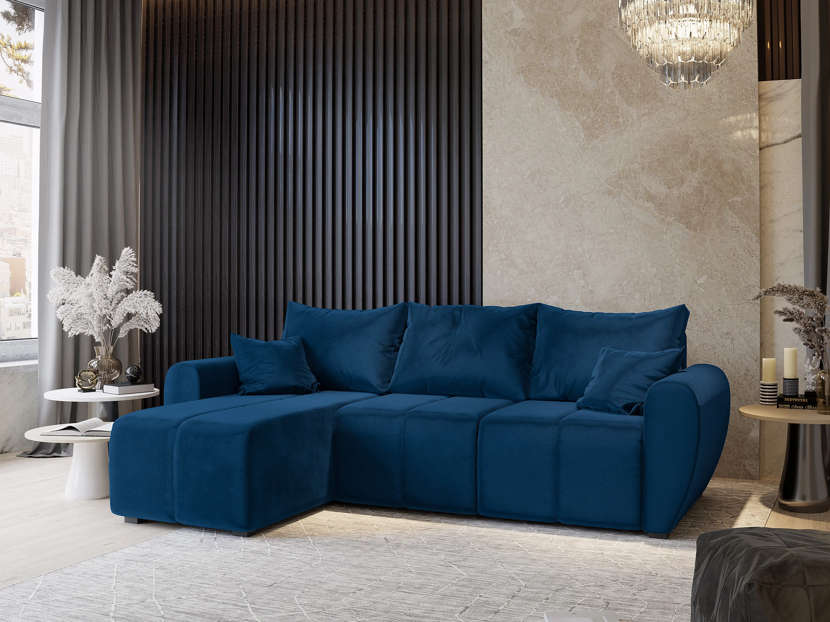 Canapé d'angle MADISON Bleu en peluche avec fonction de couchage