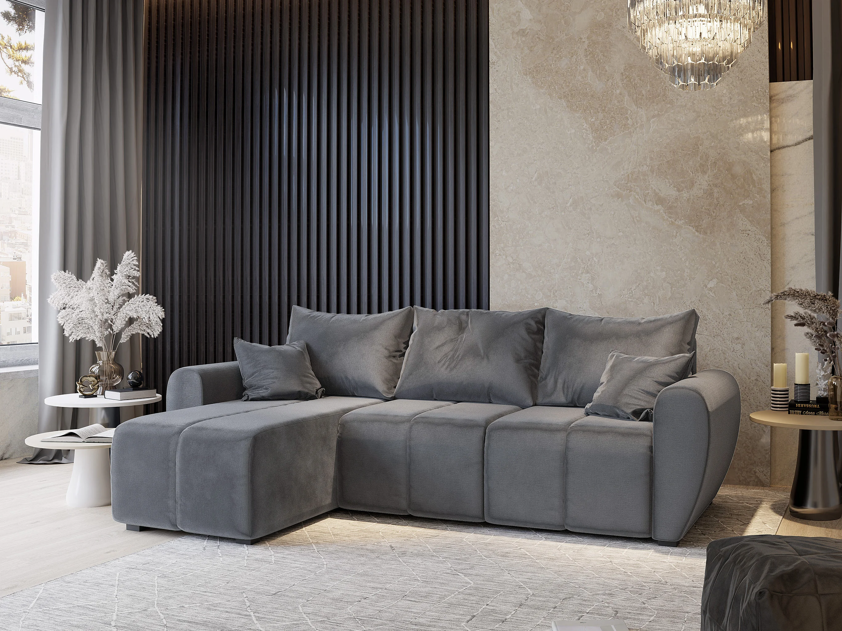 Canapé d'angle MADISON Gris en peluche avec fonction de couchage