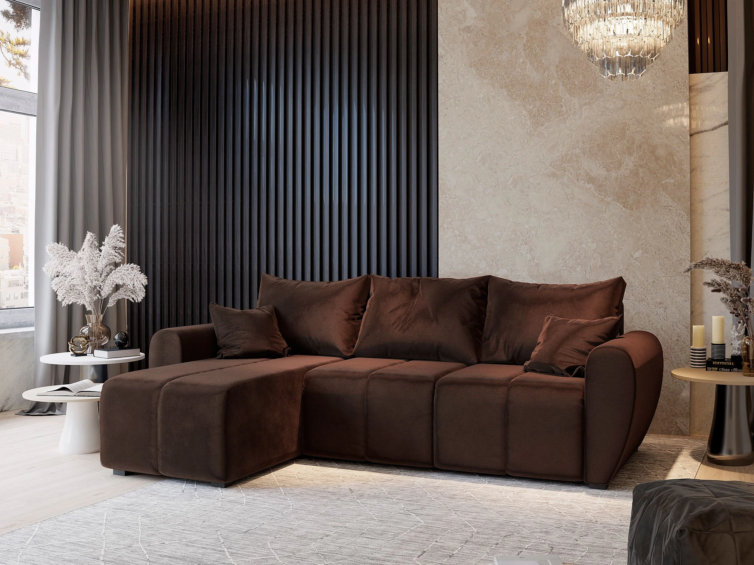 Canapé d'angle MADISON Marron en peluche avec fonction de couchage