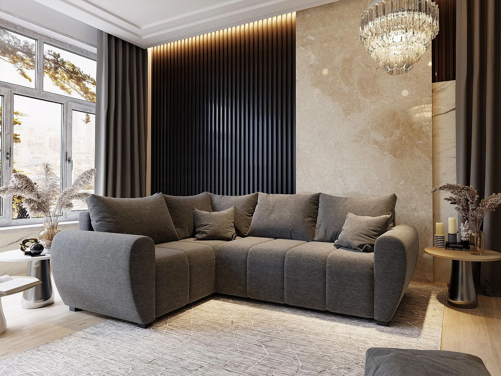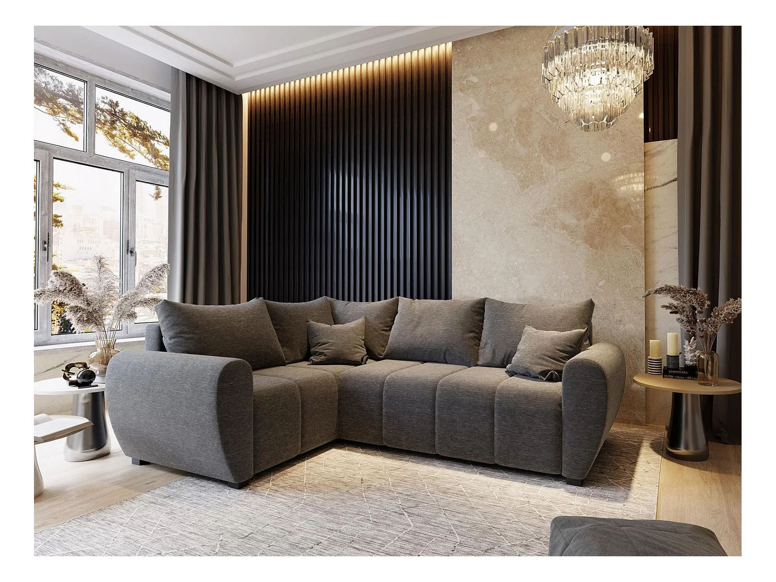 Canapé d'angle MADISON Gris clair en tissu texturé avec fonction de couchage