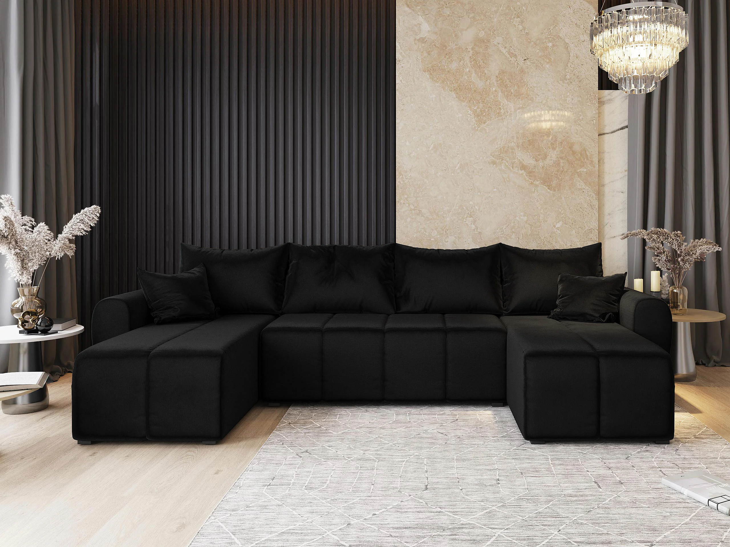 Canapé d'angle MADISON Noir en peluche avec fonction de couchage