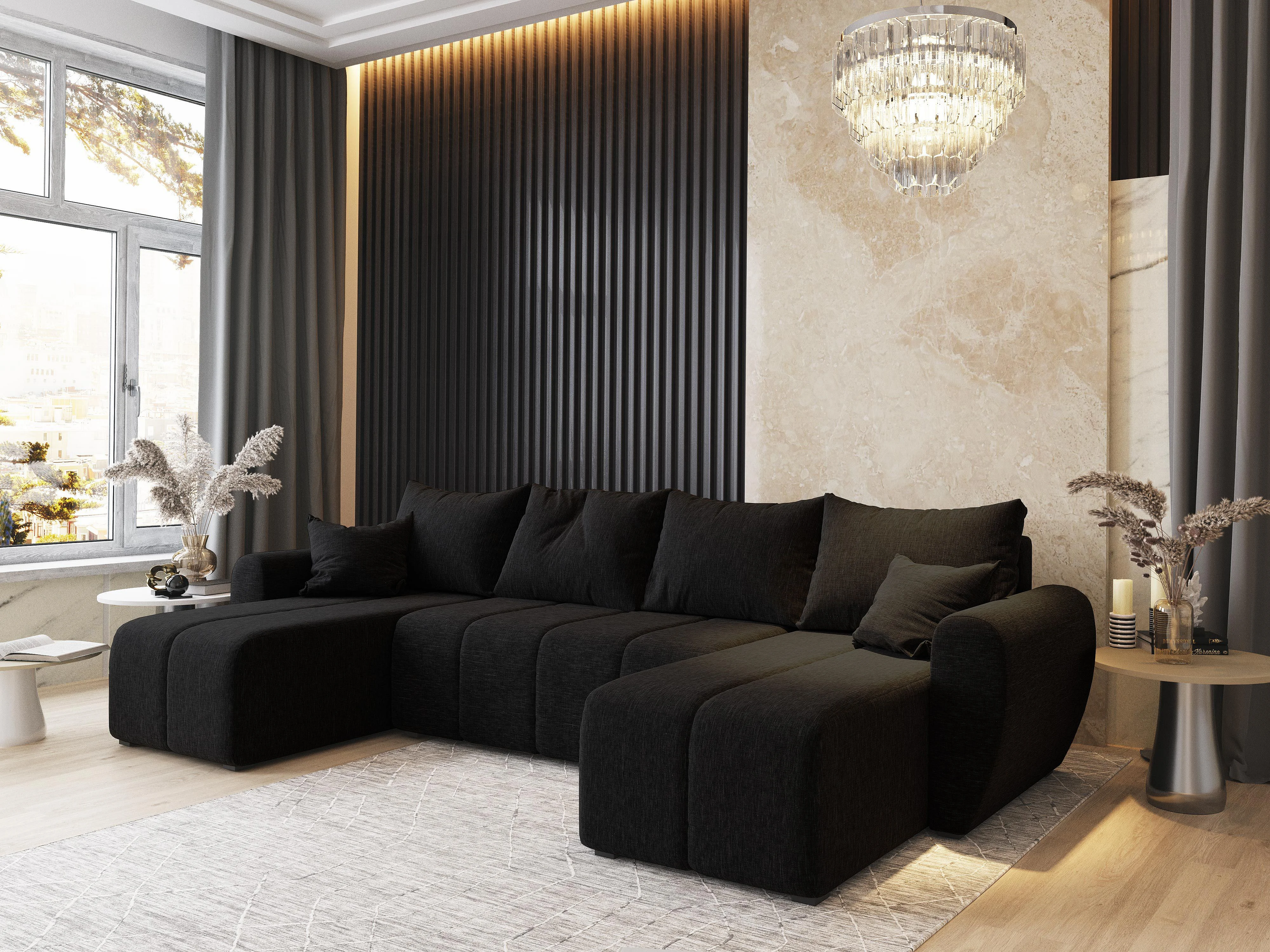 Canapé d'angle MADISON Noir en tissu texturé avec fonction de couchage