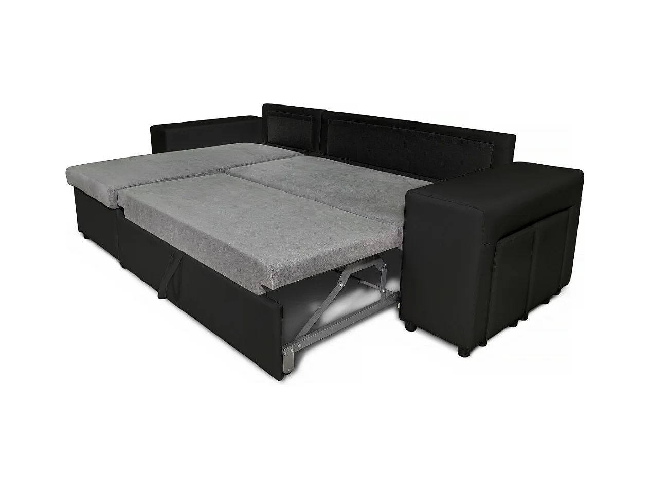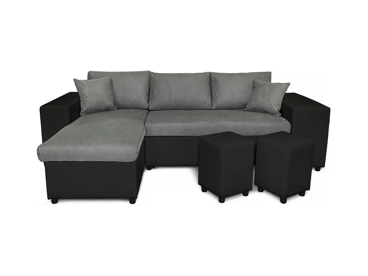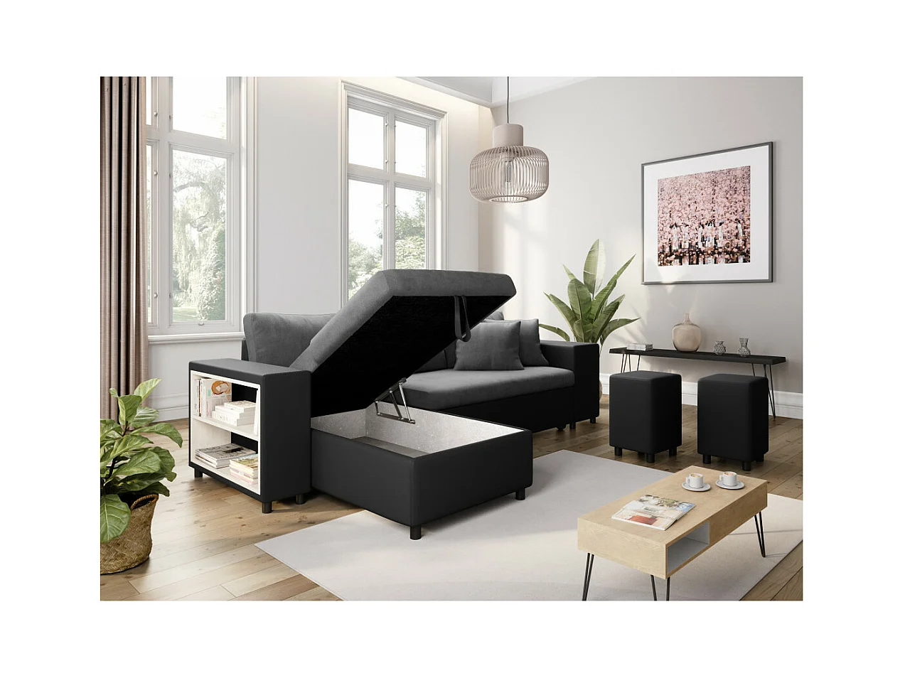 Canapé d'angle réversible Mady bimatière gris/noir avec coffre accoudoir étagère et poufs droit - L254 x P146 x H81cm - Loungitude