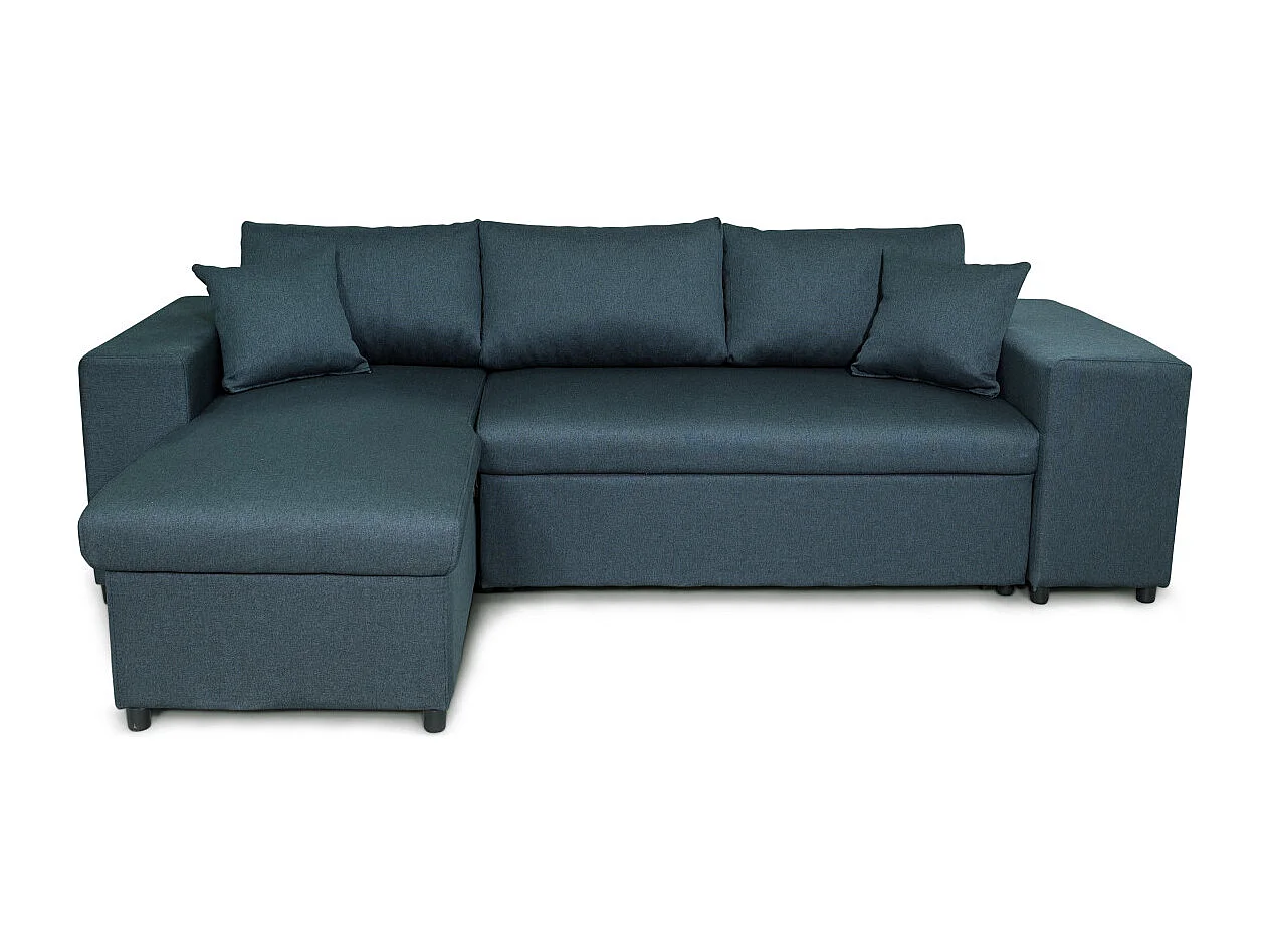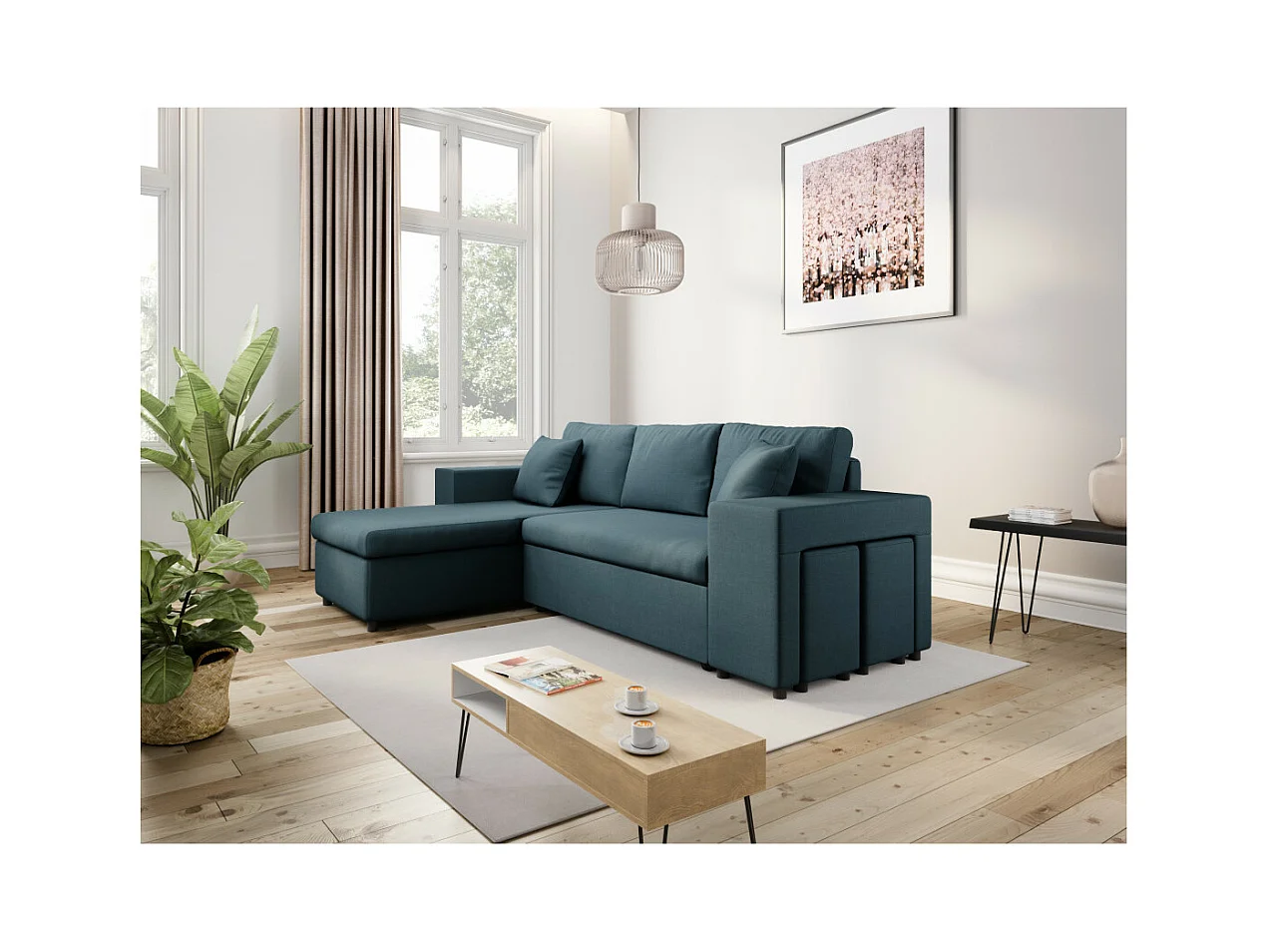 Canapé d'angle réversible Mady avec coffre, accoudoir étagère et poufs droit en tissu - Bleu - L254 x P146 x H81cm - Loungitude