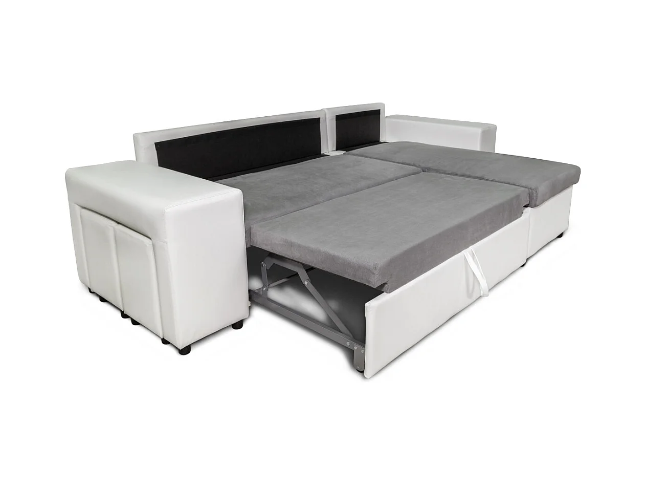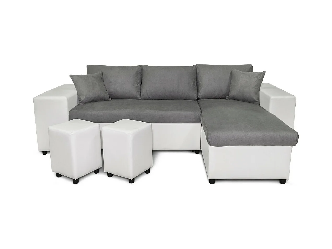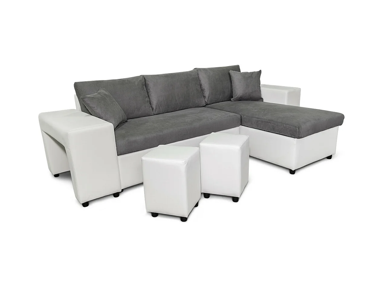 Canapé d'angle réversible Mady bimatière gris/blanc avec coffre accoudoir étagère et poufs gauche - L254 x P146 x H81cm - Loungitude