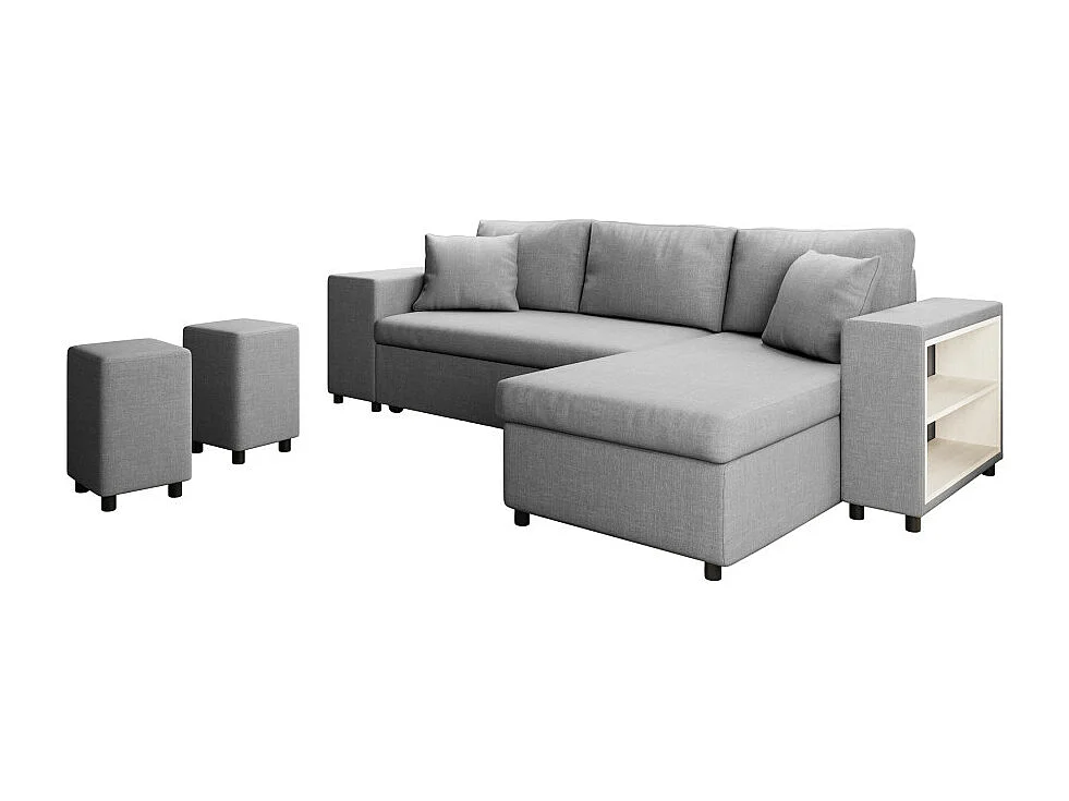 Canapé d'angle réversible Mady avec coffre accoudoir étagère et poufs gauche en tissu- Gris clair - L254 x P146 x H81cm - Loungitude