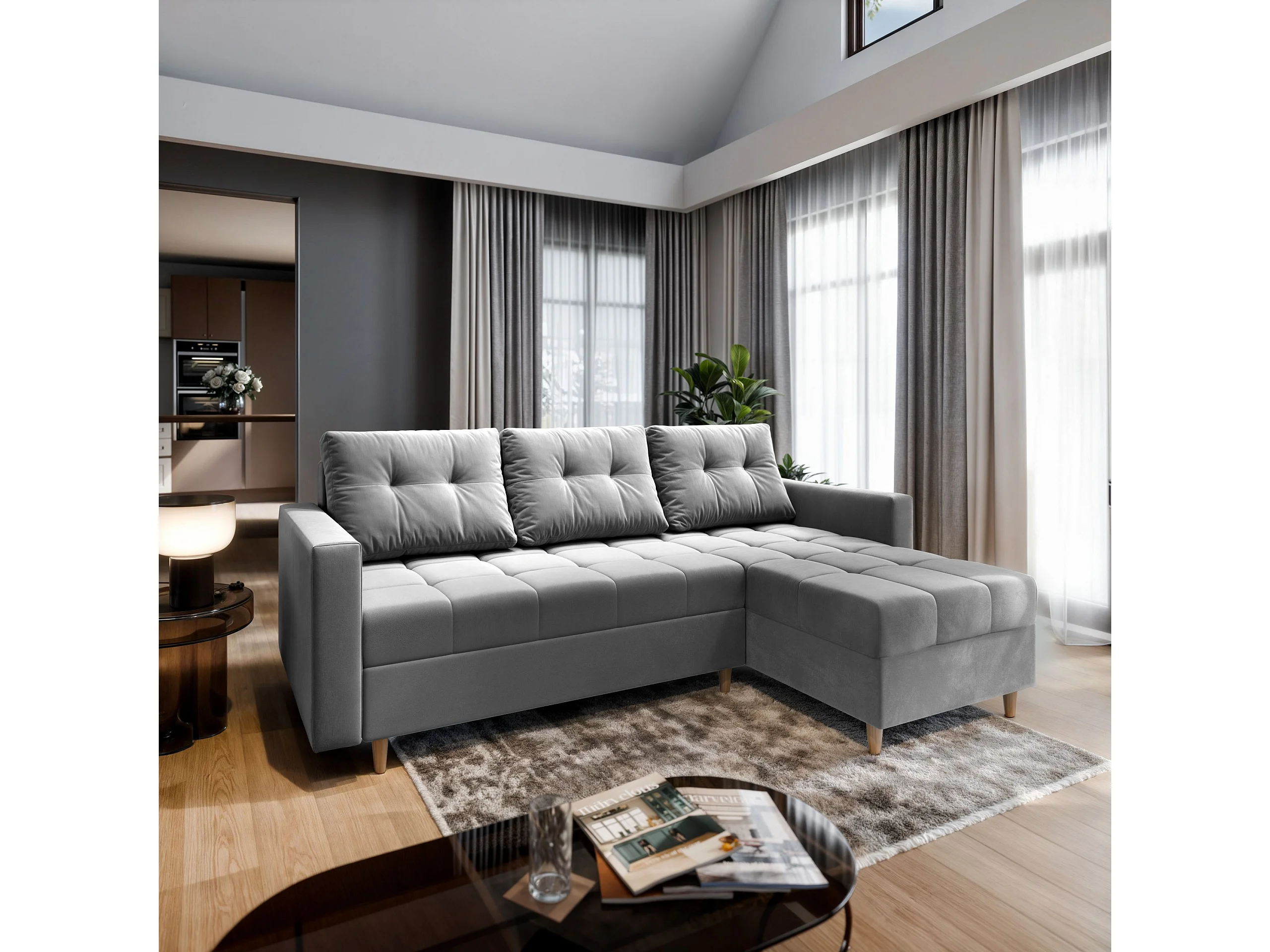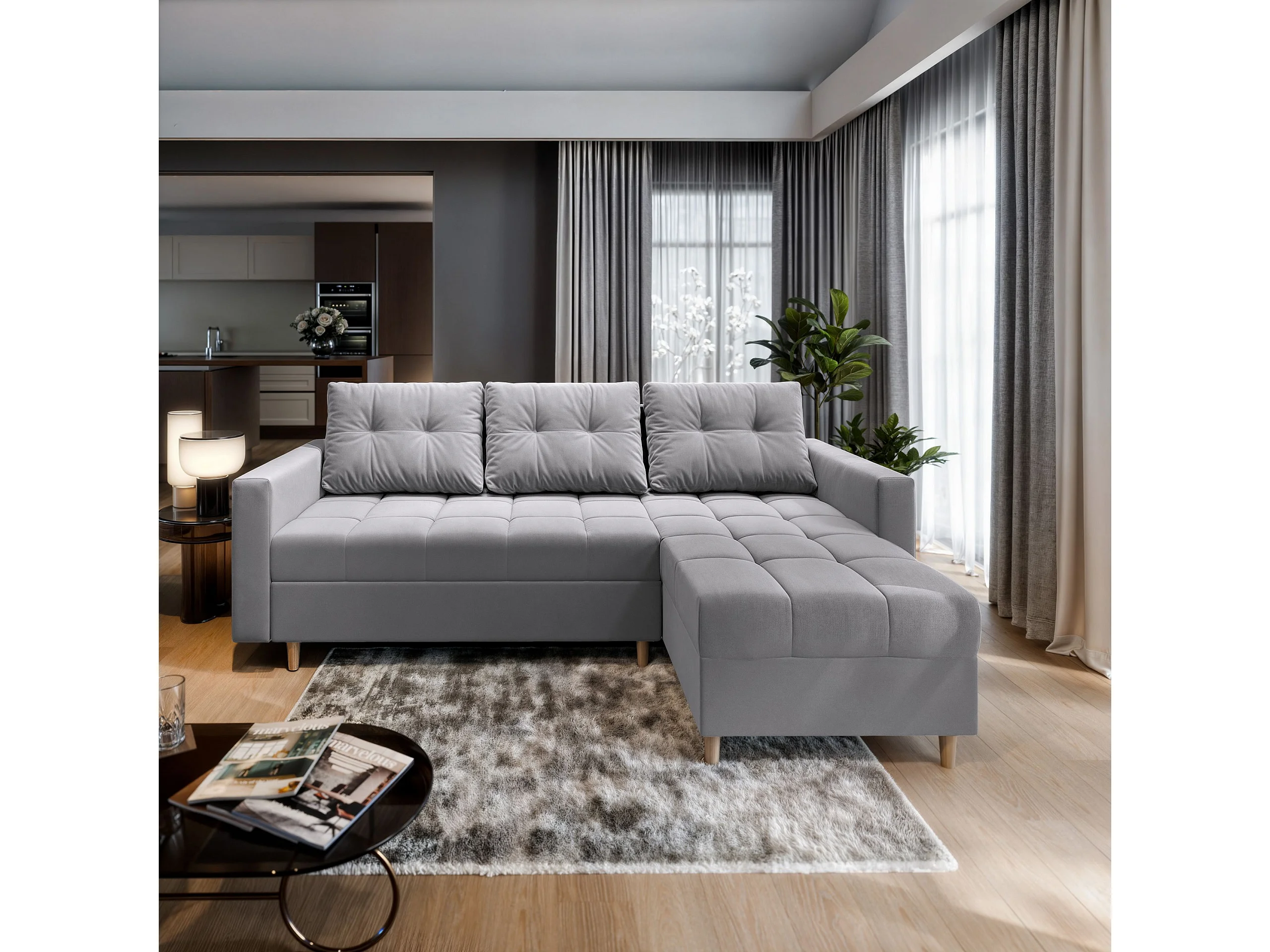 Canapé d'angle MILO Gris clair en peluche avec fonction de couchage