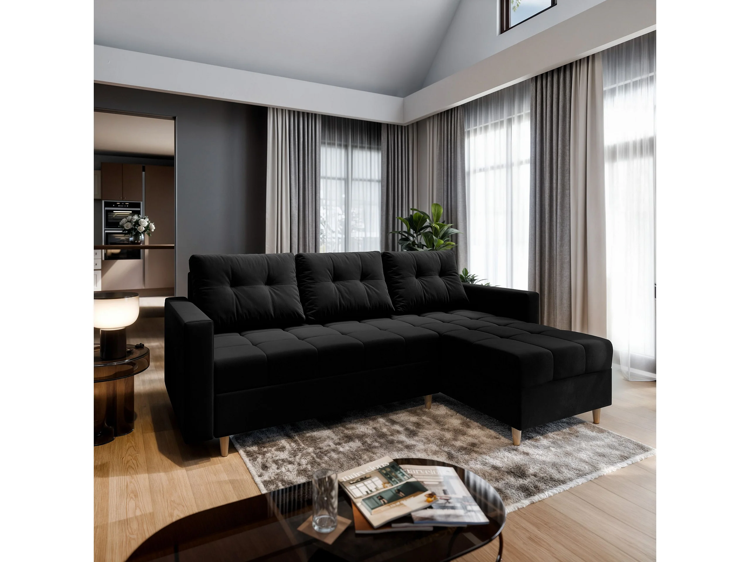 Canapé d'angle MILO Noir en peluche avec fonction de couchage