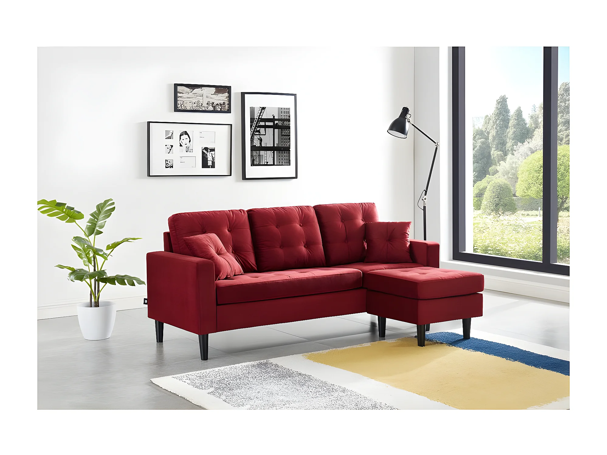 Canapé d'angle MIRISA en velours grenat et pieds bois 4 places et 2 coussins inclus