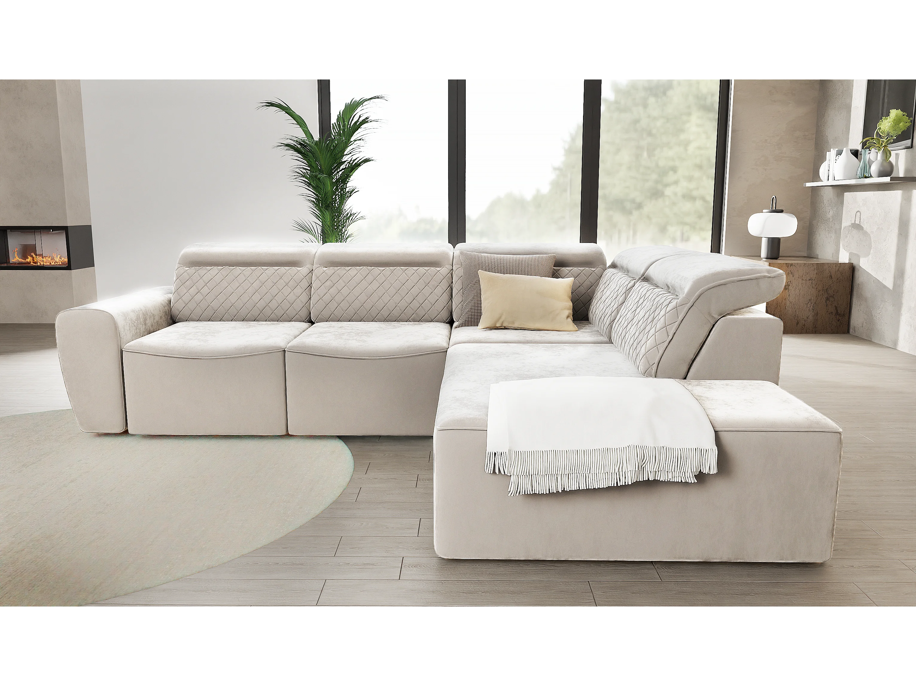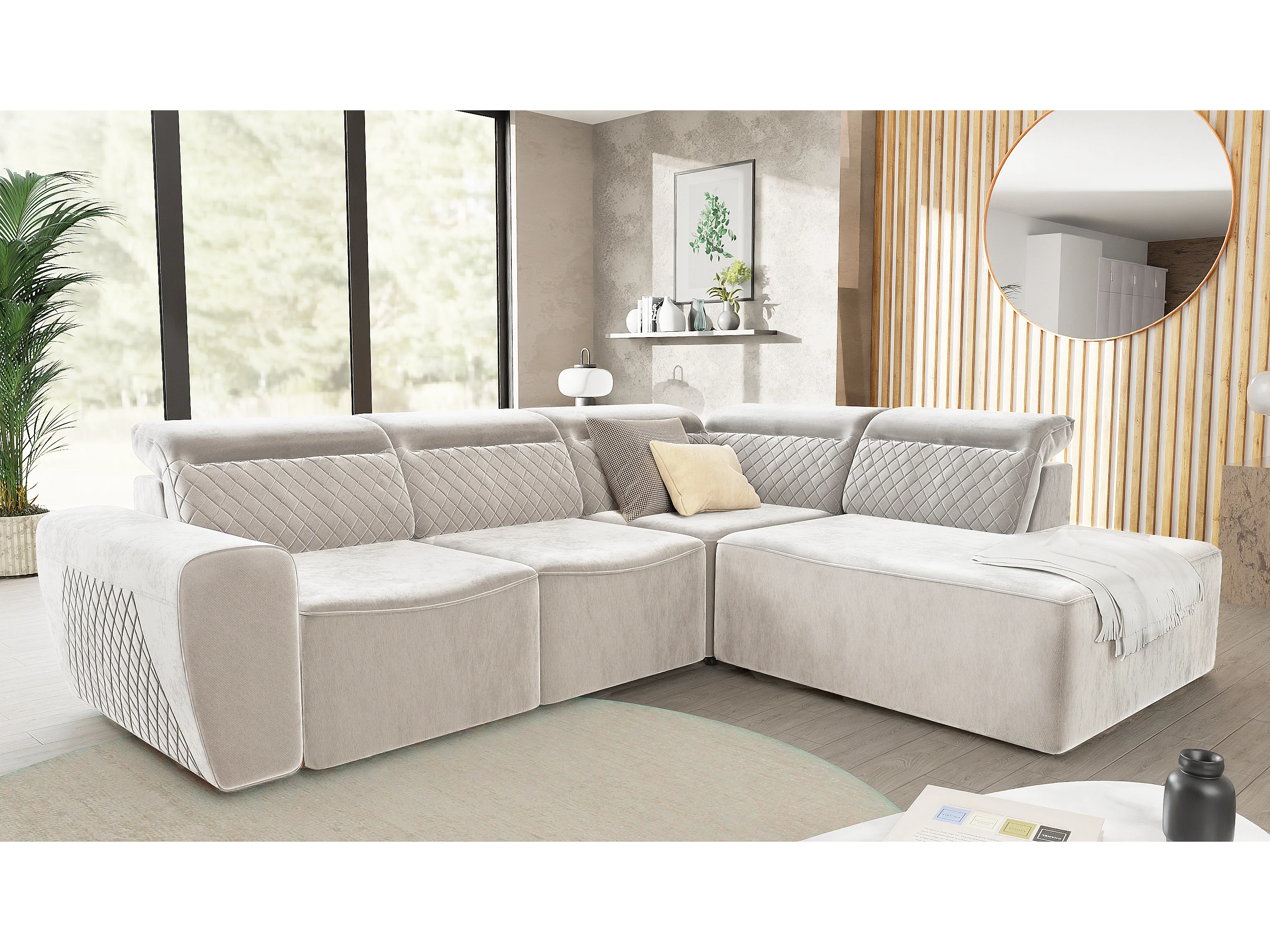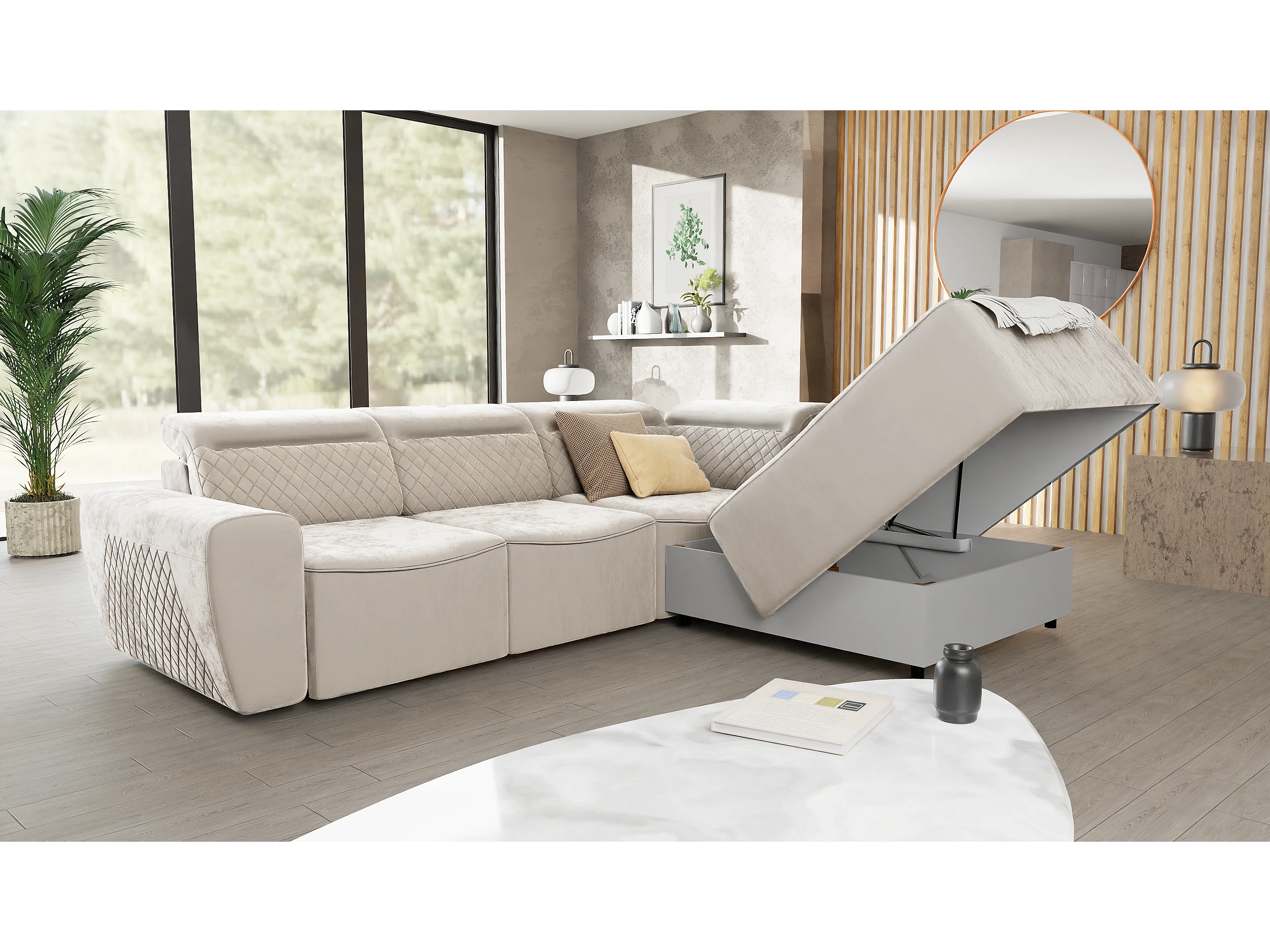 Canapé d’angle moderne avec fonction lit et coffre de rangement, en tissu velours beige, et des appuie-têtes réglables Hilda