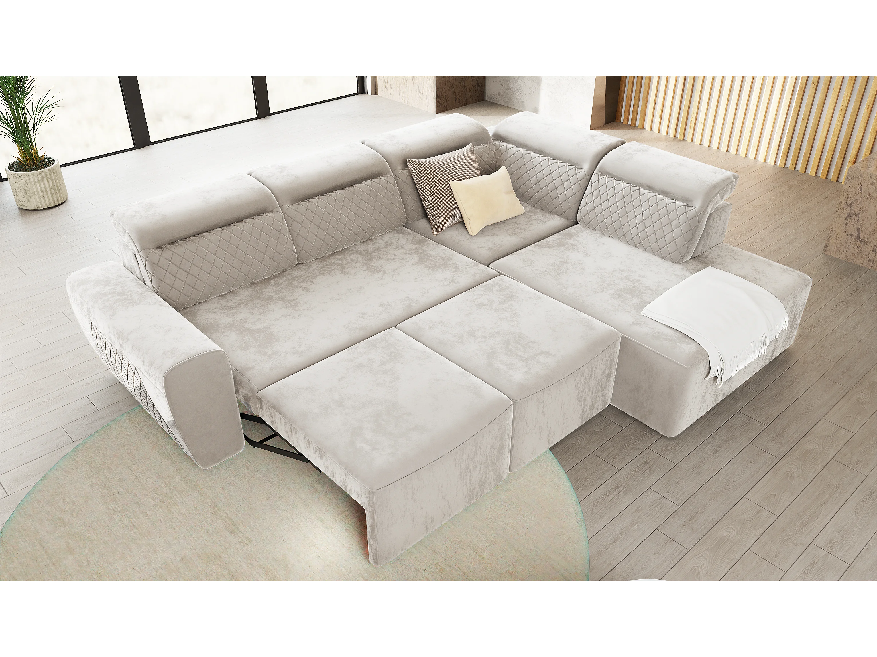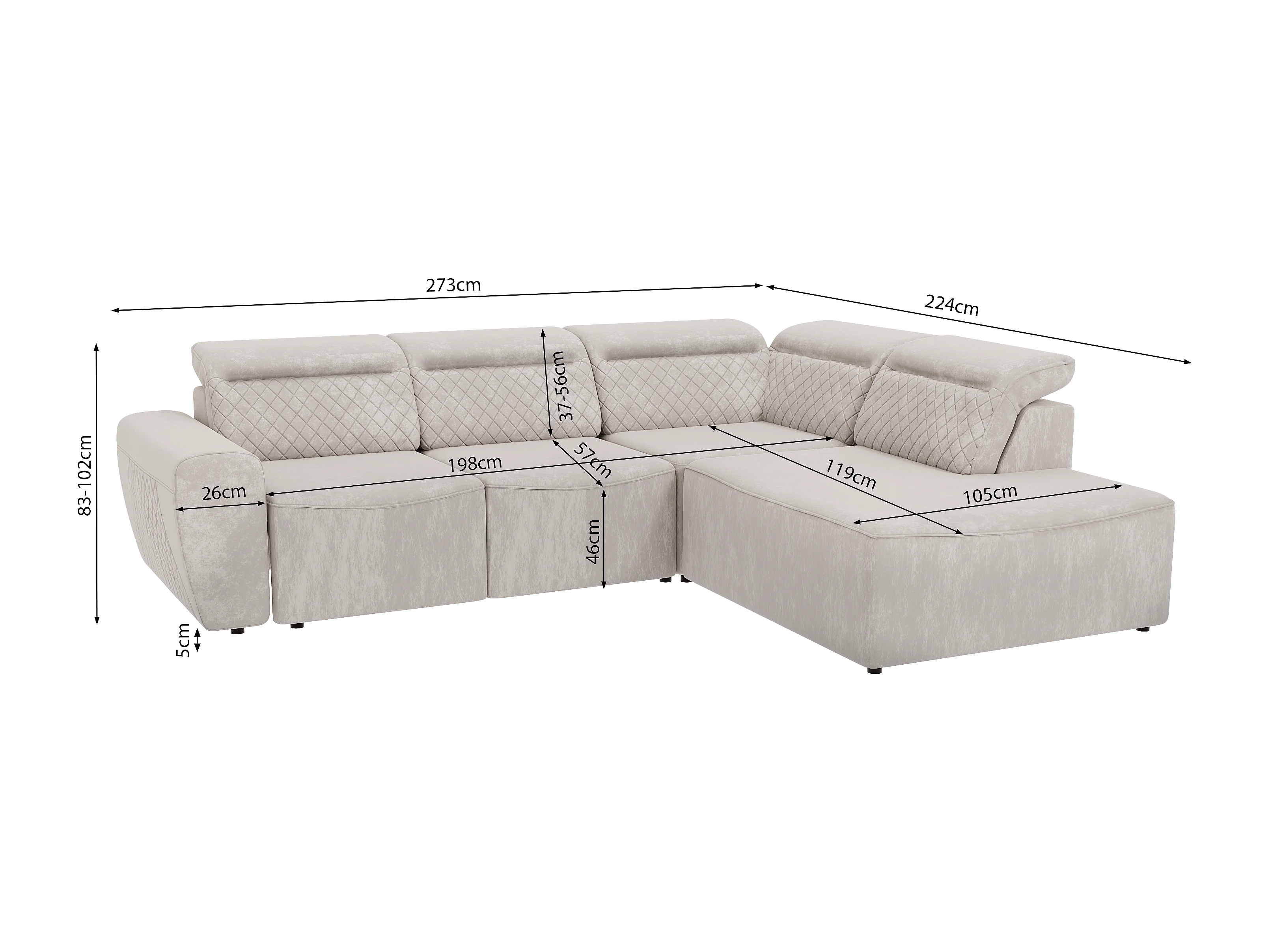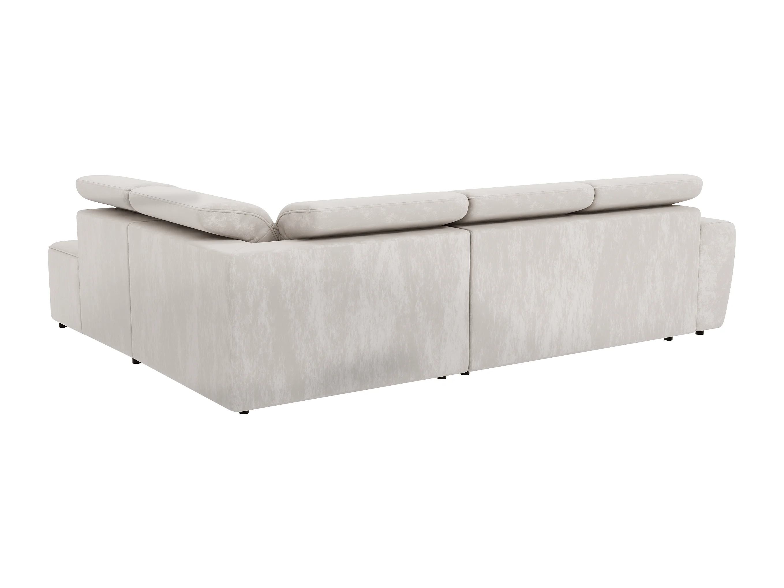Canapé d’angle moderne avec fonction lit et coffre de rangement, en tissu velours beige, et des appuie-têtes réglables Hilda