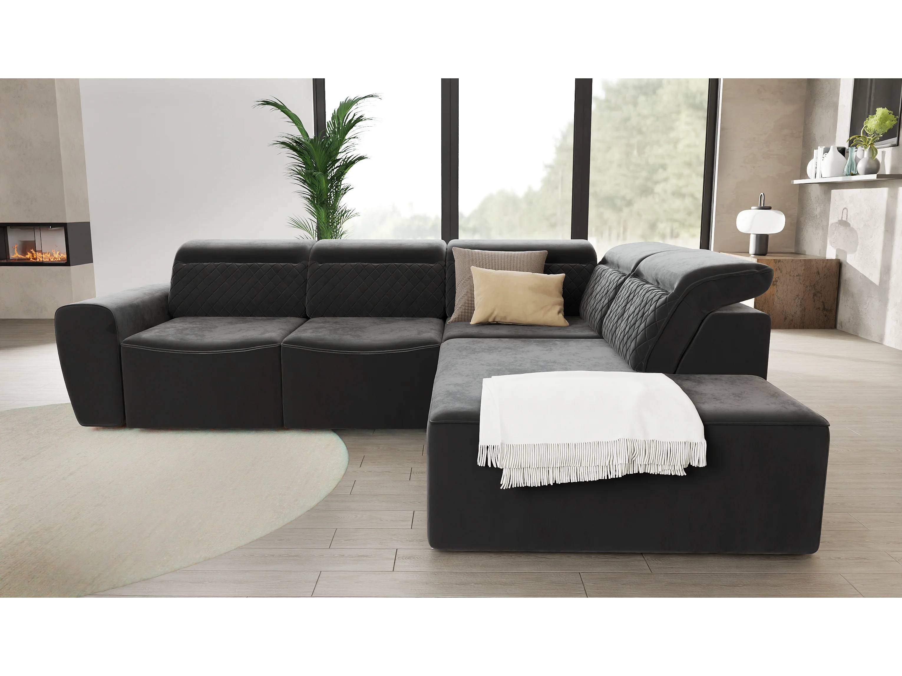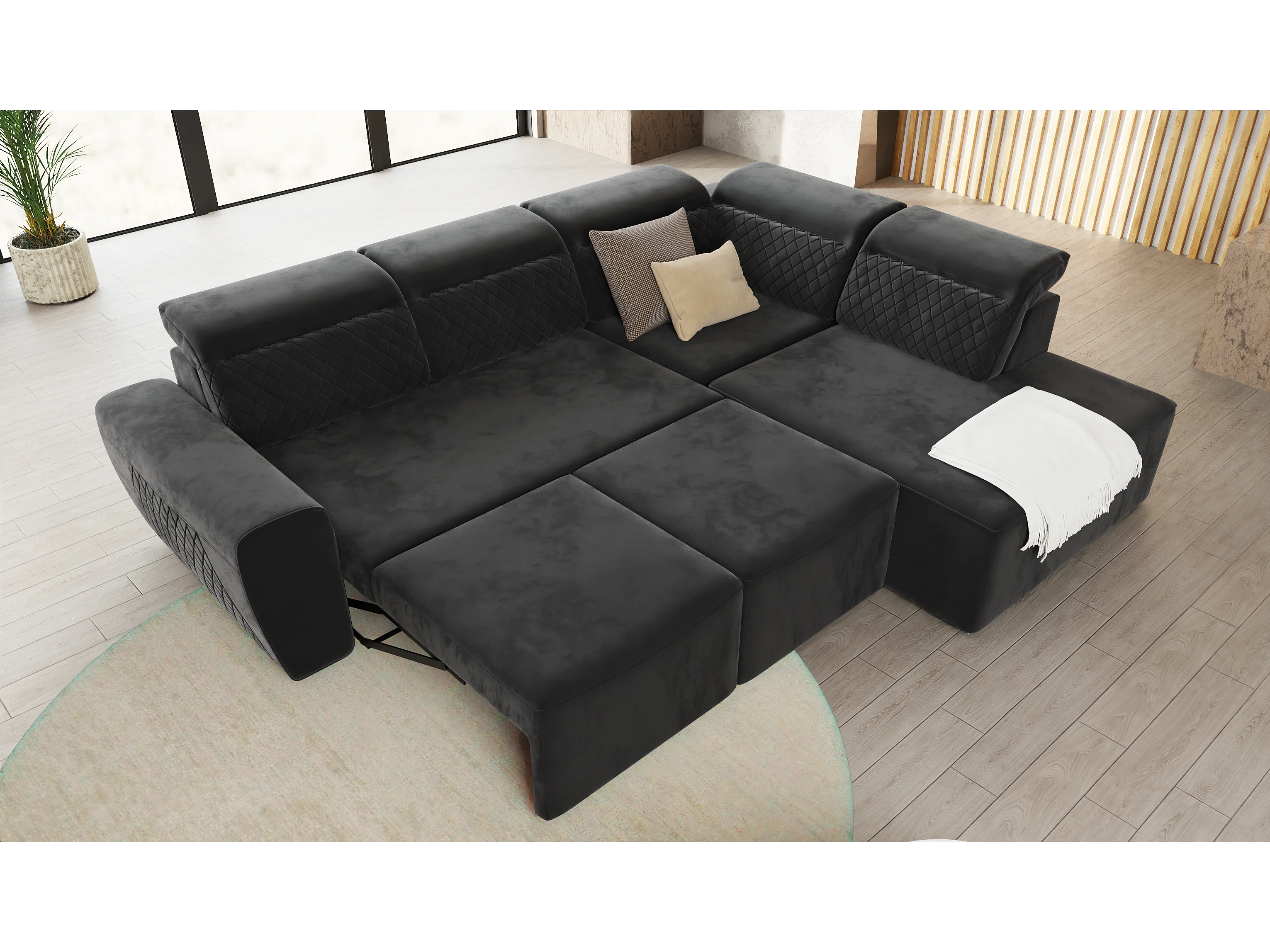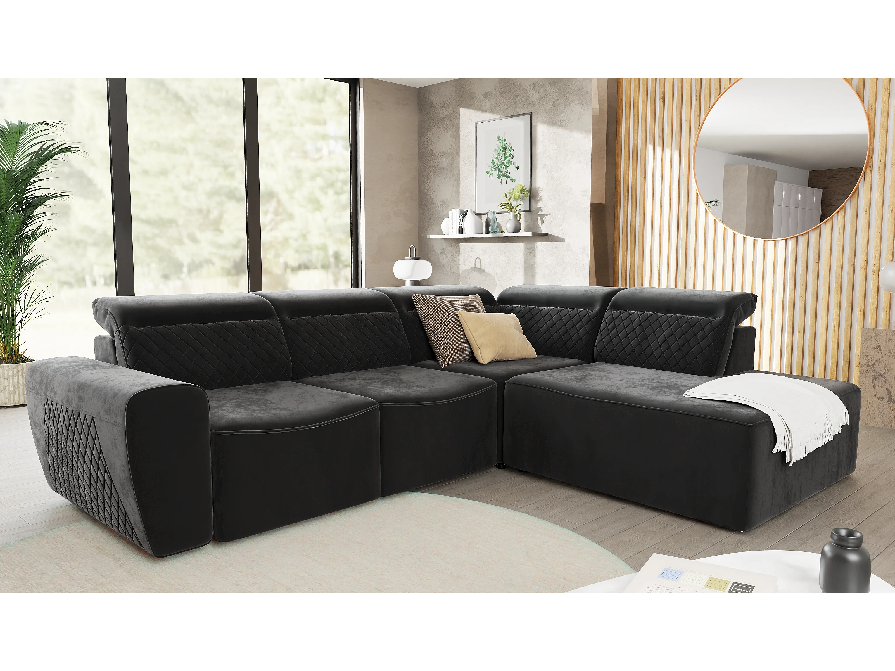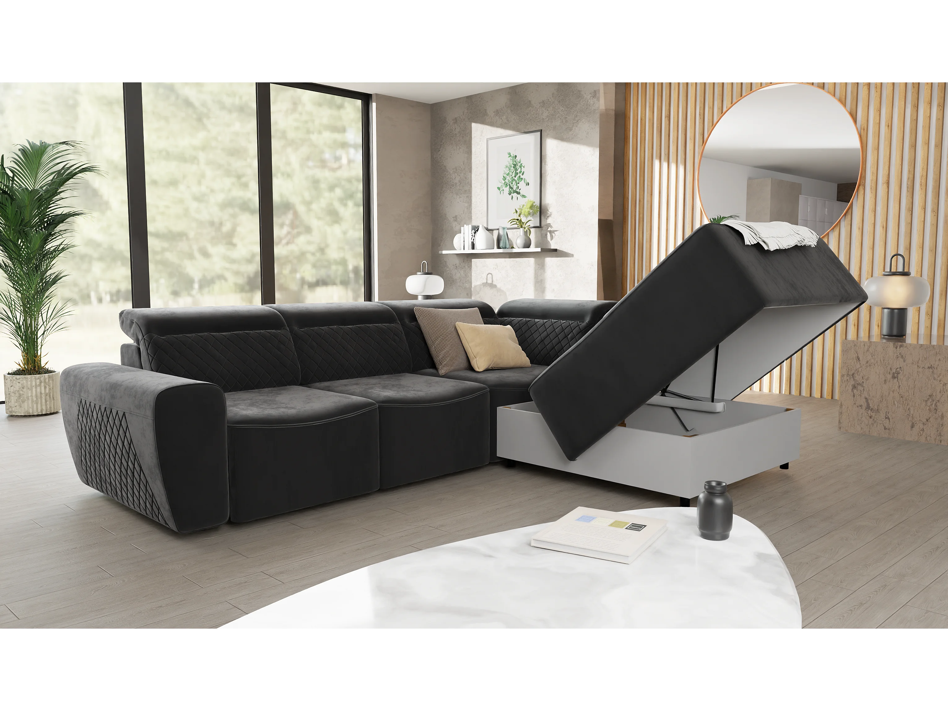 Canapé d’angle moderne avec fonction lit et coffre de rangement, en tissu velours noir, et des appuie-têtes réglables Hilda