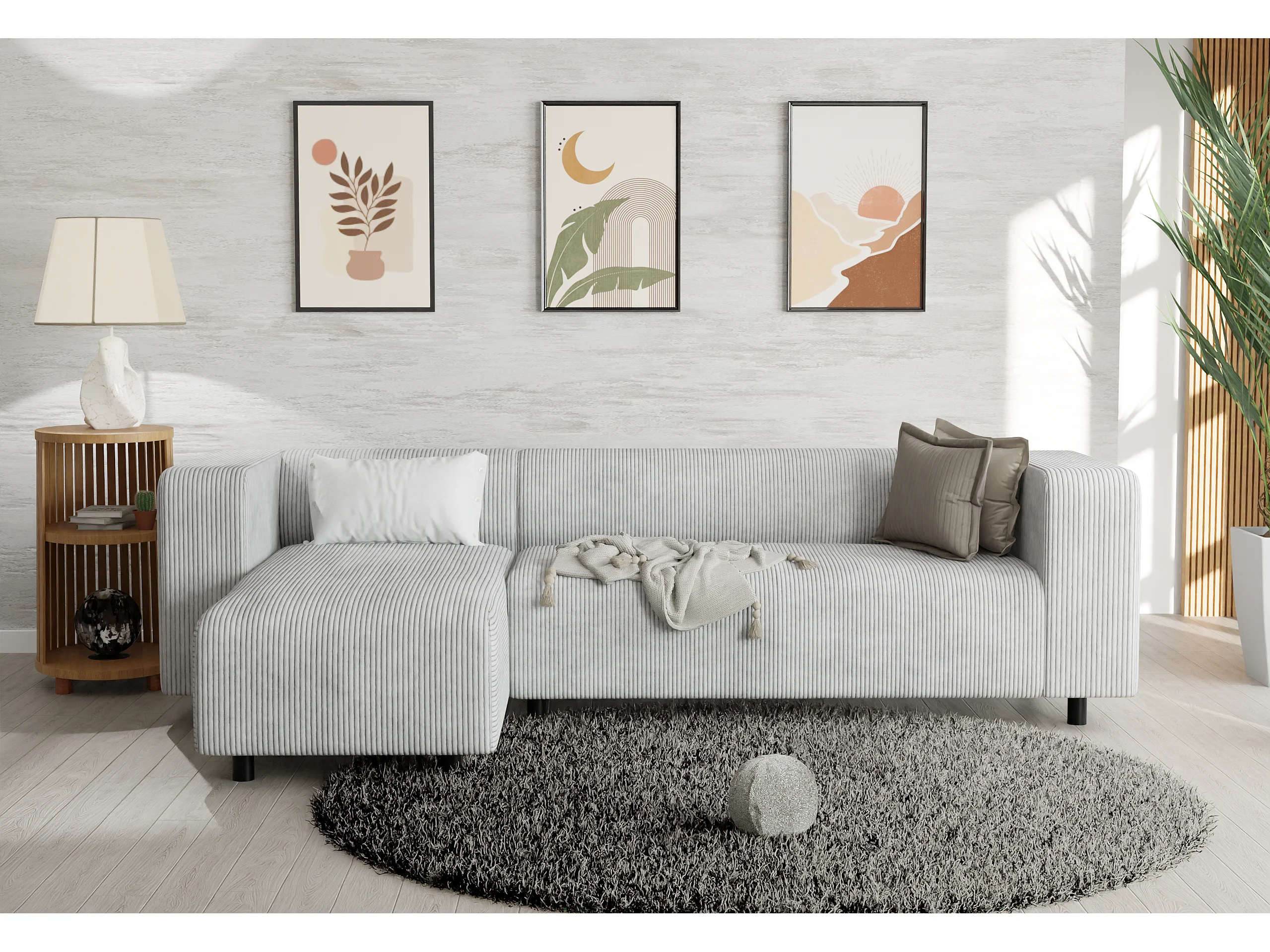 Canapé d’angle moderne avec ottomane en velours côtelé gris clair avec assise confortable THORA