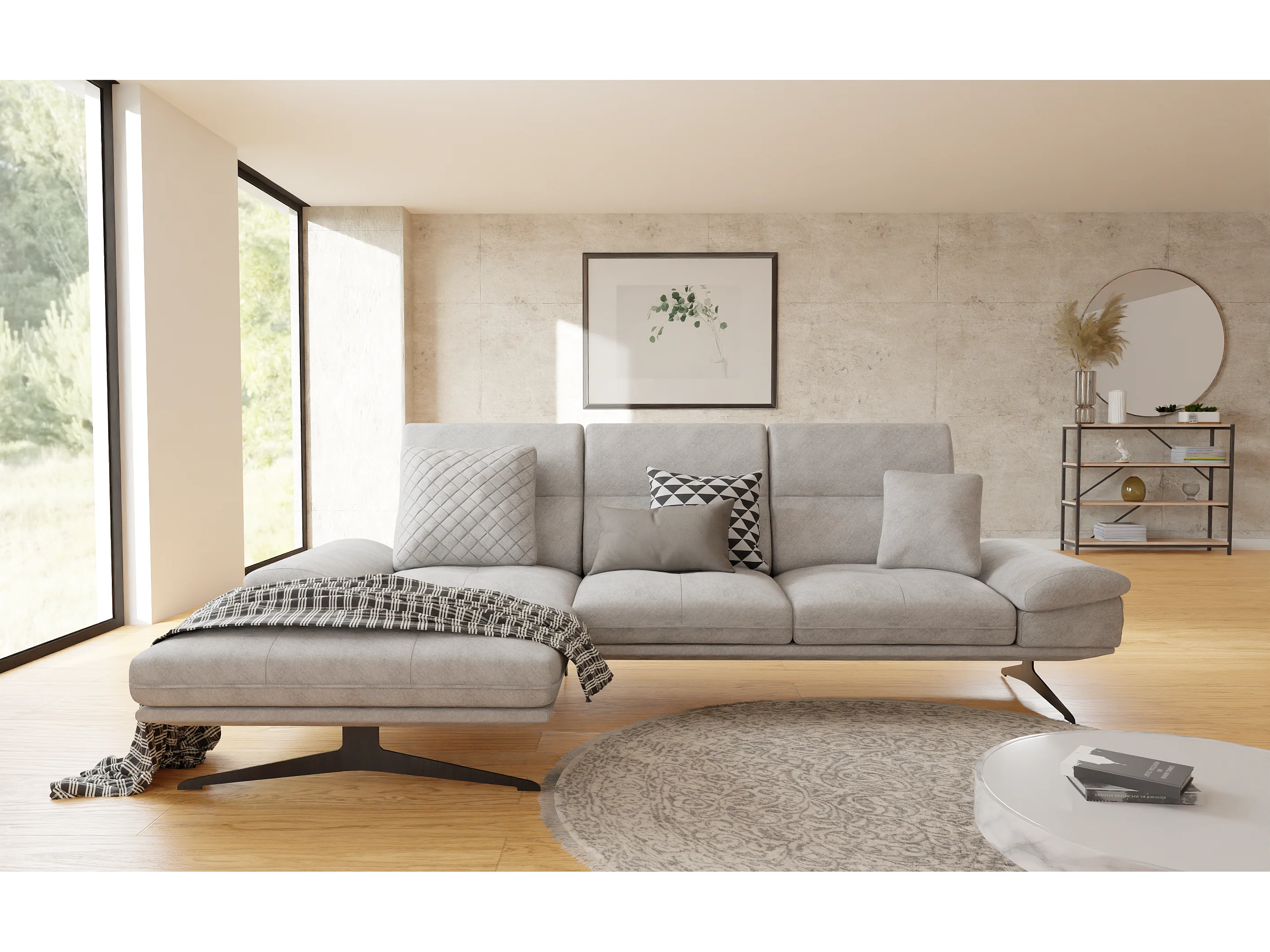 Canapé d’angle moderne avec ottomane et pieds hauts en métal noir, en tissu velours gris clair HAGA