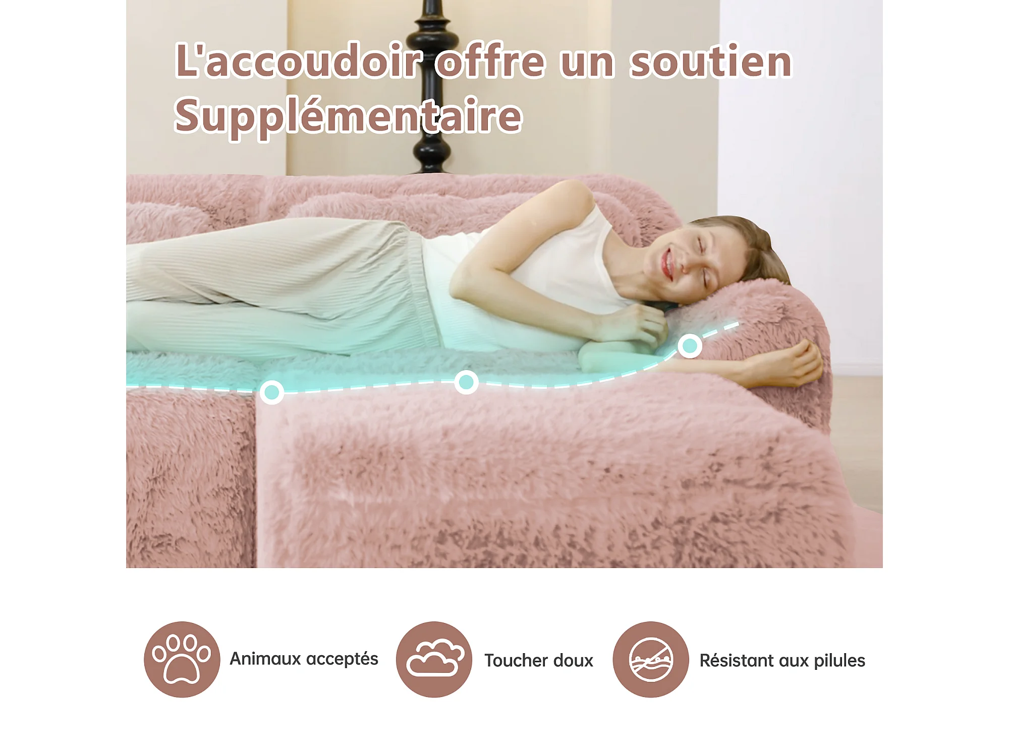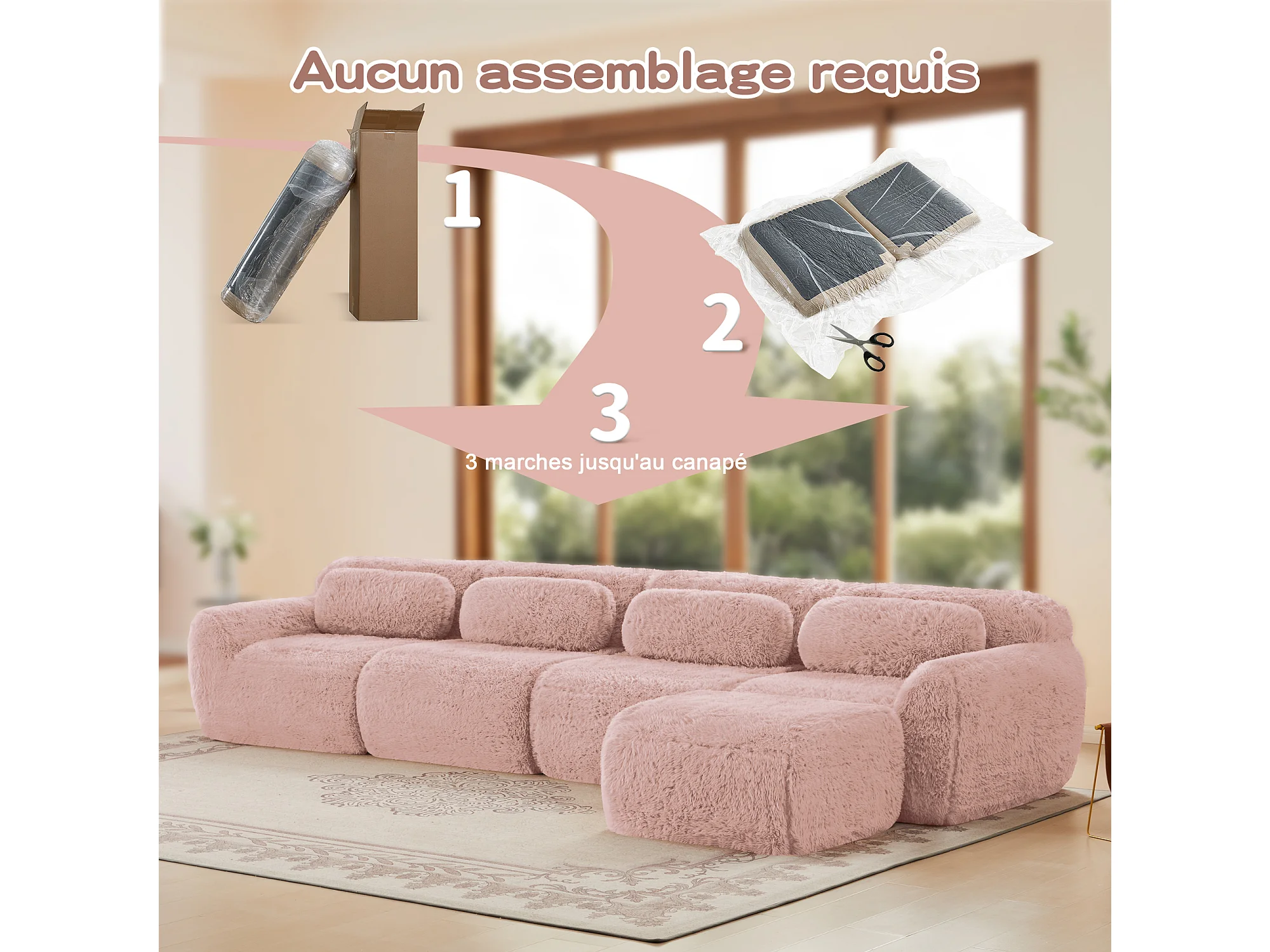 Canapé d'angle Modulable en tissu peluche, avec pouf et 4 coussins, sans cadre, 378x179x73cm, Rose