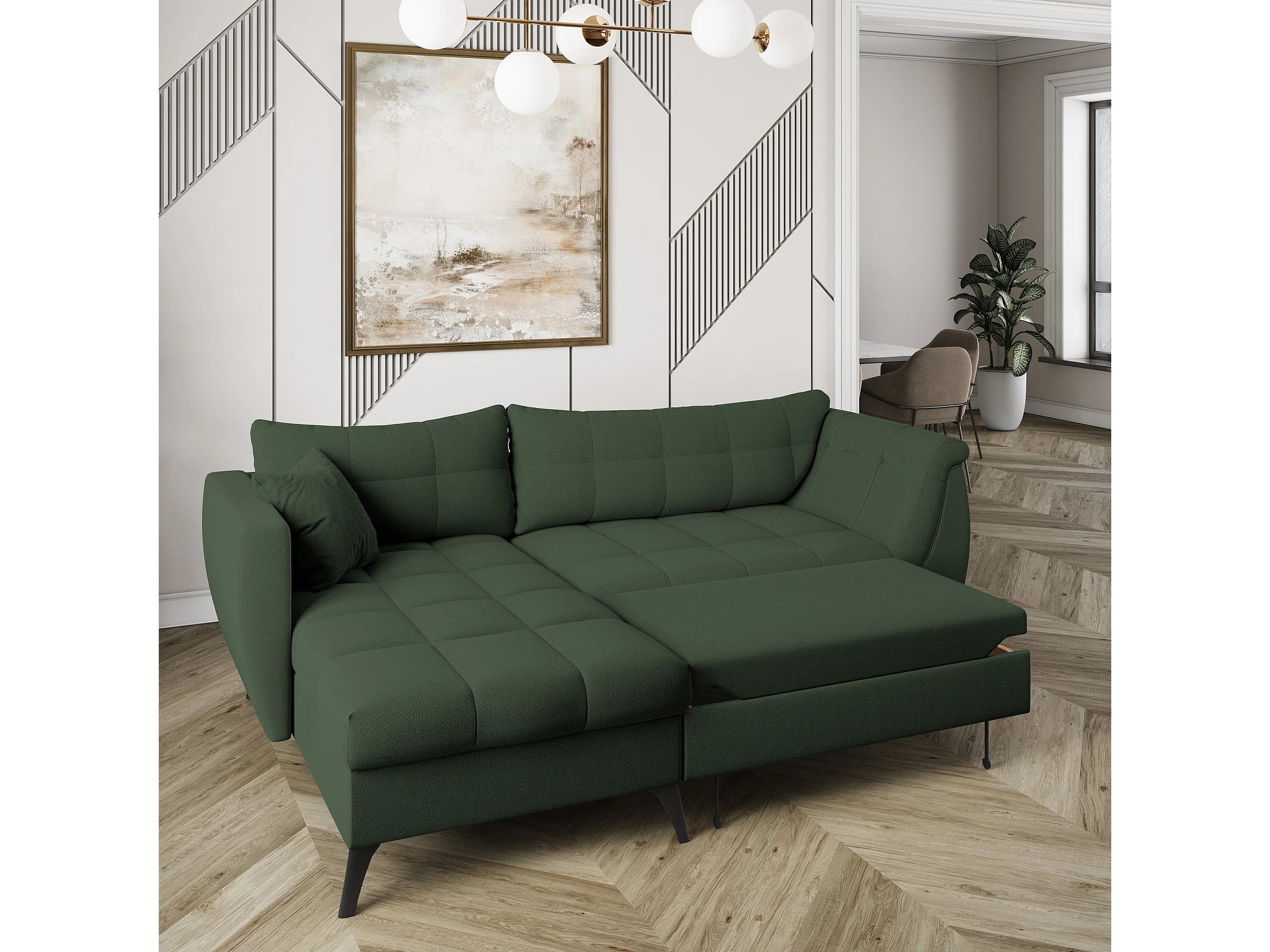 Canapé d'angle MOLLIS Vert en tissu texturé avec fonction de couchage