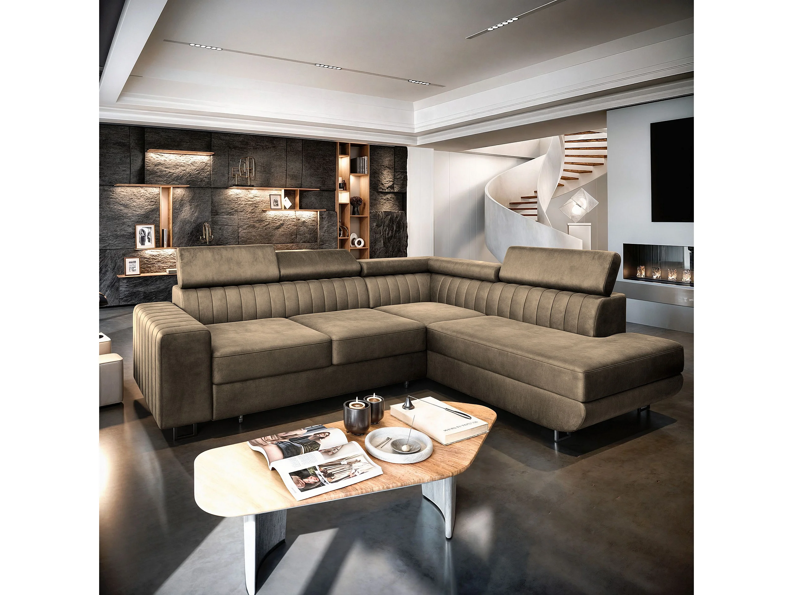Canapé d'angle NOLA Beige en velours avec fonction de couchage