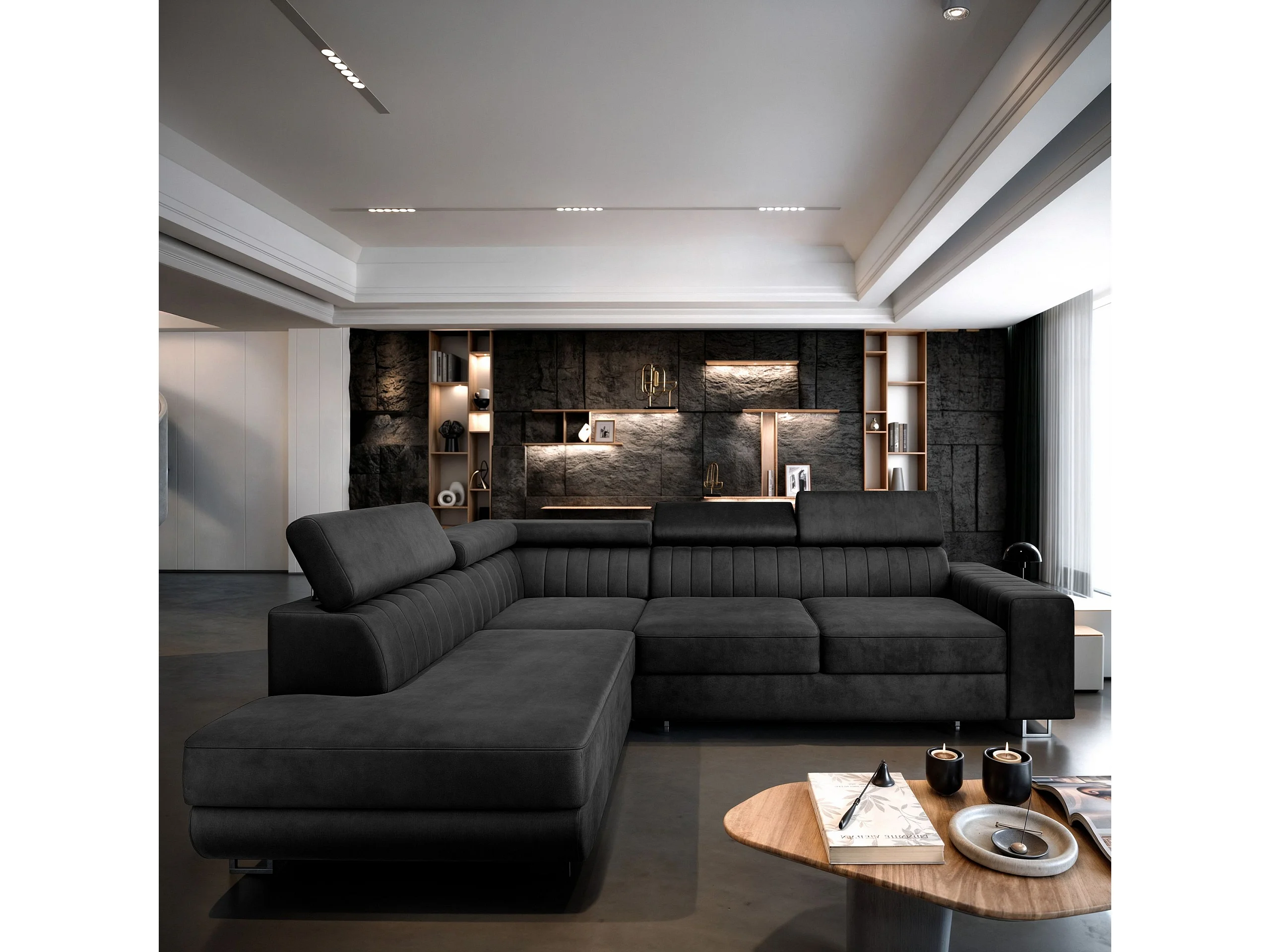 Canapé d'angle NOLA Noir en velours avec fonction de couchage
