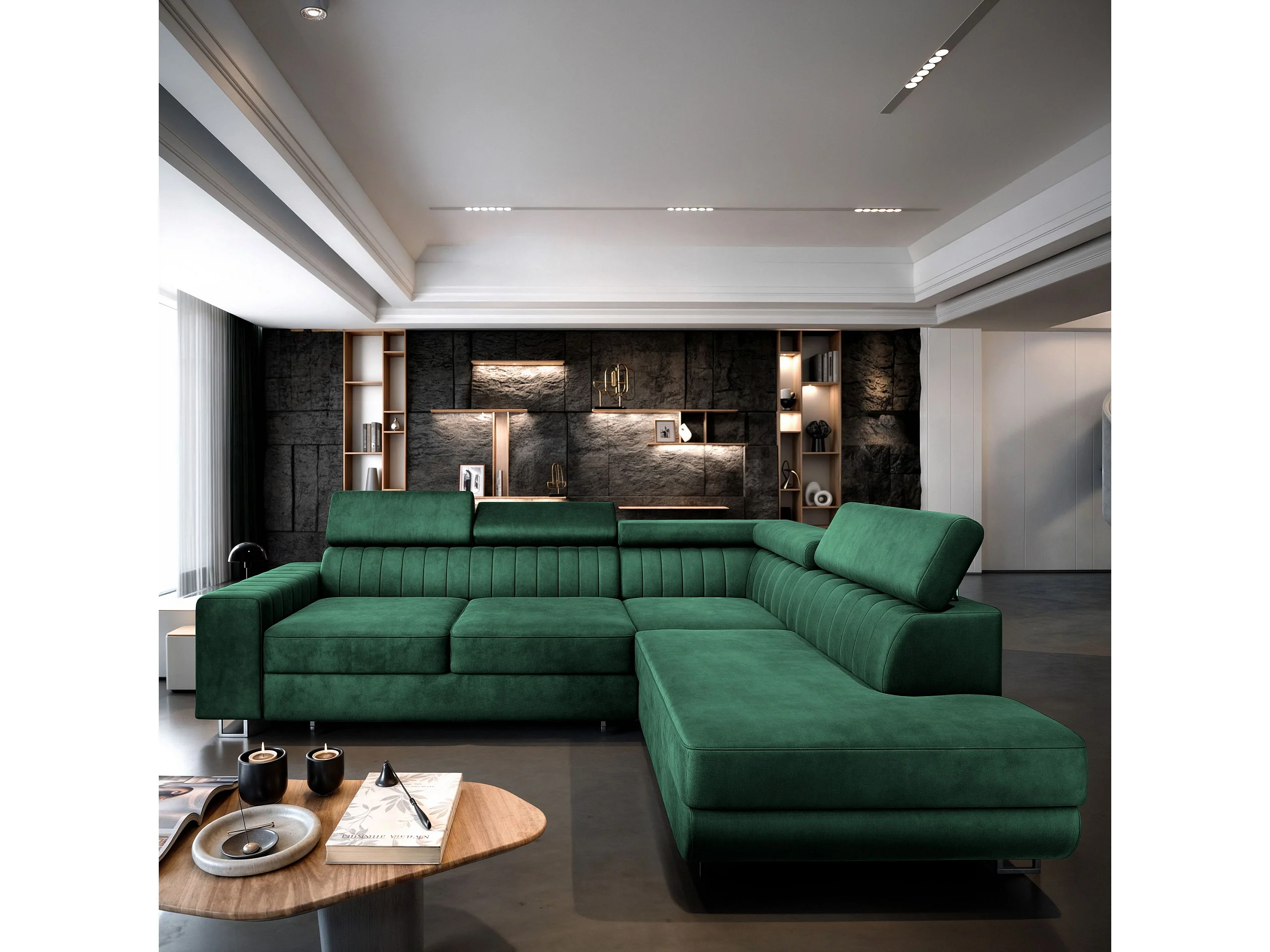 Canapé d'angle NOLA Vert Sapin en velours avec fonction de couchage