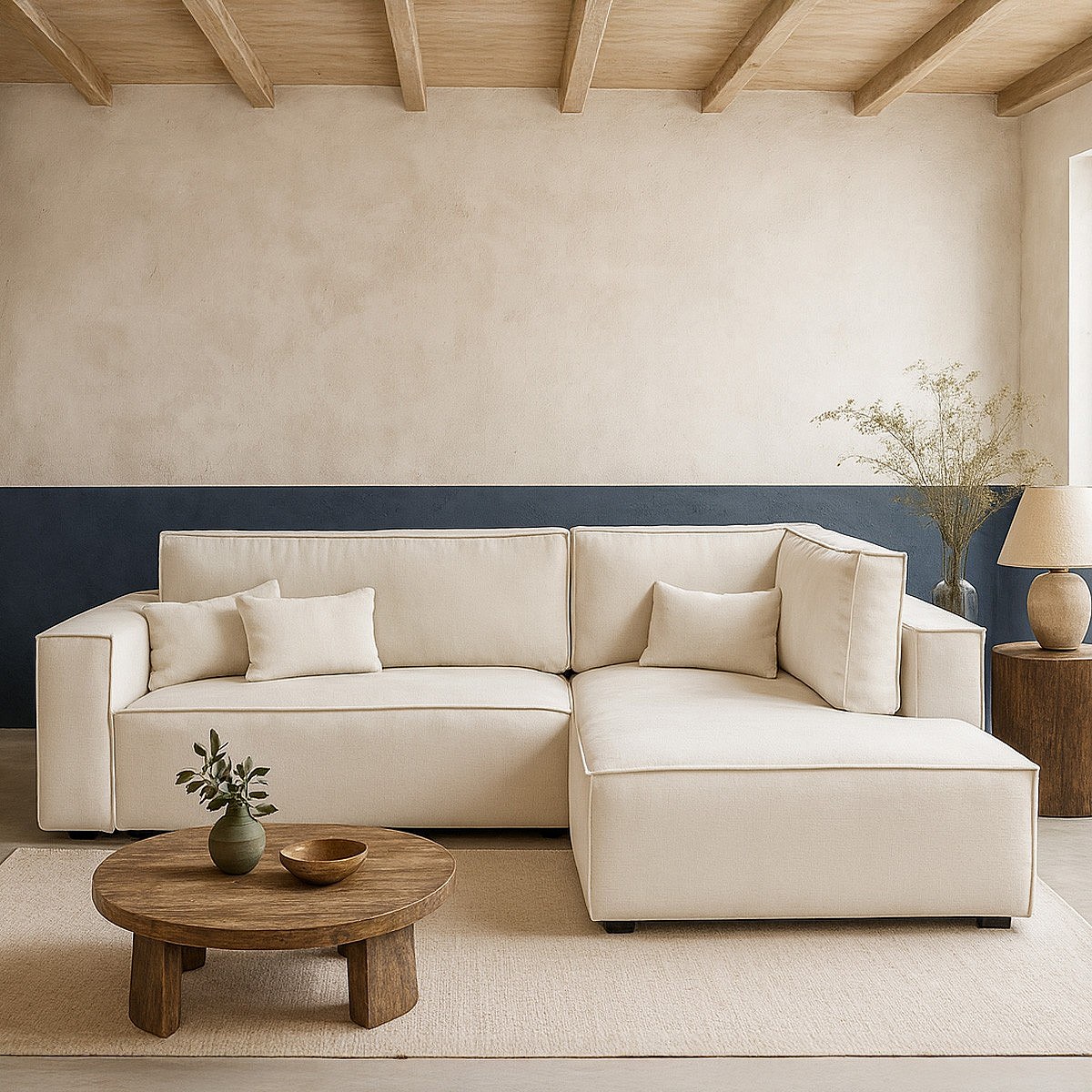 Canapé d'angle ouvert à droite convertible 3 places en tissu chenille beige - Emma