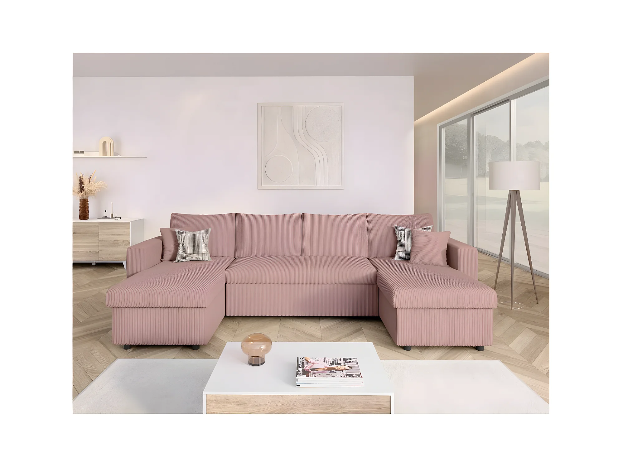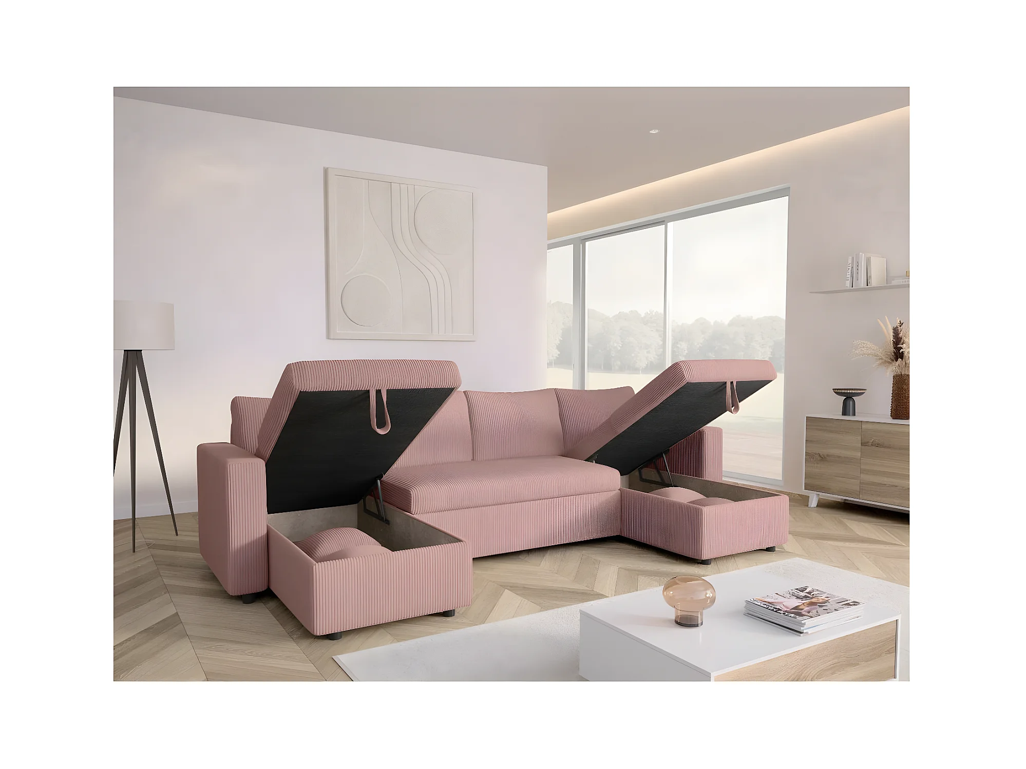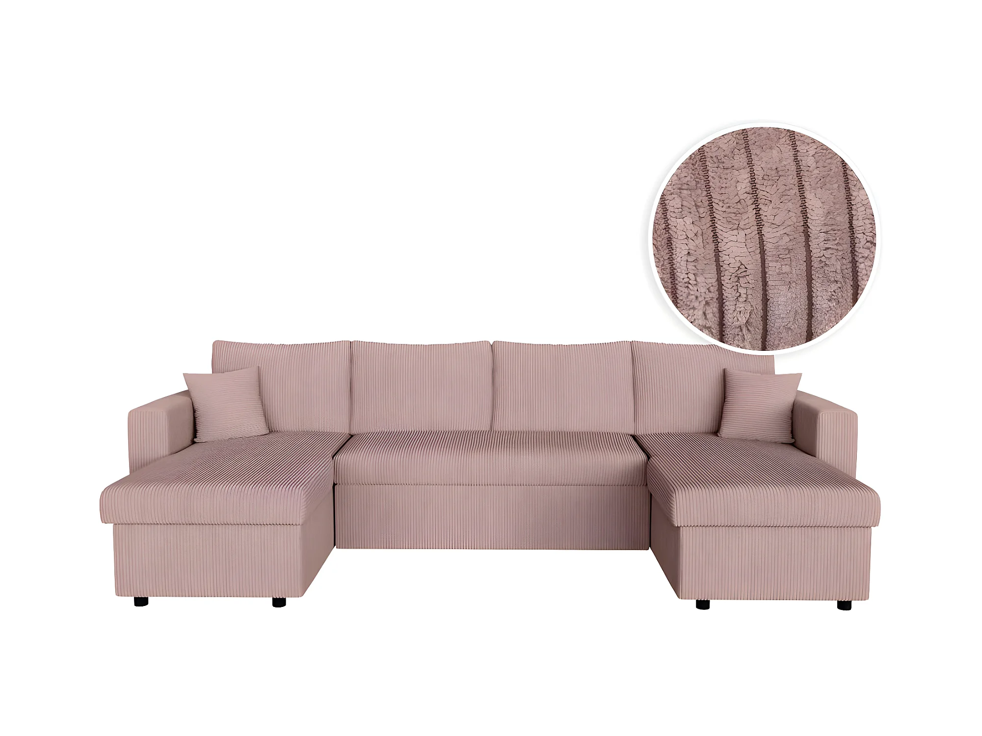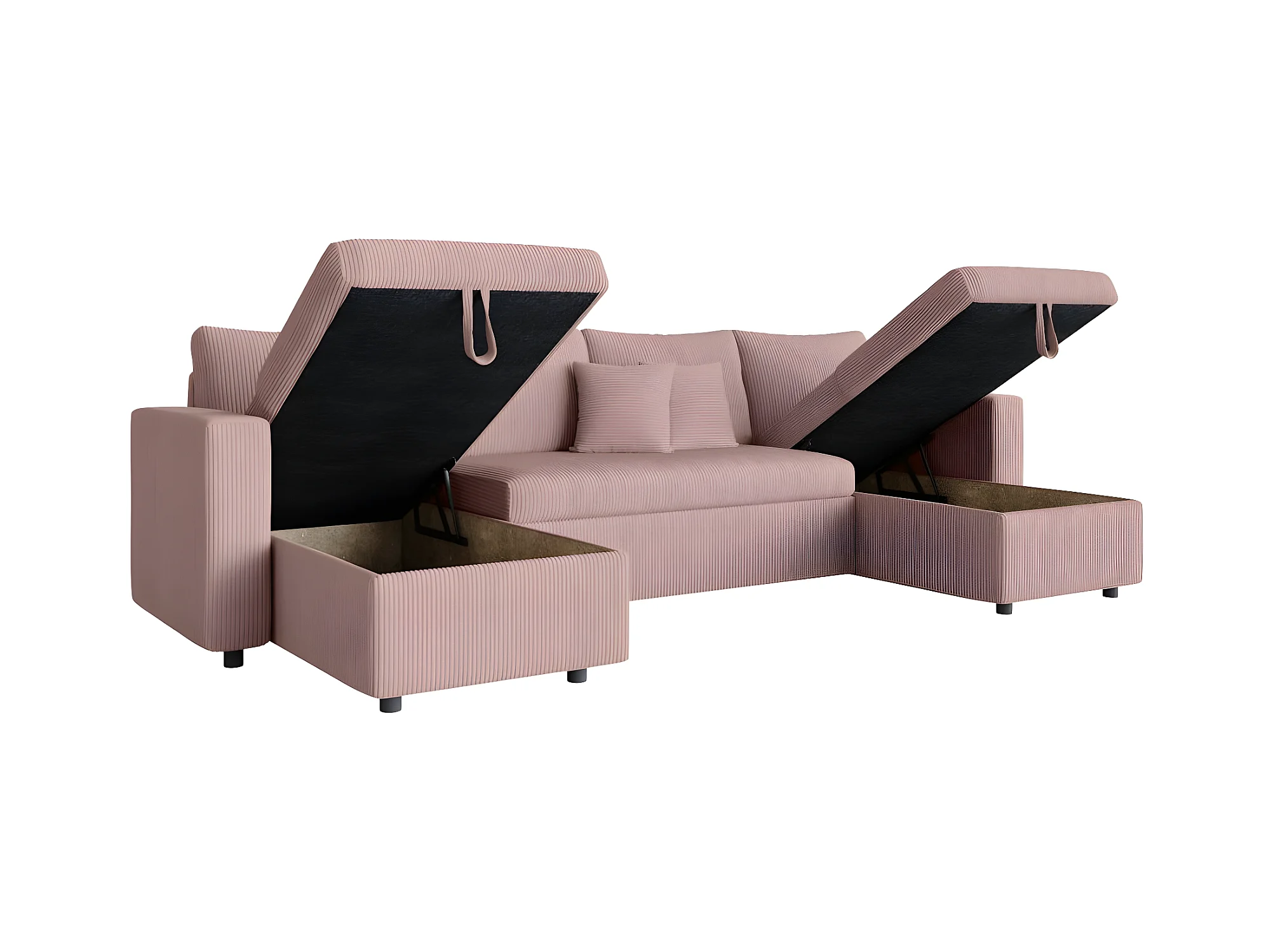 Canapé panoramique 6 places Maria convertible avec 2 coffres en velours côtelé - Rose - L295 x P146 x H81cm - Loungitude