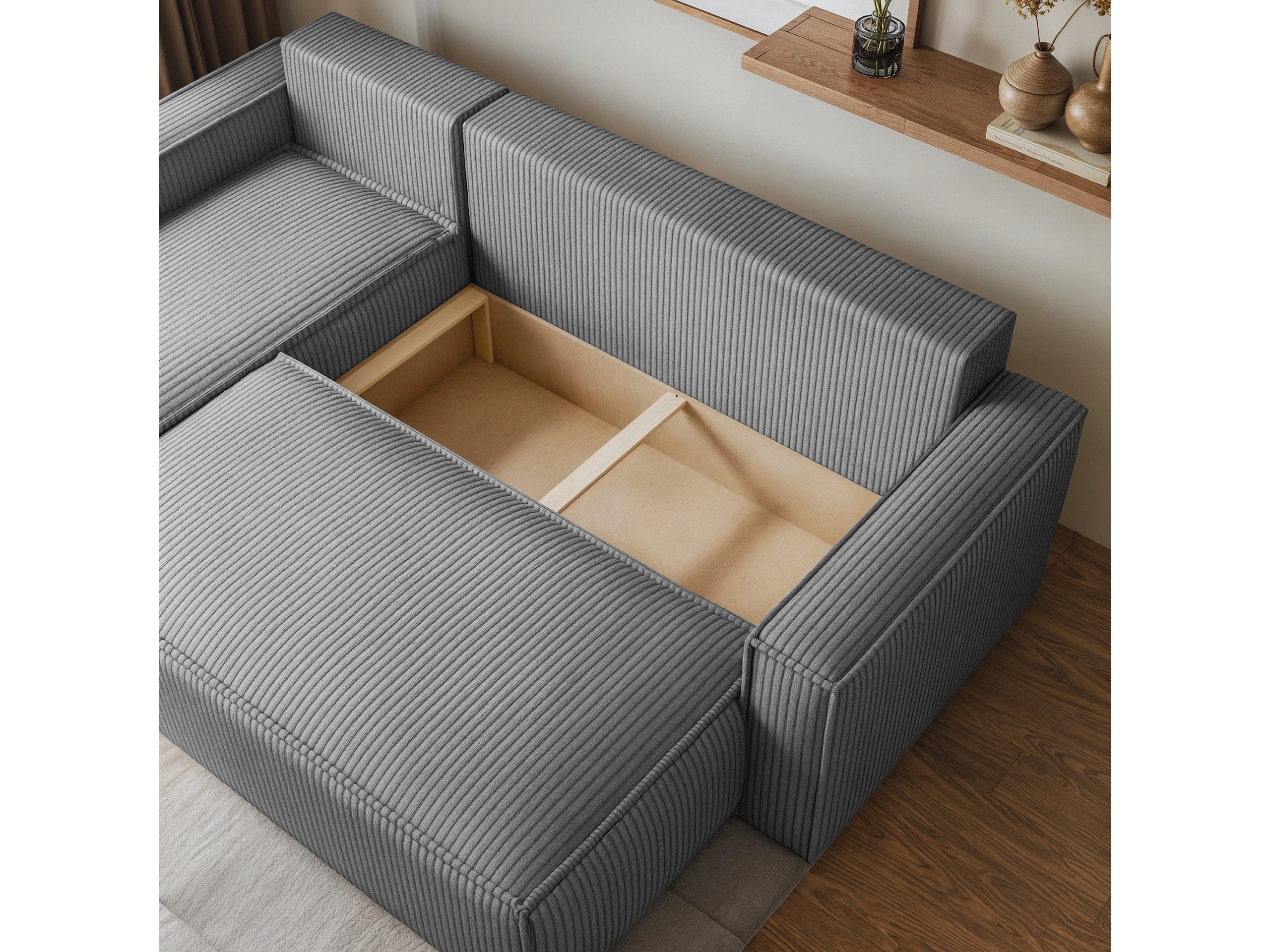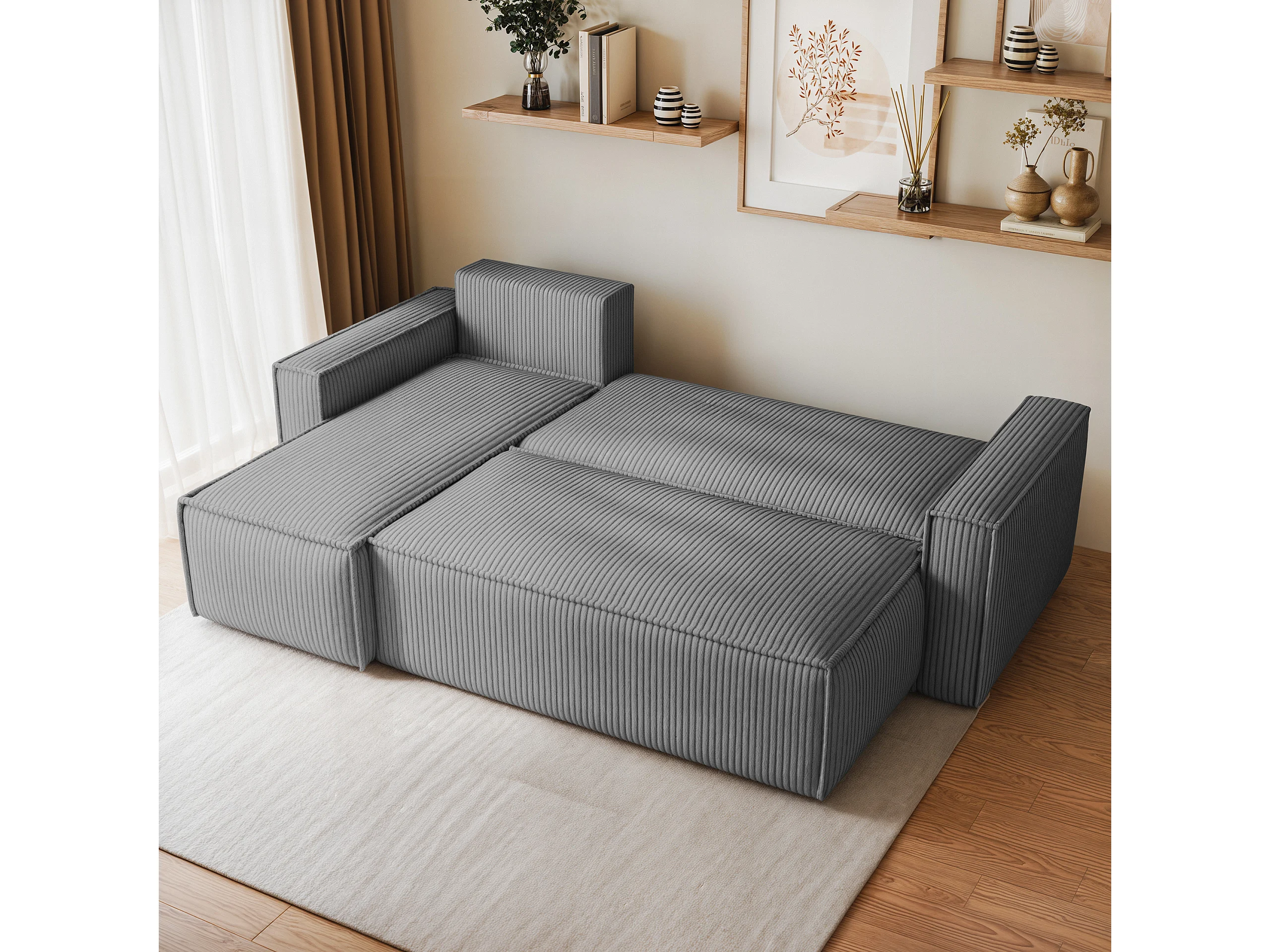 Canapé d'angle RAVELO Gris clair en velours côtelé avec fonction de couchage