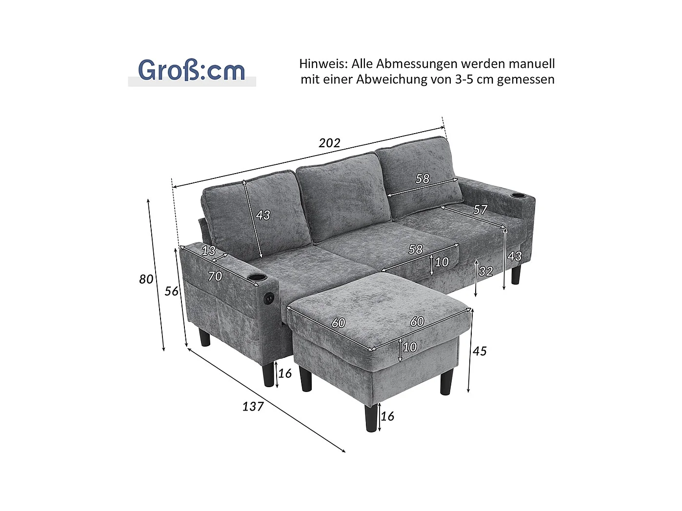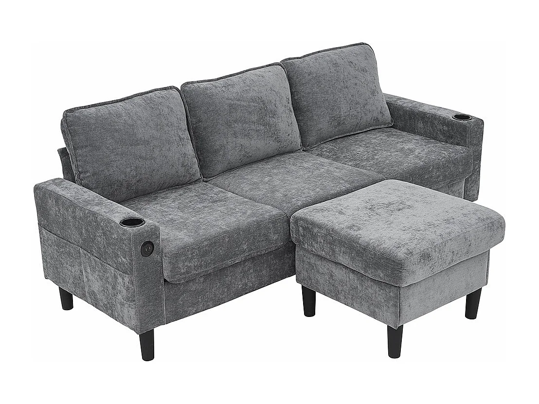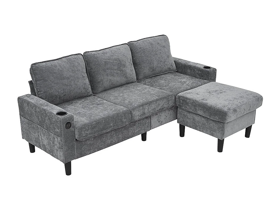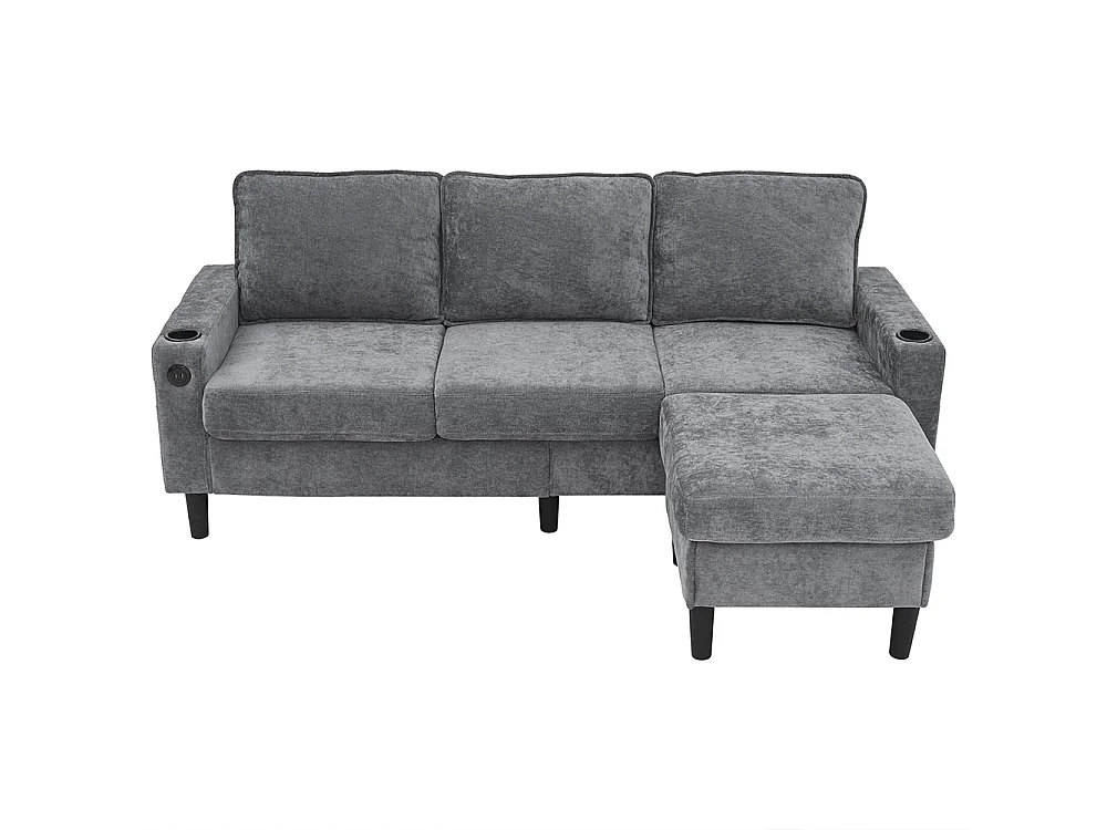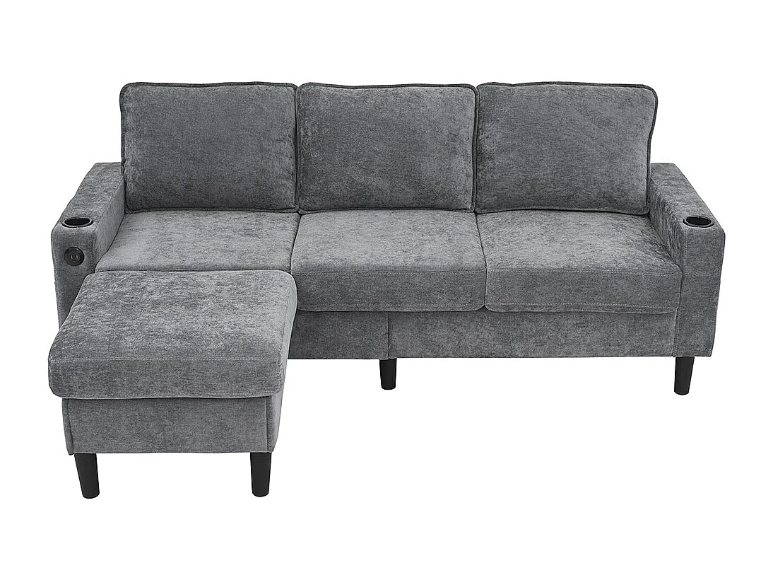 Canape d'angle rembourrés 3 places avec ports USB et Type-C avec deux porte-gobelets lin gris