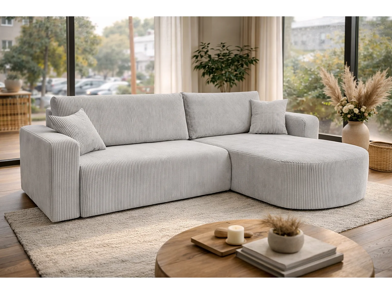 Canapé d'Angle réversible convertible avec fonction de couchage coffre universel en velours côtelé gris clair Kimo XL