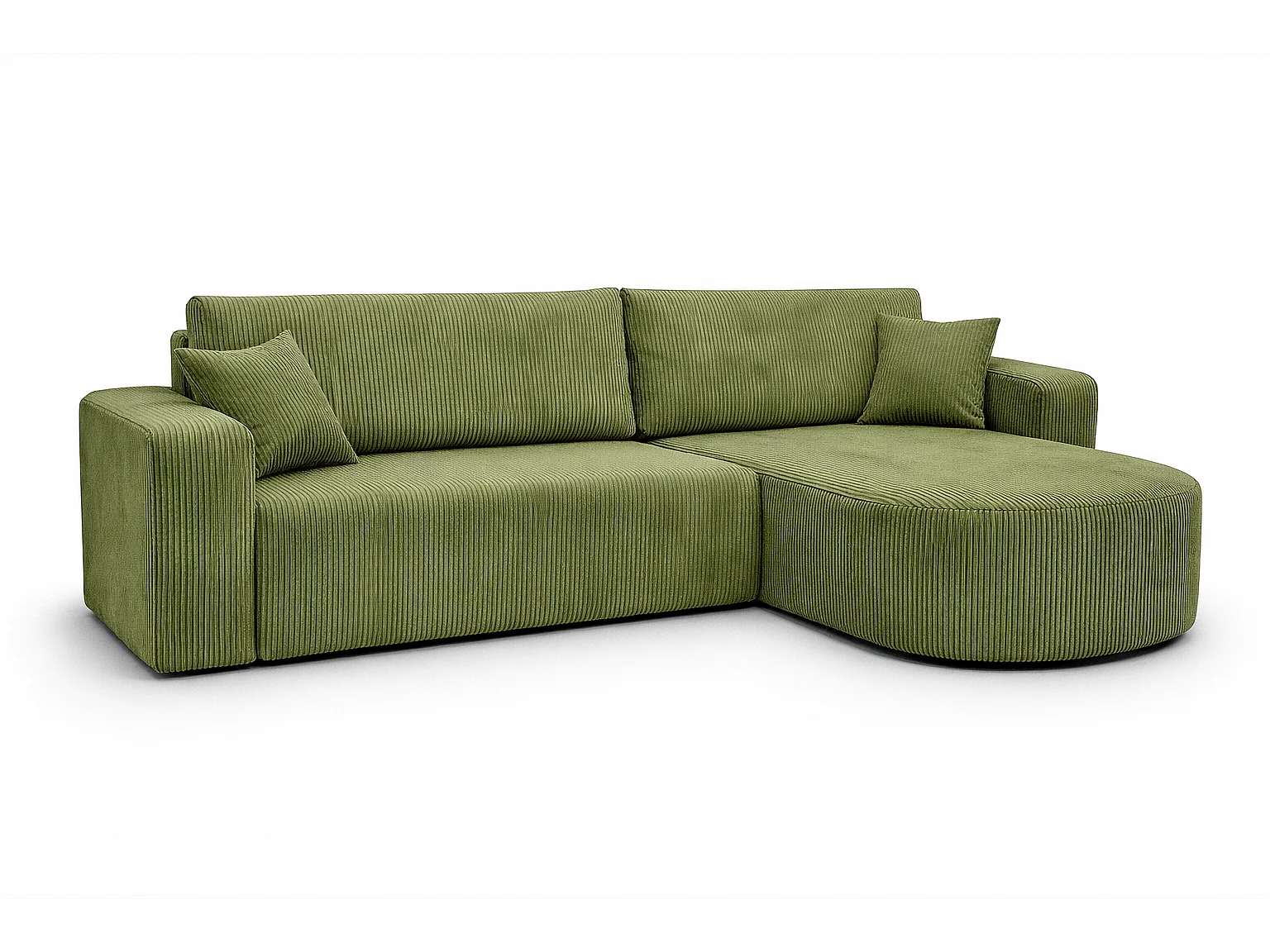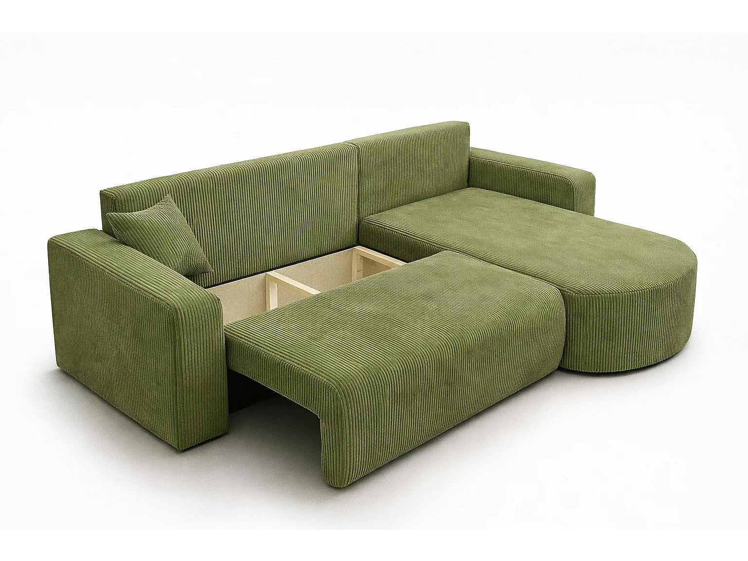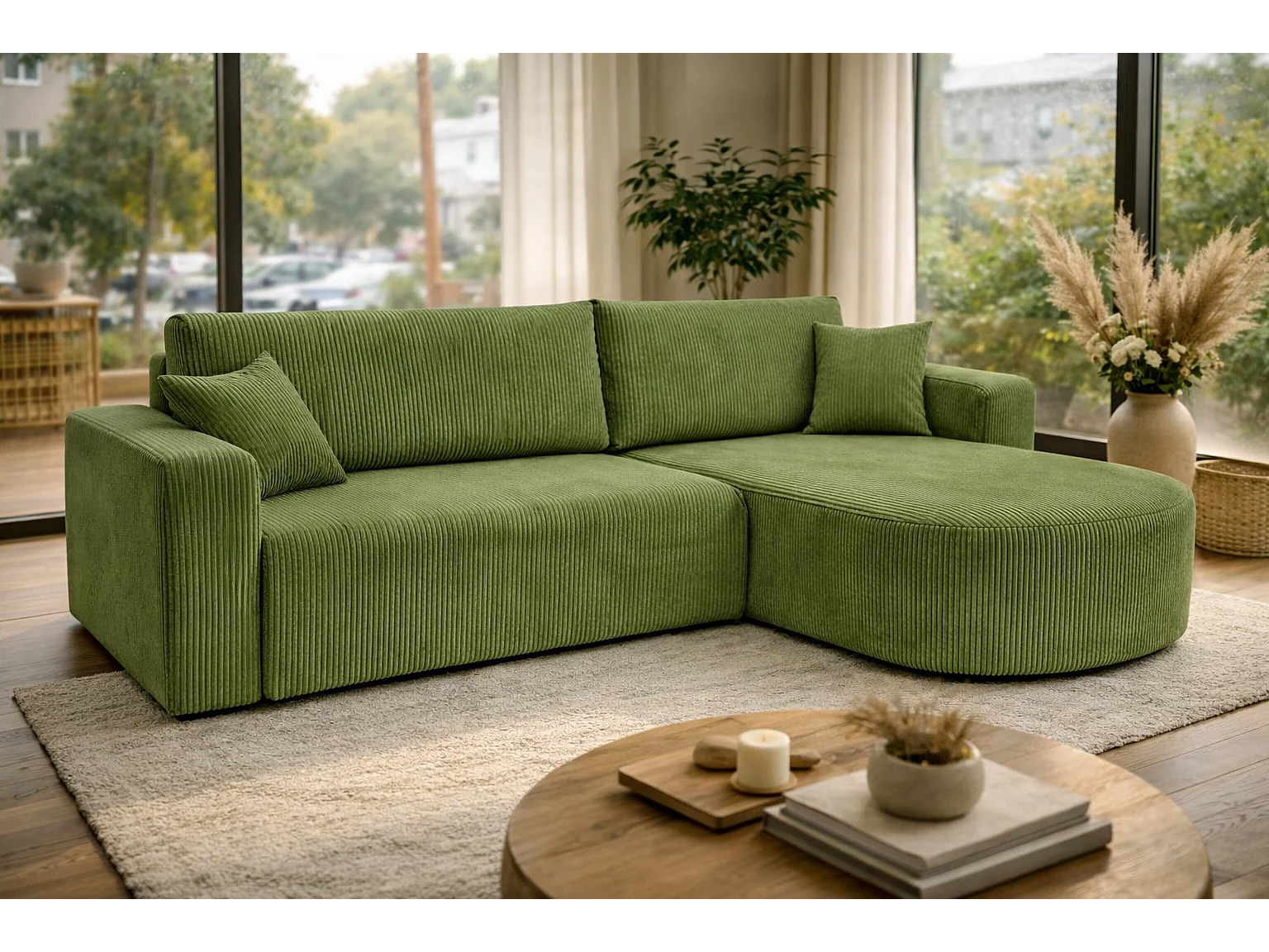 Canapé d'Angle réversible convertible avec fonction de couchage coffre universel en velours côtelé vert Kimo XL