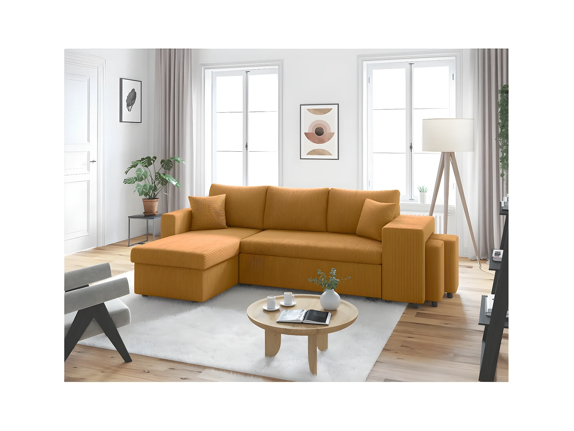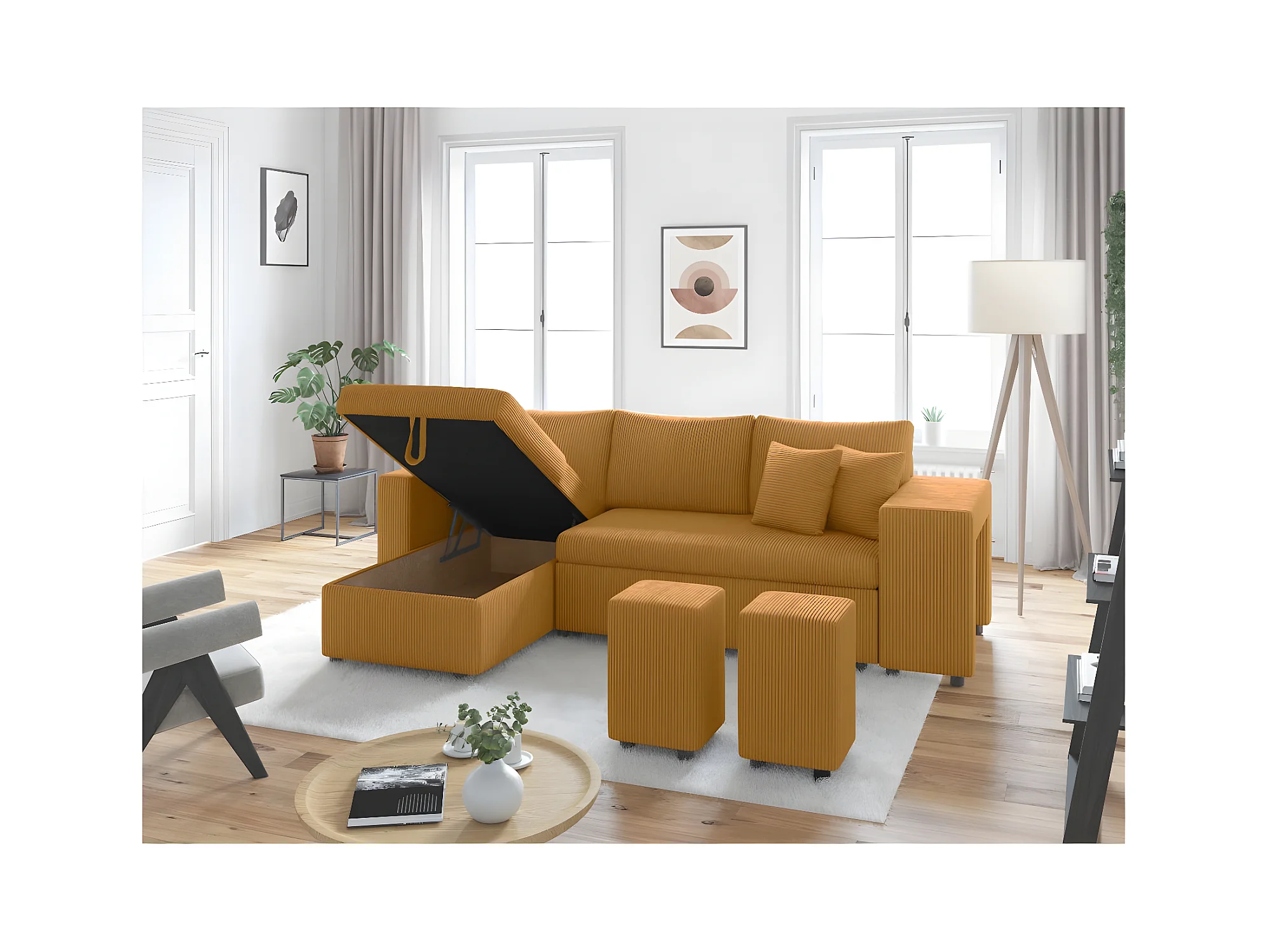 Canapé d'angle réversible convertible Oslo avec coffre, 2 poufs à droite en velours côtelé jaune - L241 x P146 x H81cm - Loungitude