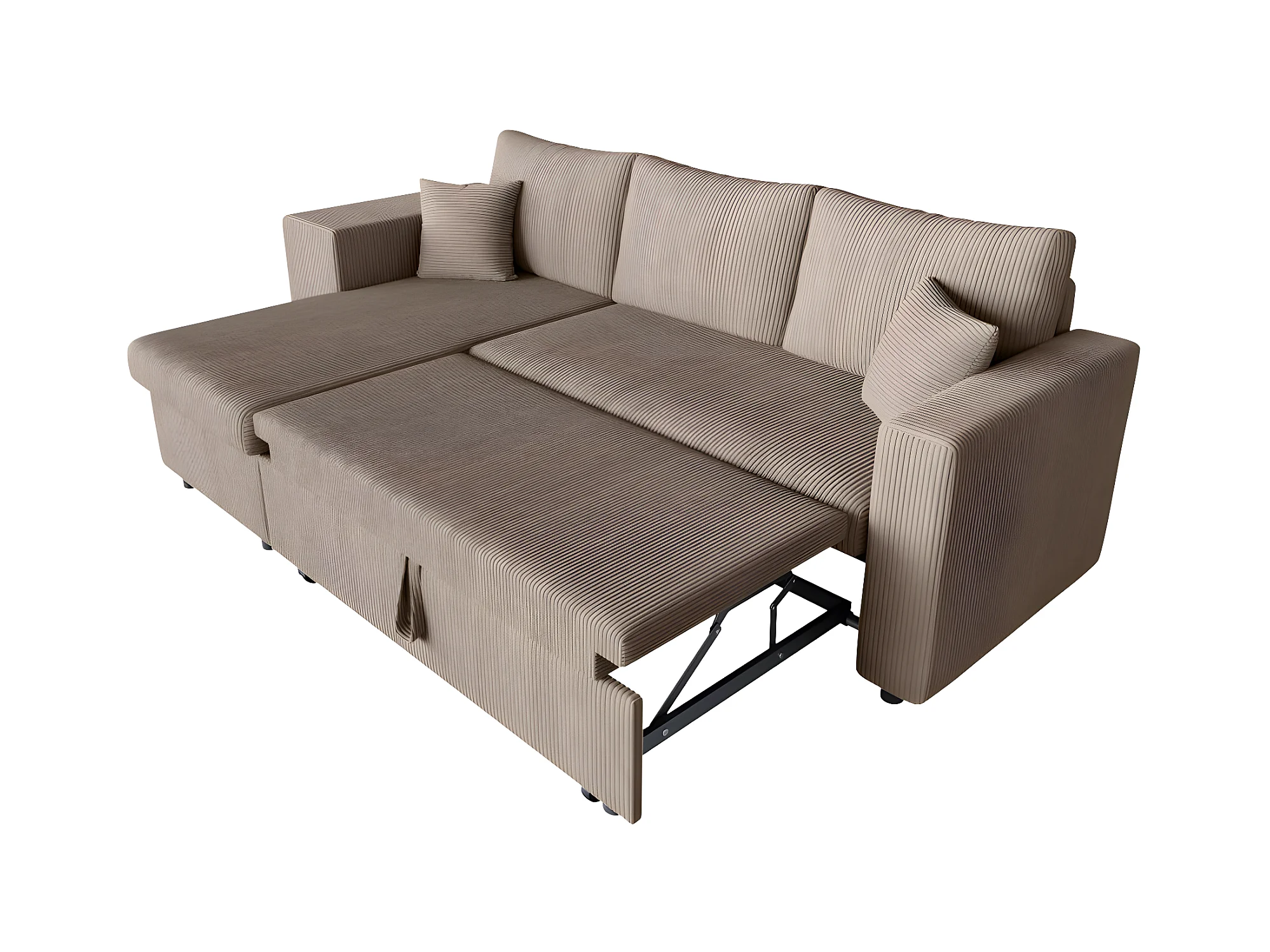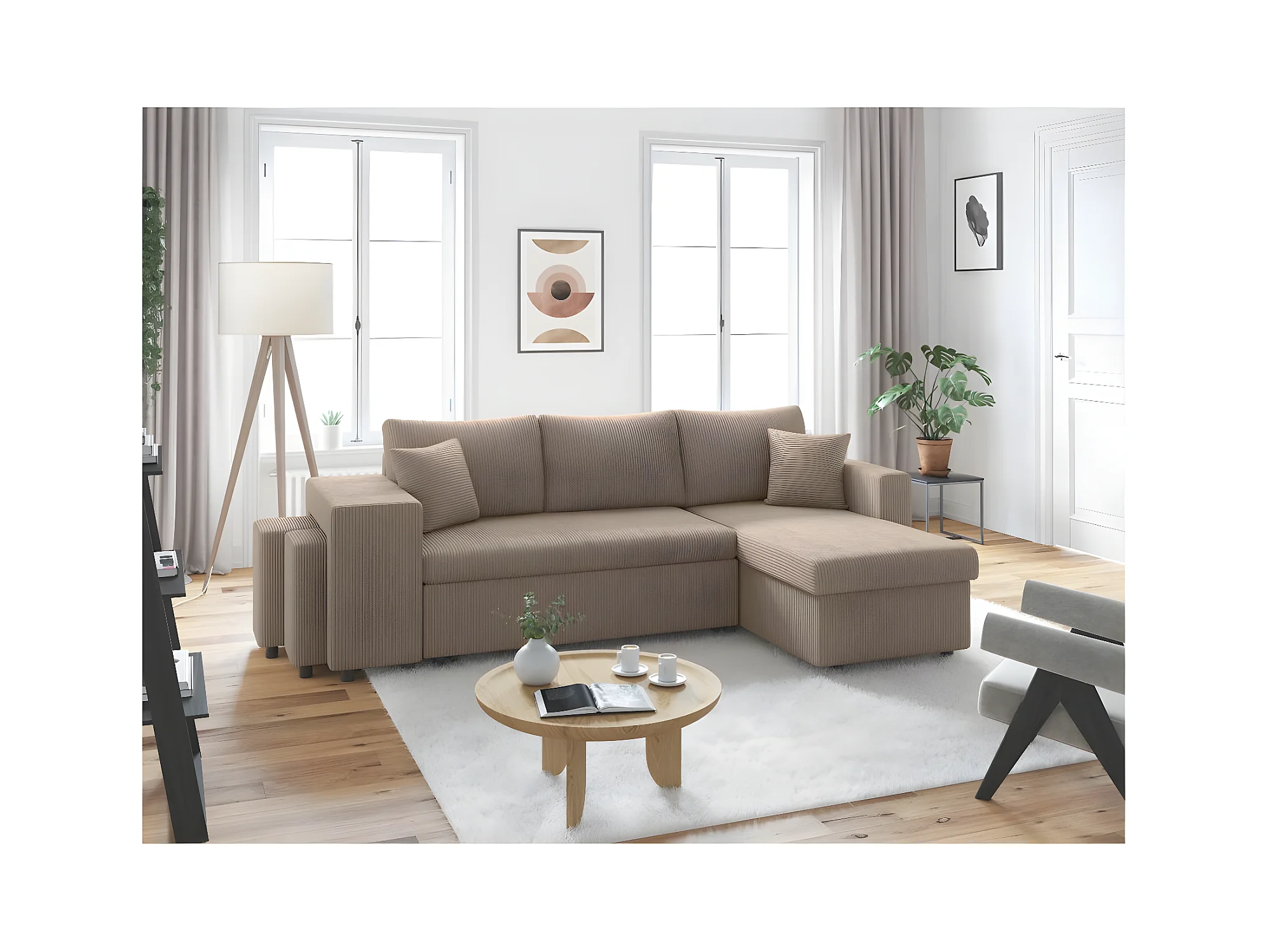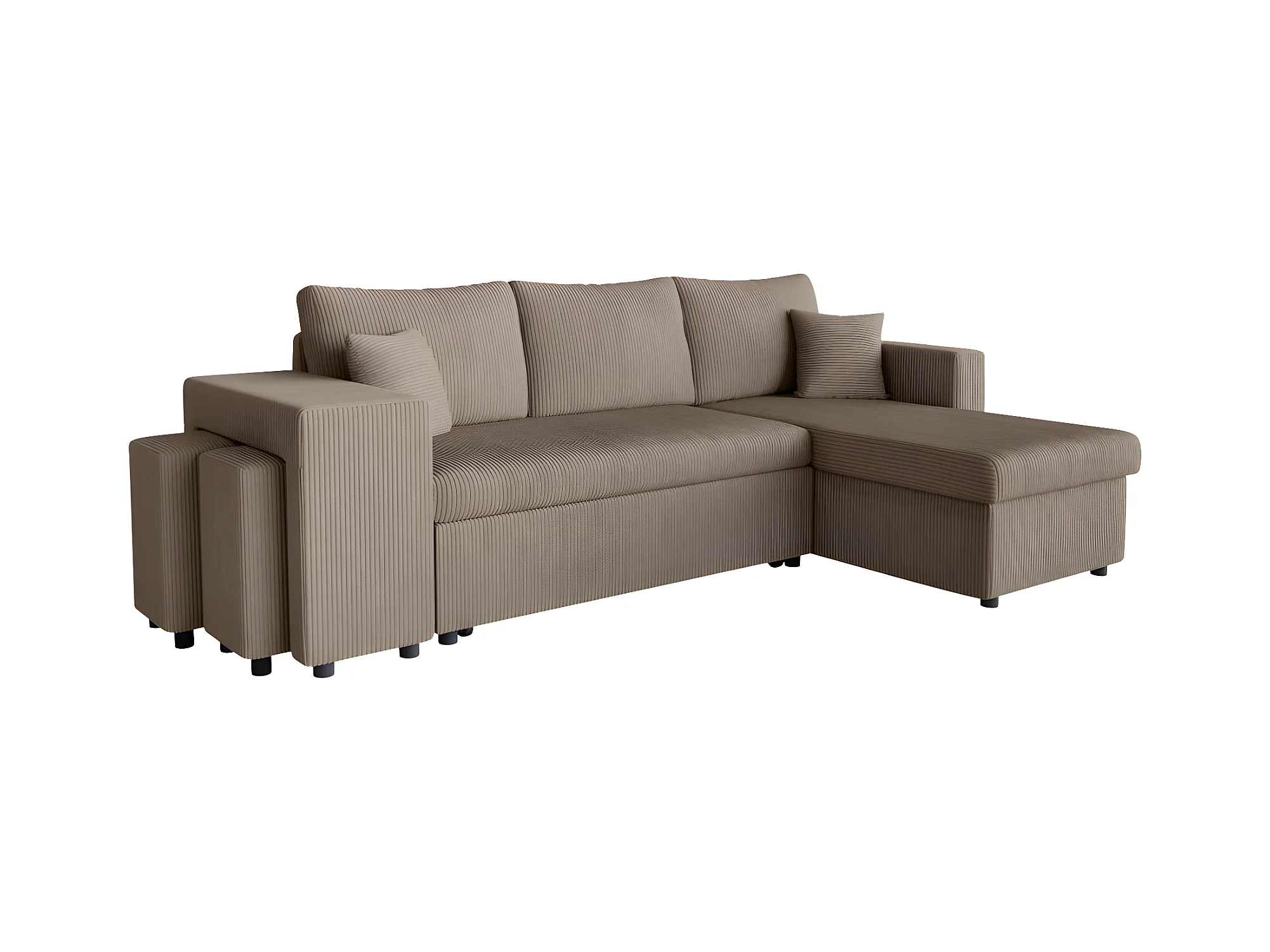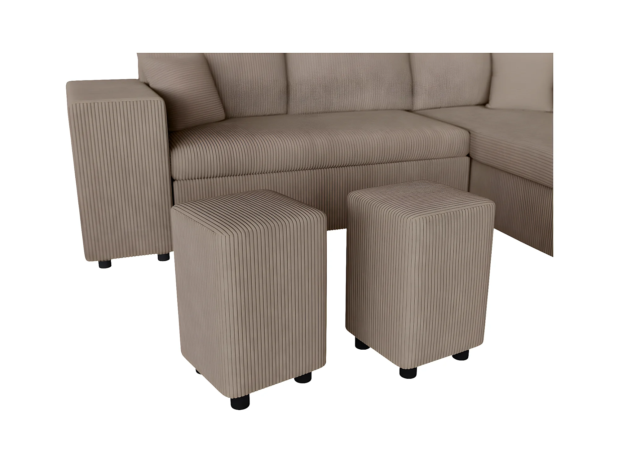 Canapé d'angle réversible convertible Oslo avec coffre, 2 poufs à gauche en velours côtelé taupe - L241 x P146 x H81cm - Loungitude