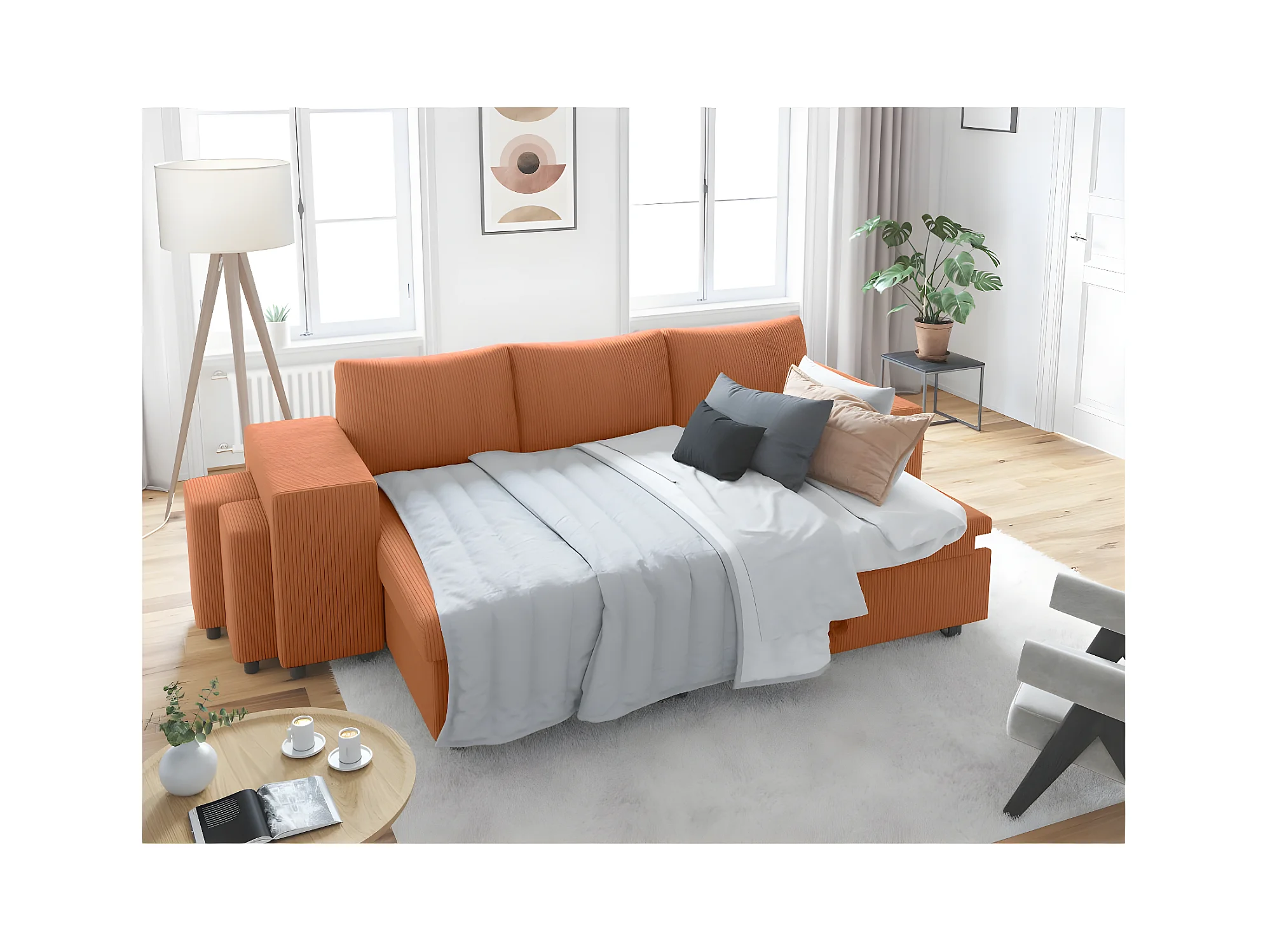 Canapé d'angle réversible convertible Oslo coffre 2 poufs à gauche en velours côtelé terracotta - L241 x P146 x H81cm - Loungitude