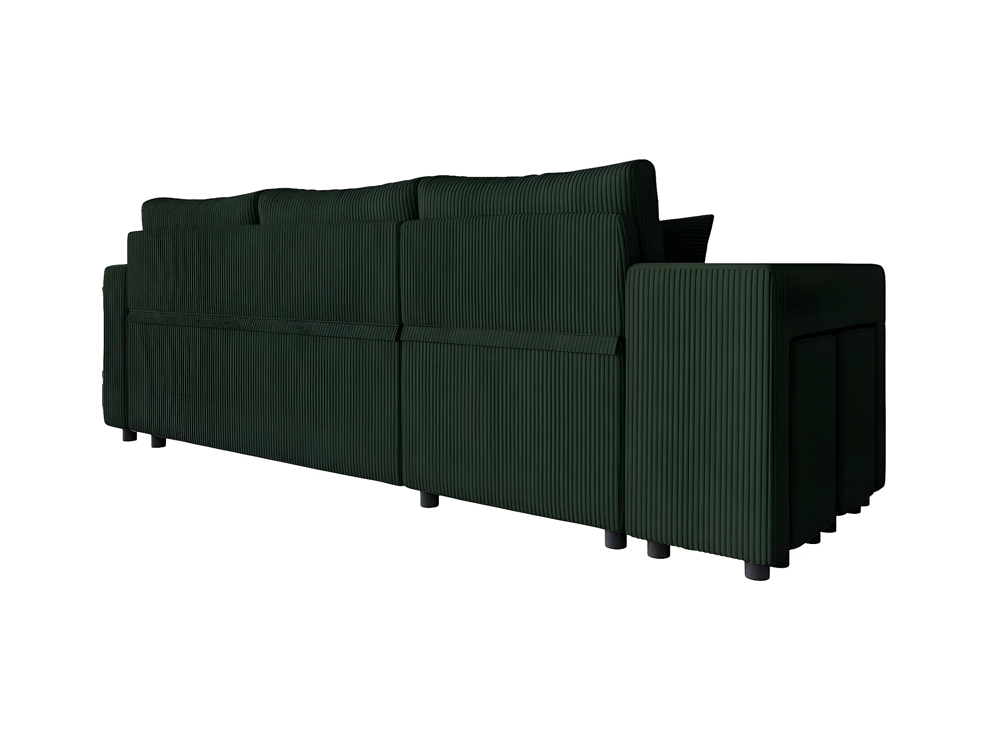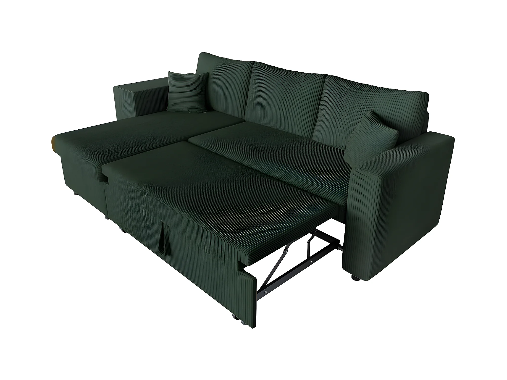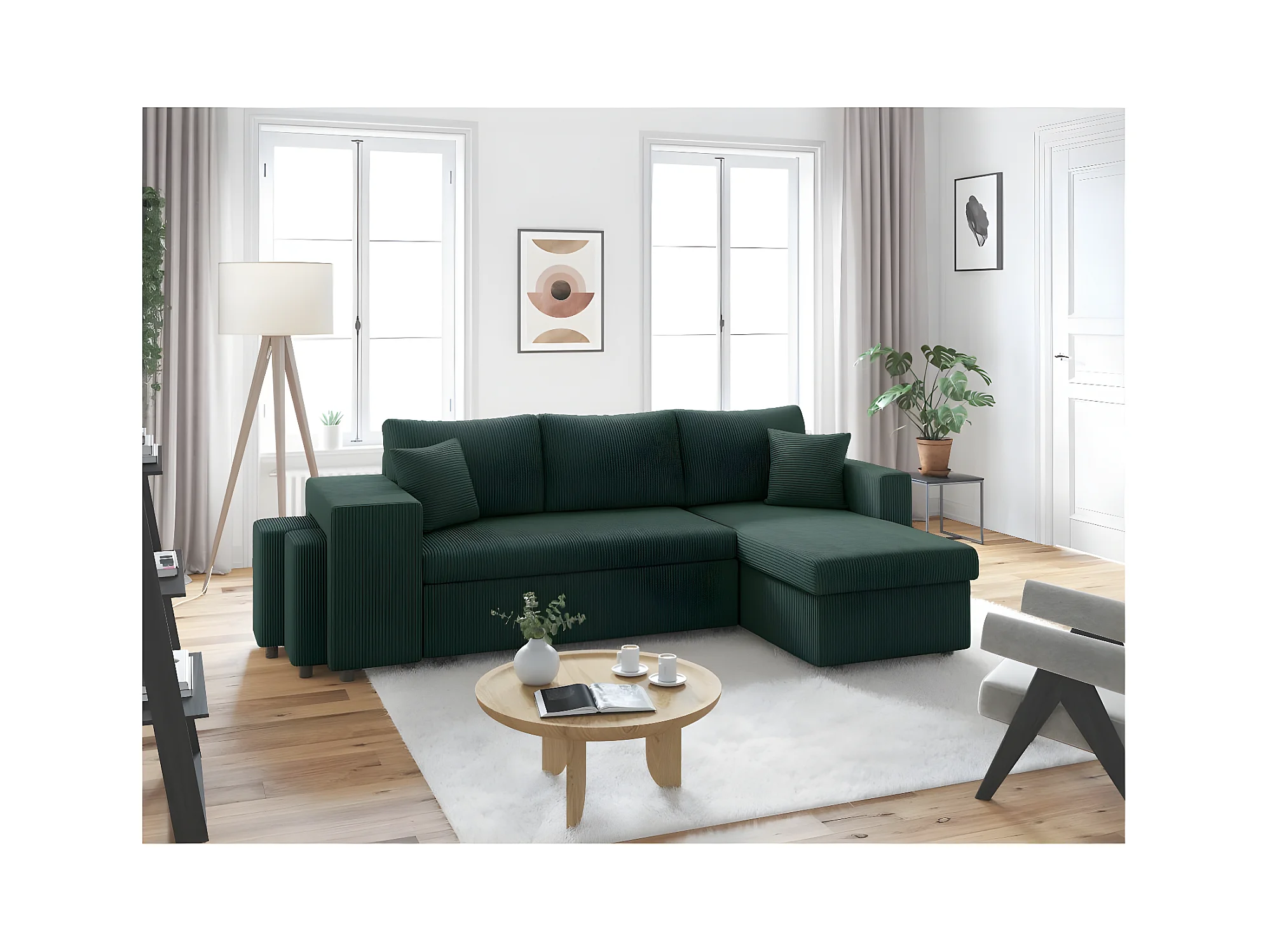 Canapé d'angle réversible convertible Oslo avec coffre, 2 poufs à gauche en velours côtelé vert - L241 x P146 x H81cm - Loungitude