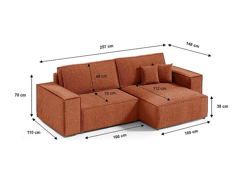 Canapé d'angle réversible et convertible 3 places avec coffre Isaac Mini velours côtelé Orange brique