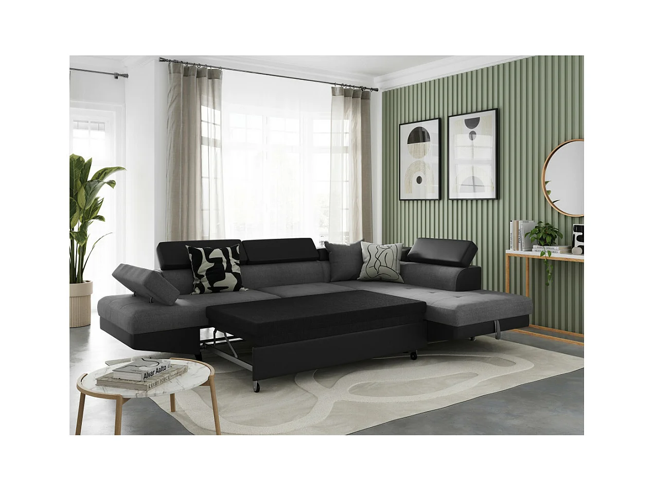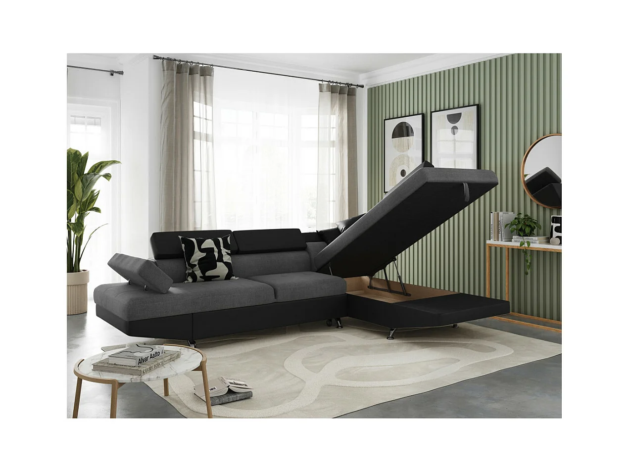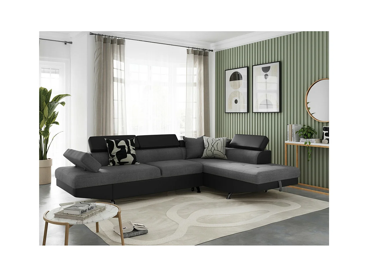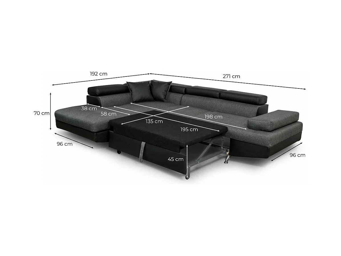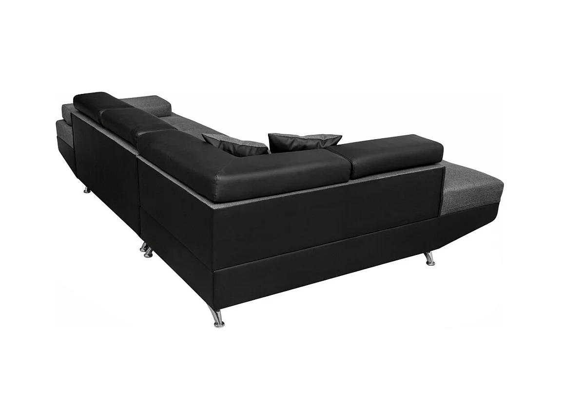 Canapé d'angle droit 5 places Rio Convertible avec coffre en tissu et simili - Gris/Noir - L271 x P192 x H70cm - Loungitude